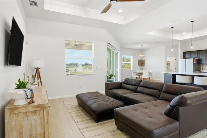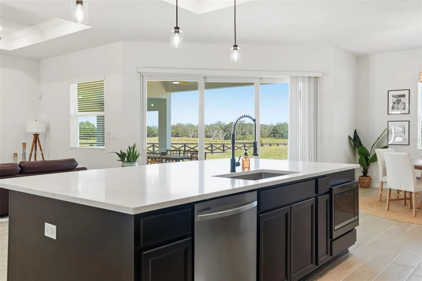 Gorgeous warm earth tones!! All the newest sleek modern finishes on the inside with a calming country feel! 2,252 sq ft living space; 2,225 square feet total under roof!! High 10′ ceilings throughout the home with tray ceilings in every room! Large glass sliders and windows with the high ceilings and open floor plan make the home feel light, bright, and very spacious! GORGEOUS VIEWS OF THE PASTURES and BACKYARD!! STUNNING upgraded kitchen with all gorgeous Quartz countertops (this kitchen is truly the focal point of this home and open to the large family room and dining area), gorgeous real wood shaker cabinets, upgraded stainless steel appliances with stainless steel range hood!! Check out the ENORMOUS pantry!! Walk into the grand entrance of the home and enter the double doors into the impressive foyer and formal living room with expansive glass sliders that look out over the lanai and backyard – it’s impressive just walking in!! The EXTRA large master suite will lure you into your own private retreat – with a spa-like ensuite master bathroom with high ceilings + a large walk-in closet + impressive walk-though shower with frameless glass, multiple shower heads and rain forrest shower head + dual sinks + Quartz countertops! 2nd and 3rd bathrooms have matching upgraded finishes and the 3rd bathroom is an ensuite bathroom to the 3rd bedroom!! The triple glass sliders open to the covered lanai — add a pool to this already beautiful outdoor living space!!