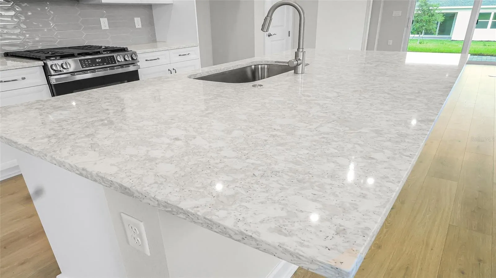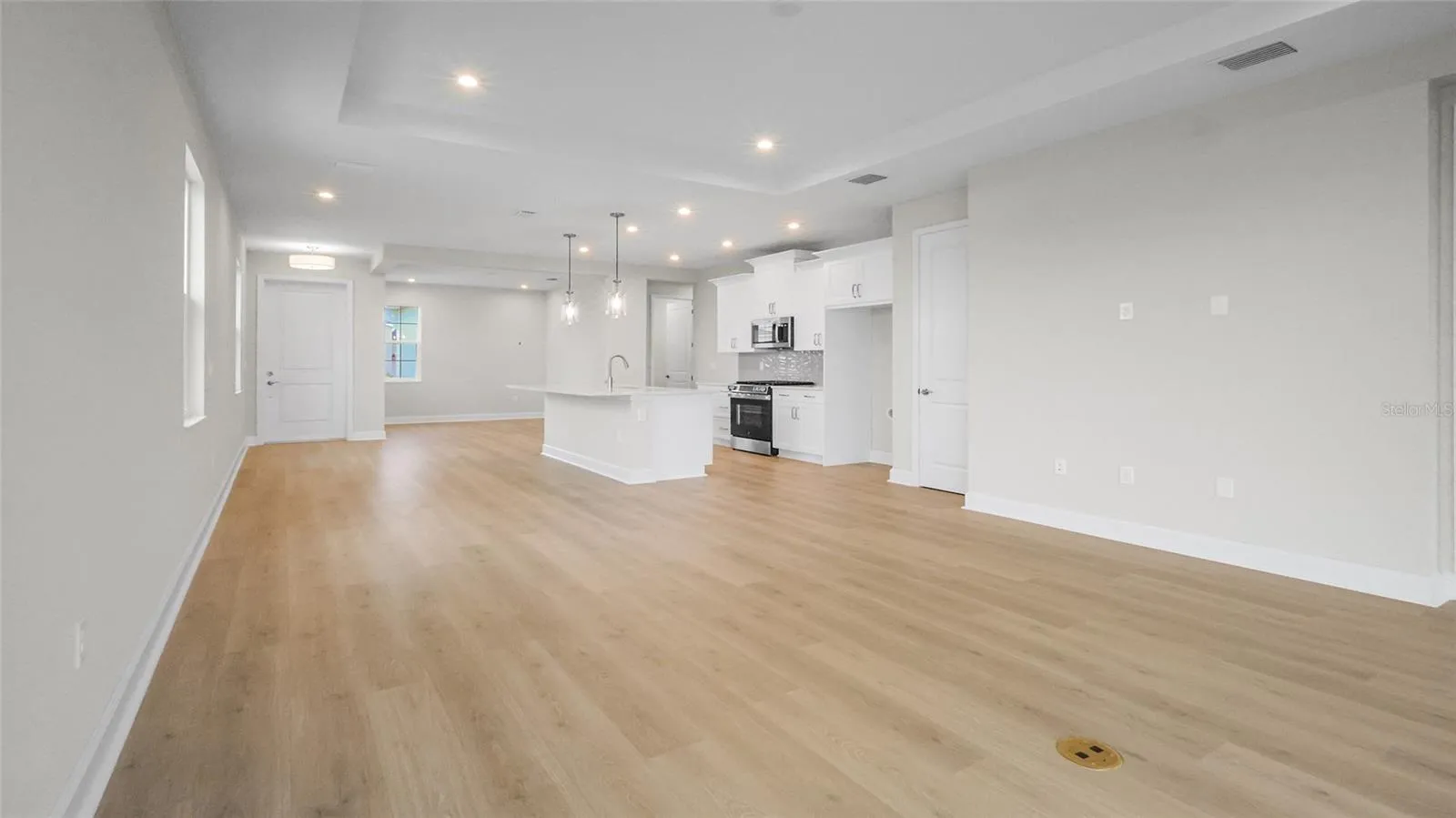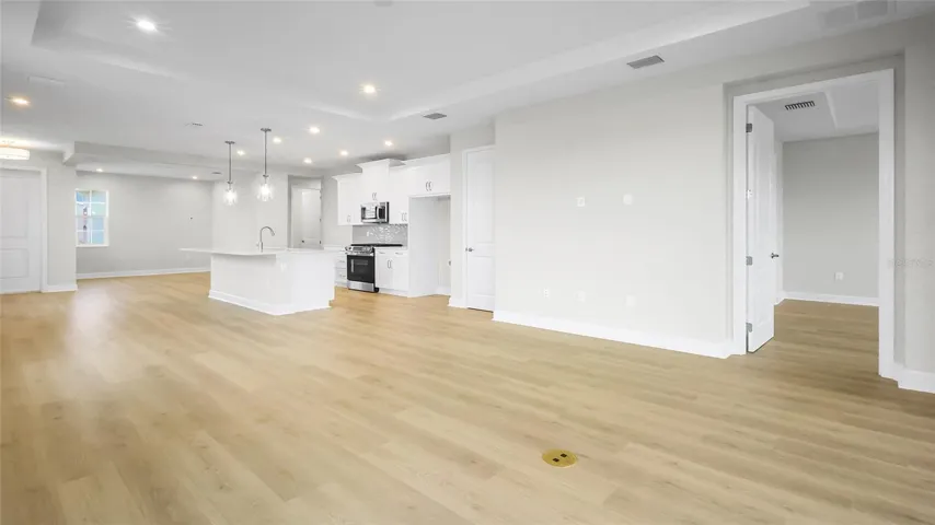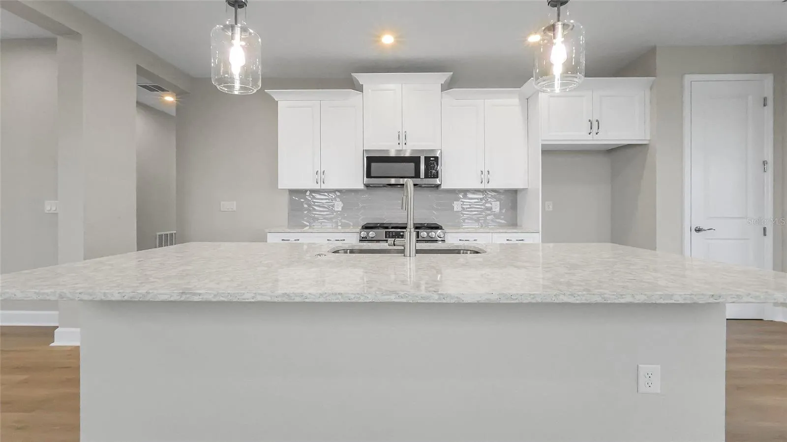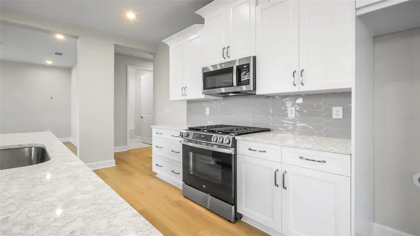 As you arrive, the inviting front porch offers charming curb appeal and a tranquil space to welcome guests or relax outdoors. Step inside to experience an open-concept design, where luxury vinyl plank flooring flows seamlessly throughout the main living areas, providing both durability and on-trend style. The centerpiece of this home is the chef-inspired kitchen, outfitted with frameless European-style cabinets, a deep cabinet above the refrigerator, expanded pot and pan drawer storage, and upgraded large cabinet crown molding. Home chefs will love the upgraded slide-in natural gas range, luxury 3cm quartz countertops, and artisan tile backsplash, creating the perfect environment for meal preparation and entertaining. The large kitchen island connects effortlessly to the Great Room, fostering a sense of unity and allowing for easy gatherings with friends and family.