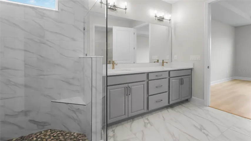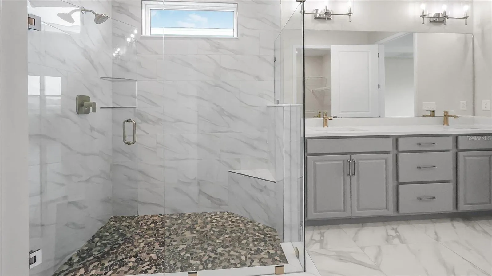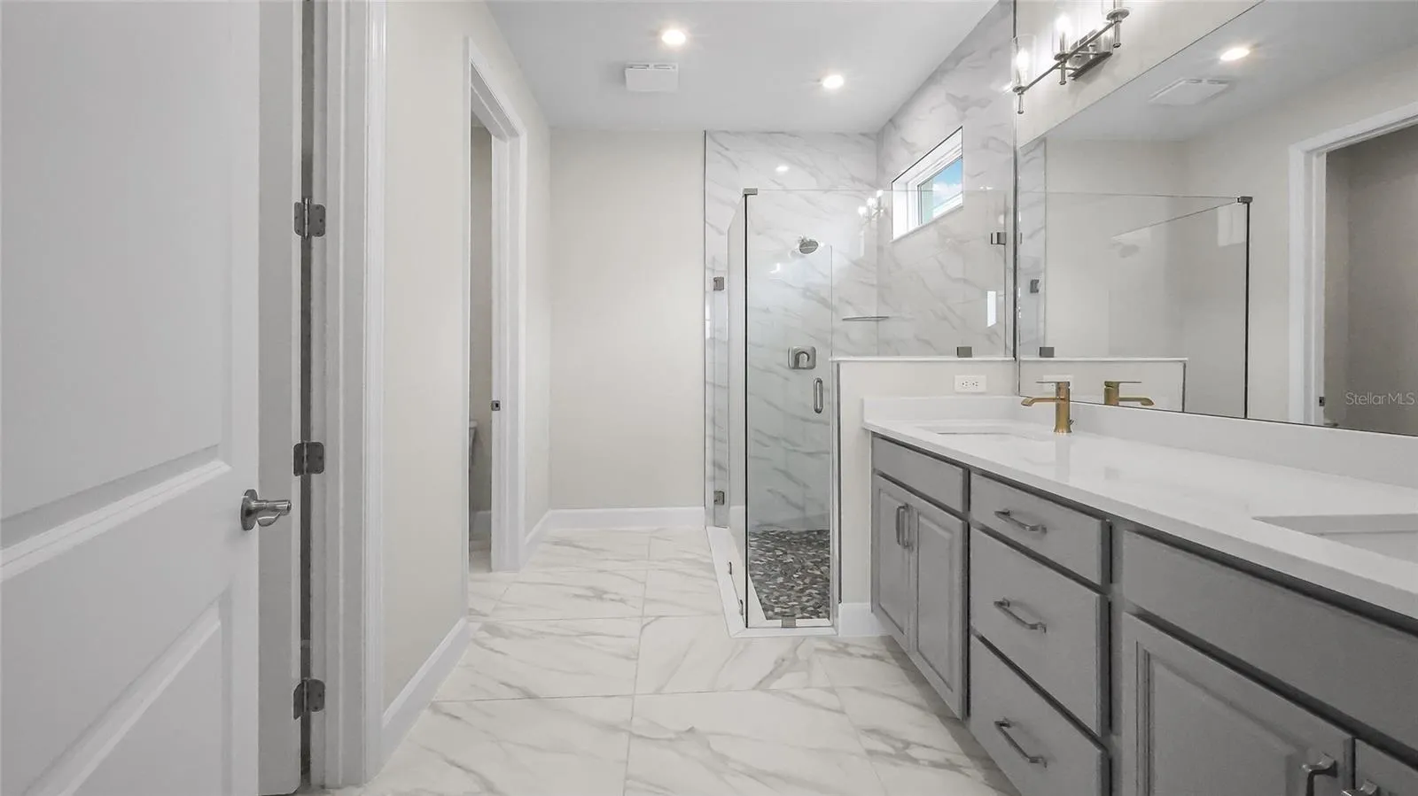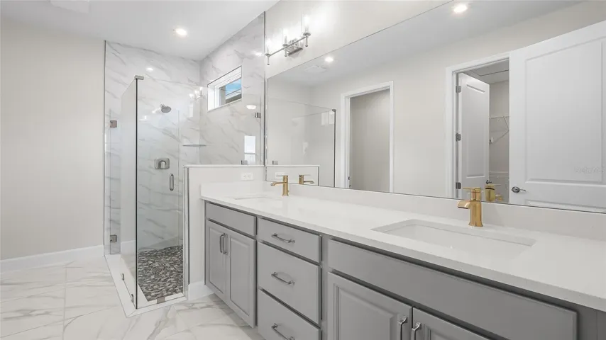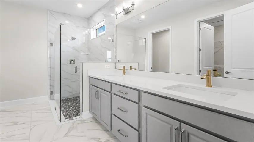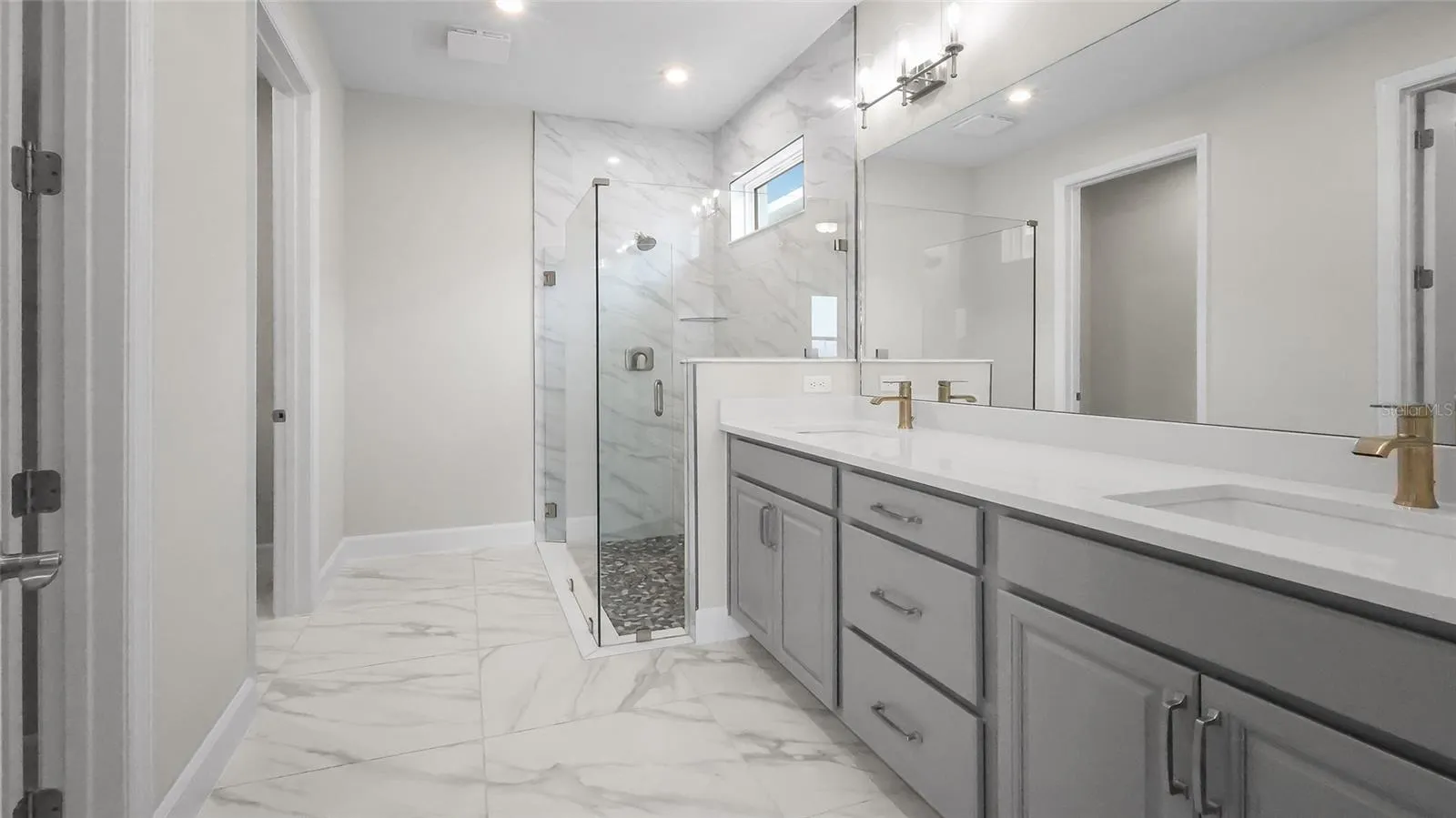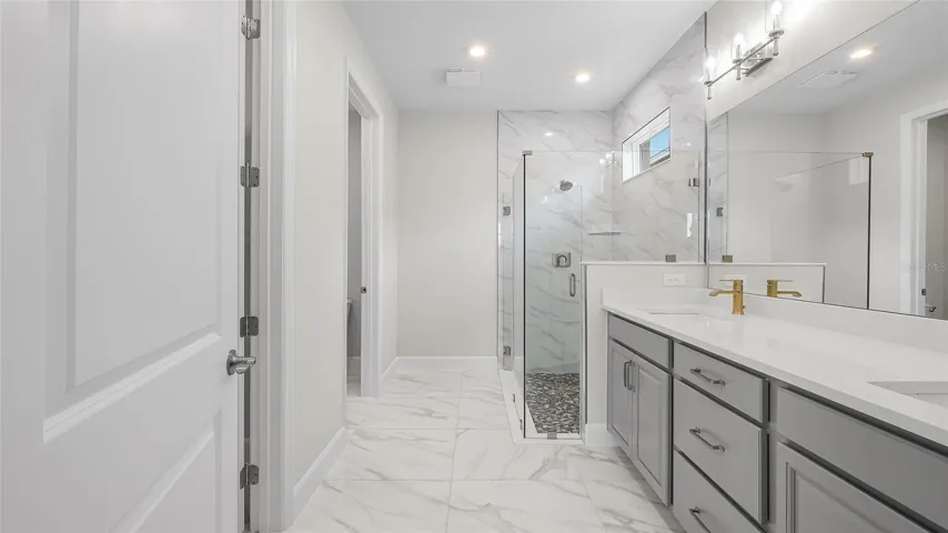 The thoughtfully designed split-bedroom layout ensures privacy for both the owner’s suite and the secondary bedroom, making this floor plan perfect for families, couples, or those who frequently host guests. The owner’s suite is a peaceful retreat, featuring an expansive closet and a luxurious bathroom with a frameless shower enclosure, upgraded pebble tile shower floor, and brushed nickel plumbing fixtures. Tile-to-ceiling showers and high-quality materials in both bathrooms add an extra touch of sophistication and comfort.