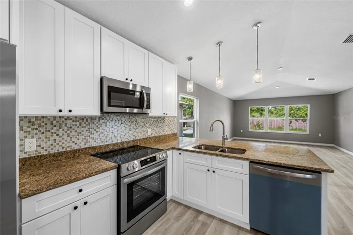 One or more photo(s) has been virtually staged. Experience your personal paradise in this breathtaking, BRAND NEW, never-before-lived-in home that exudes charm and elegance. This home boasts luxurious and economical upgrades, including impact windows, smart home technology (featuring appliances, a thermostat, and a smart home network). Additionally, you’ll enjoy and be wowed by the exceptional energy efficiency thanks to the added home appliances and insulation… this home truly has it all! Imagine hosting friends and family in the seamless open floor plan that perfectly lends itself to entertaining. The living room is bright and airy, with its vaulted ceiling and abundant windows, inviting in natural light to create a warm and welcoming atmosphere. In the kitchen, you will discover top-of-the-line appliances, sleek granite countertops, a functional and beautiful eat-in island, and a spacious walk-in pantry— it’s truly a chef’s dream come true! Convenience is at your fingertips with a centrally located laundry room equipped with a new stackable washer and dryer, as well as a generous walk-in closet. The dining room, also featuring a vaulted ceiling and plenty of sunlight, enhances the open and inviting space. Your guests will appreciate the thoughtfully situated guest room, complete with an ensuite Jack and Jill bathroom that guarantees both comfort and privacy. Retreat to the expansive primary bedroom at the back of the home, boasting a large walk-in closet and an ensuite bathroom with granite countertops and a luxurious walk-in shower. Step outside to your private side and backyard, with a privacy barrier fence for added seclusion—it’s an ideal setting for outdoor relaxation and entertaining, creating your very own urban oasis. This incredible home is waiting for you to make it your sanctuary! Is this the perfect match you’ve been searching for? Schedule your private showing today and take the first step toward turning this dream into your reality! SELLER OFFERING $10,000 TOWARDS CLOSING COSTS AND SPECIAL INTEREST RATES