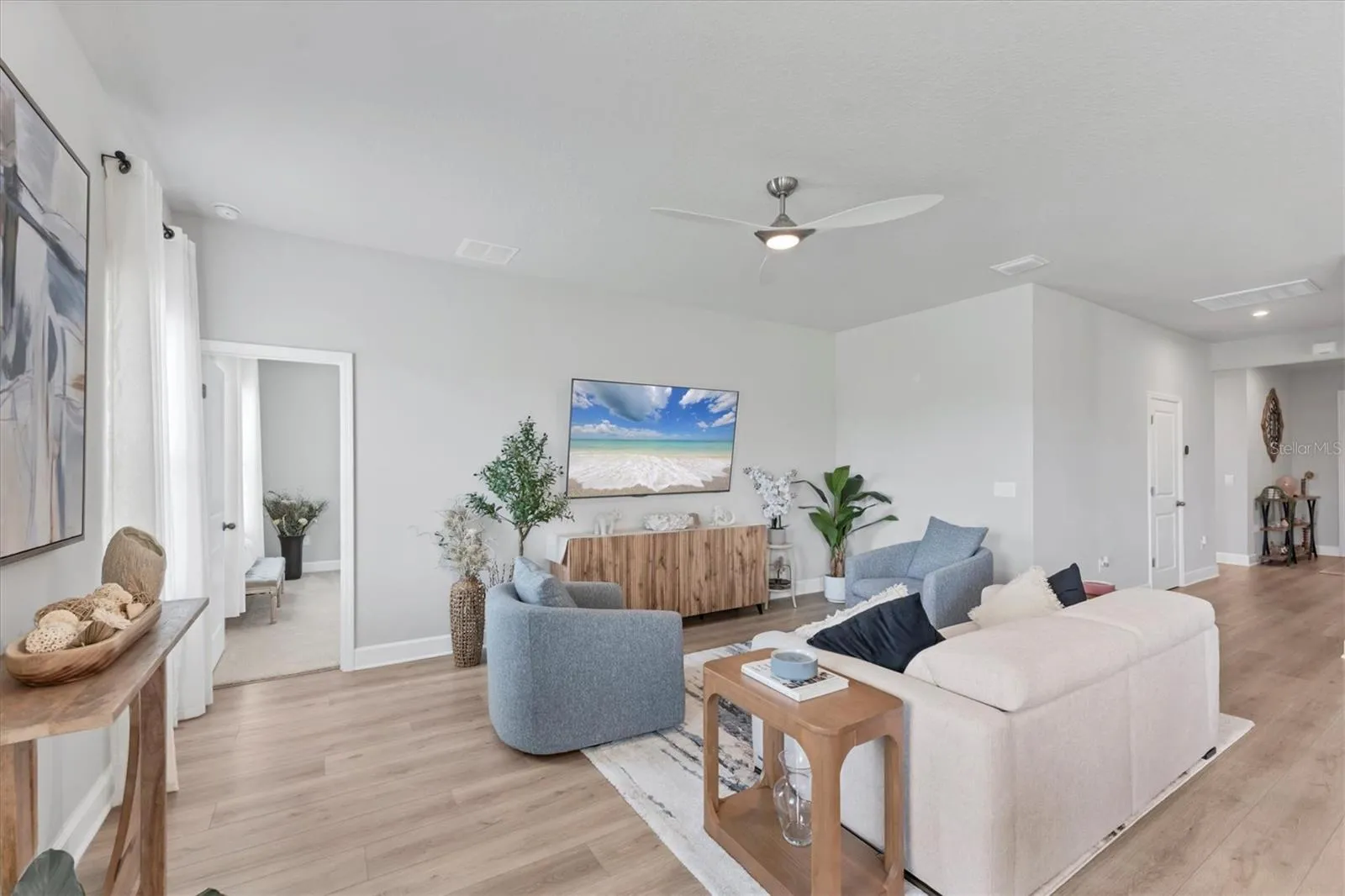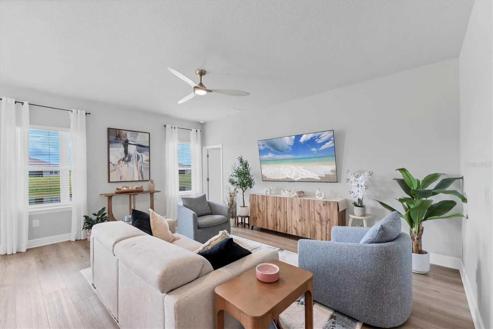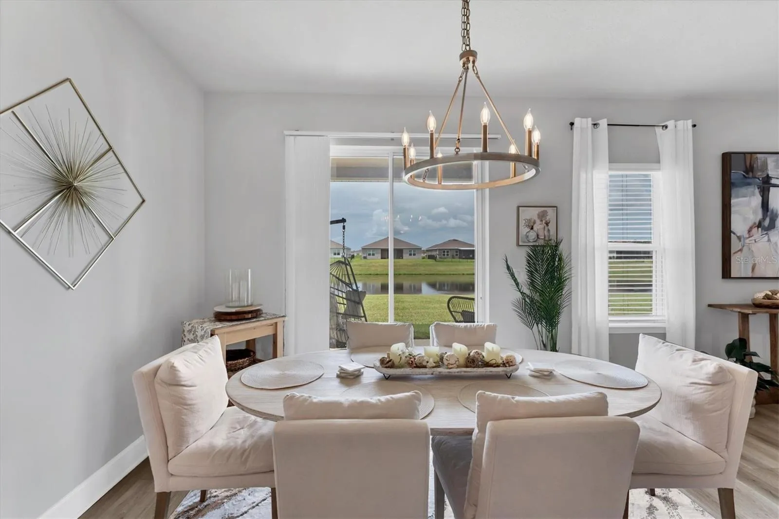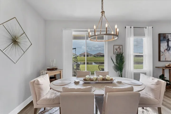 Enjoy serene water views from the great room, dining area, and primary suite. The