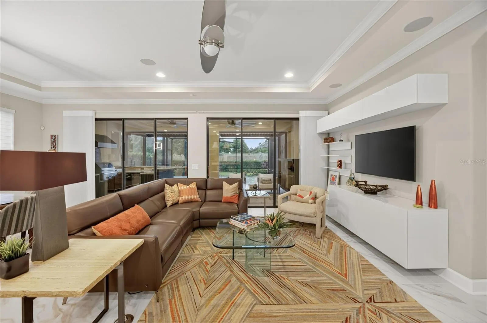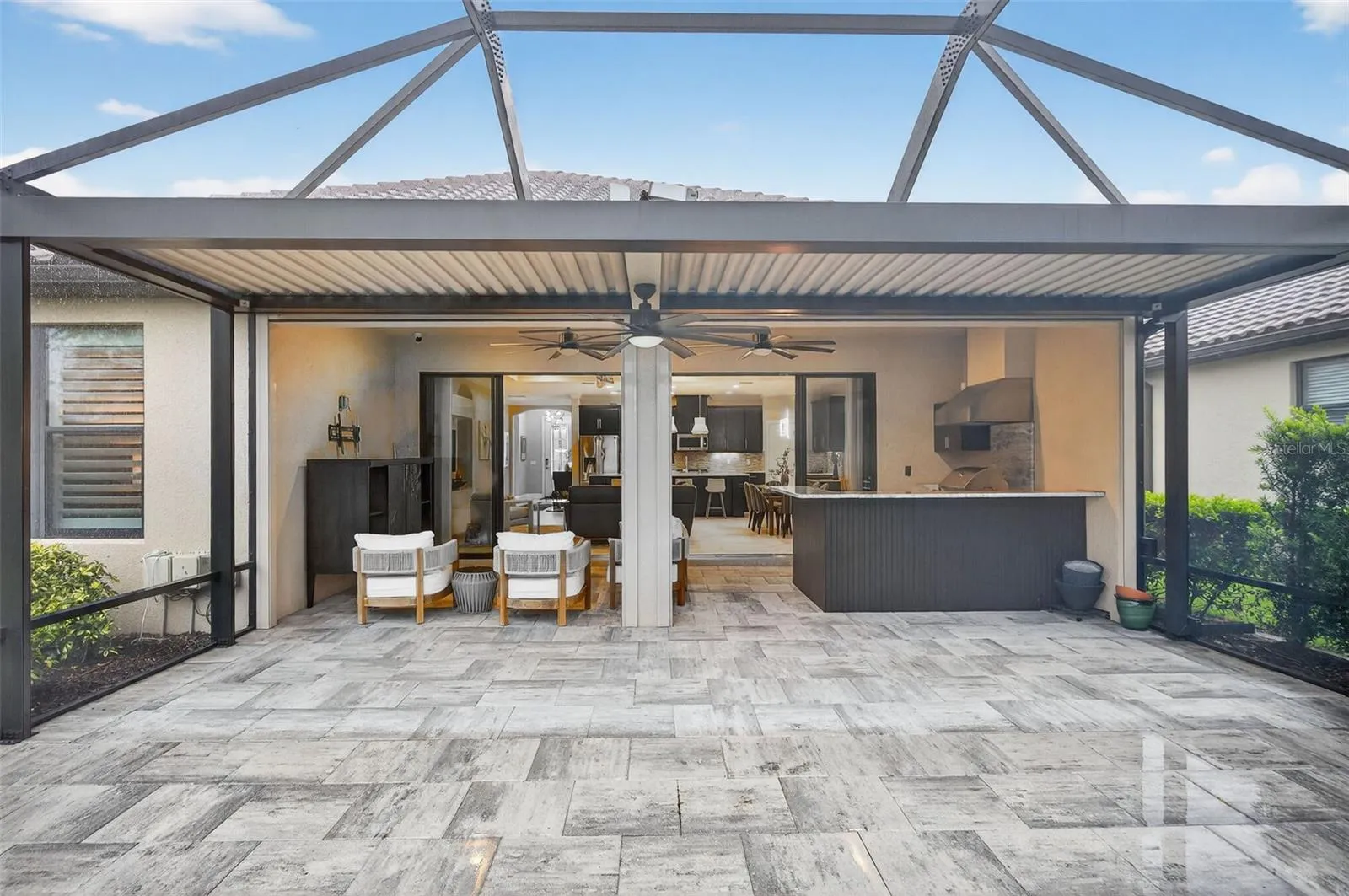 Impeccably Upgraded Piceno Model | 2BR + Den | Outdoor Oasis & Designer Touches! Welcome to this beautifully upgraded 2-bedroom, 2-bath Piceno model featuring thoughtful design, high-end finishes, and exceptional indoor-outdoor living. The gourmet kitchen is a true showstopper with an oversized Cambria quartz island offering extra storage, a custom pantry, stainless steel LG appliances, built-in desk, wine fridge, and under-cabinet lighting. Ideal for entertaining or everyday living, it seamlessly connects to the open-concept great room with tray ceilings, built-in surround sound (indoors & outdoors), and Hunter Douglas motorized shades on the sliders. Step outside to your extended lanai oasis featuring newer pavers, Storm Smart roll-down shades, and a fully equipped outdoor kitchen with granite countertops, built-in grill, side burner, sink, fridge, and ice chest—perfect for hosting guests or unwinding in peace. The spacious primary suite boasts dual custom walk-in closets, Cambria quartz dual vanities, and a luxurious walk-in shower. Ceramic tile flows through the main living areas, while both bedrooms feature plush carpet and plantation shutters. The private den offers double French doors, LED lighting, custom built-ins, and interior roll-down shades—ideal for a guest space or home office. The laundry room is both functional and stylish with built-in cabinetry and an LG front-load washer & dryer with pedestals. Major systems are move-in ready with a new A/C and water heater (2023), whole-house generator, Ring doorbell, motion-sensor lighting, and full alarm system. The garage impresses with epoxy flooring, custom cabinets, workbench, and overhead storage. Ceiling fans throughout complete the comfort-focused upgrades. THIS IS A NON-GOLF HOME. Esplanade offers a wide array of amenities and activities such as an 18-hole championship golf course, two resort pools, hot tubs, resistance pool, pickleball, tennis, bocce ball, two fitness centers, exercise classes, two dog parks, firepit, spa/salon, an on-site lifestyle director, social events, and various clubs plus a Tiki bar. The state-of-the-art Culinary Center offers residents several dining options such as the Barrel House as well as catering services, wine tastings, and special events. THE CHANDELIERS IN THE FOYER AND DINING ROOM, THE WHITE SHELVING IN THE FAMILY ROOM DO NOT CONVEY. This home is the perfect blend of style, function, and peace of mind—schedule your private tour today. There are camera at the front door and on the lanai.
