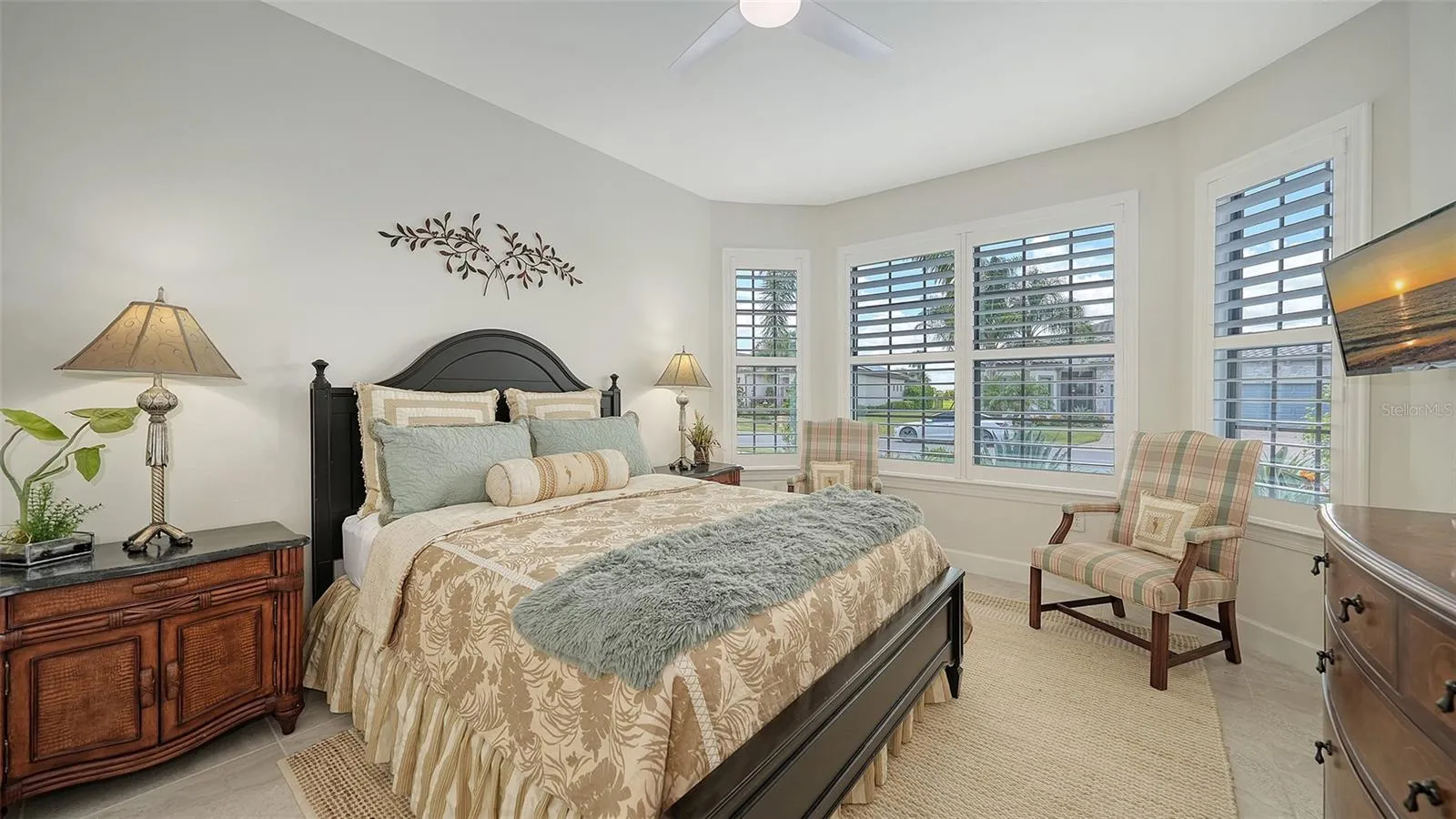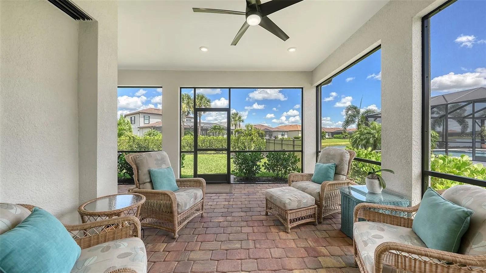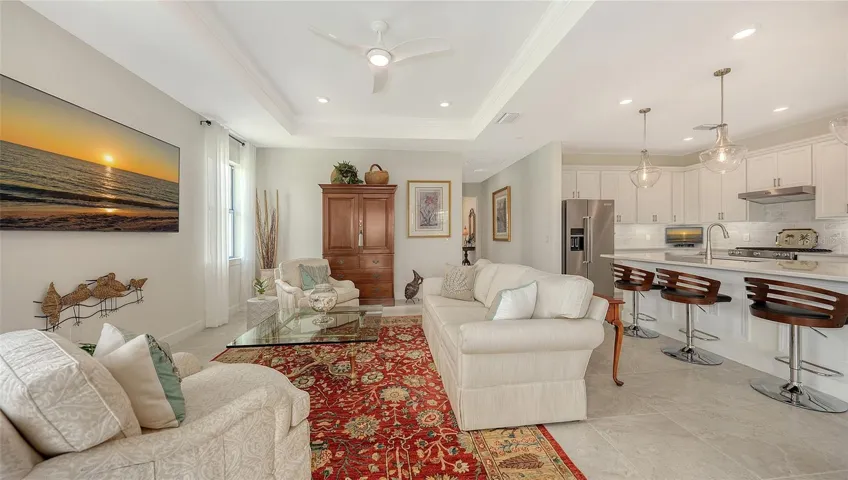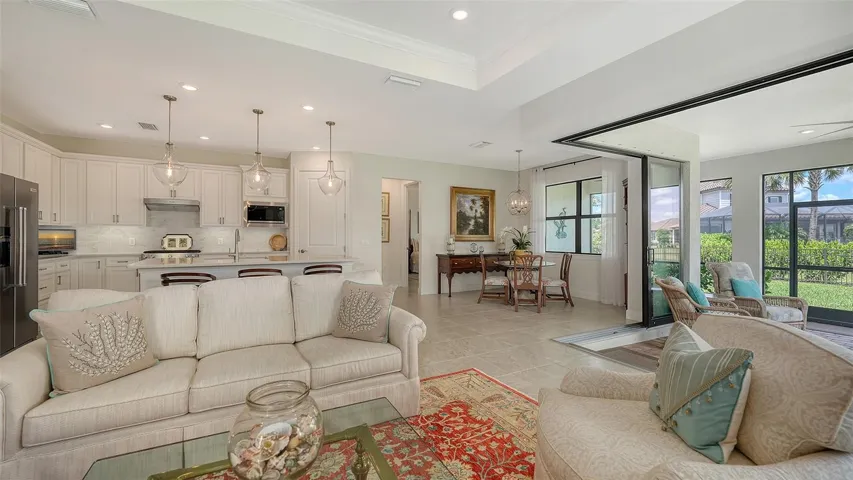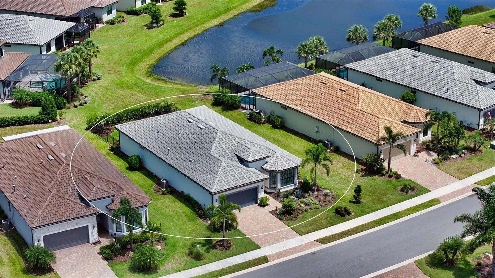 Welcome to this beautifully maintained 2-bedroom + den, 2-bathroom home in the highly sought-after Del Webb community. This popular Mystique model offers a spacious open-concept design, featuring a large great room, a stylish island kitchen, and a formal dining area ideal for entertaining. Corner sliders open to an oversized lanai, seamlessly extending your living space to the outdoors and providing a peaceful spot to relax. The property boasts a newly landscaped, fenced-in yard—perfect for pets—along with partial lake views that add a tranquil touch. Inside, the versatile den/flex space, secondary bedroom, and full bathroom are thoughtfully laid out for both functionality and comfort. The well-appointed laundry area adds convenience. The primary suite is a true retreat, featuring a large walk-in shower, double vanity, and an expansive walk-in closet. High-end finishes throughout, including porcelain tile floors, custom cabinetry, and solid surface countertops, create a modern, elegant atmosphere. For added peace of mind, the home is equipped with hurricane shutters, offering protection during storm season. Situated in the vibrant Del Webb community, this home provides access to an extensive amenity center, clubhouse, tennis and pickleball courts, a pool, fitness center, and more. Located within the award-winning Lakewood Ranch, enjoy easy access to Main Street and Waterside with their exceptional restaurants, shops, and weekly market. Move-in ready and offering the perfect blend of comfort, style, and location—this gem is not to be missed!