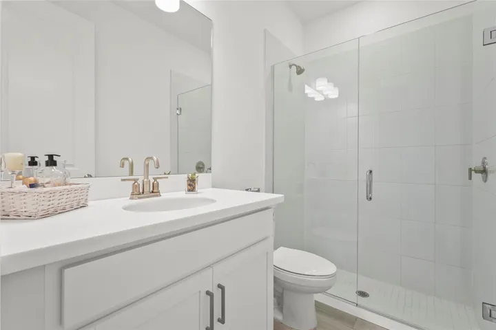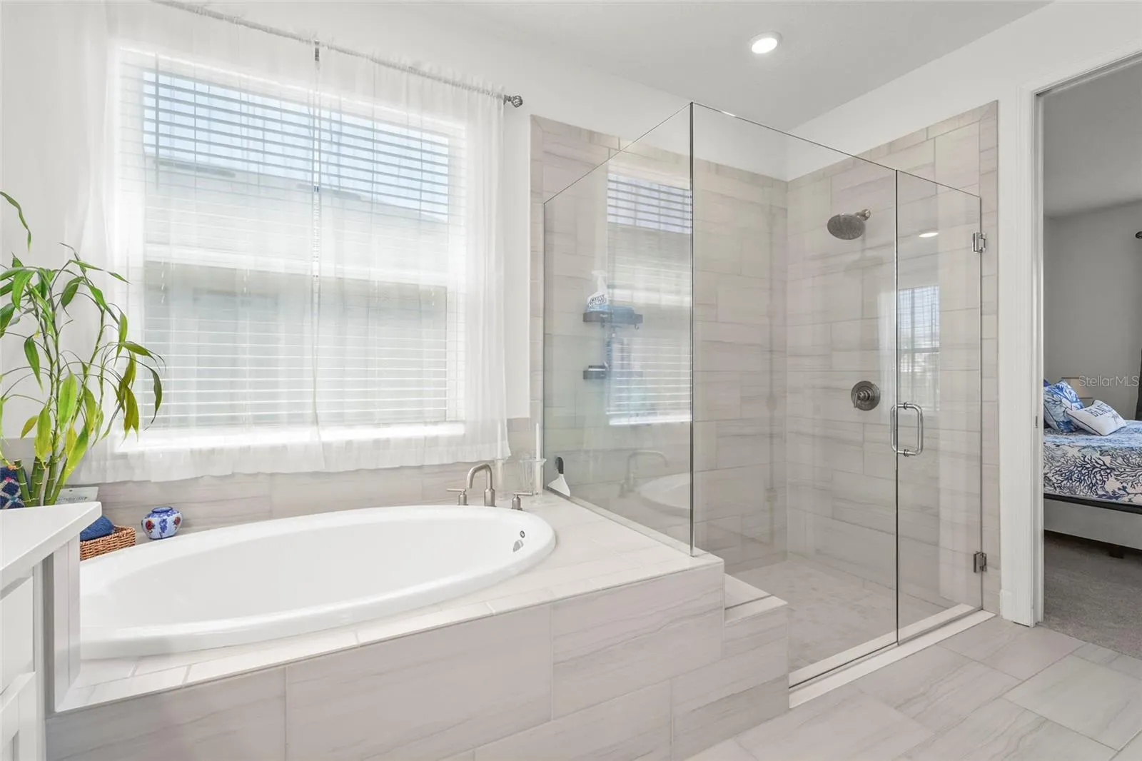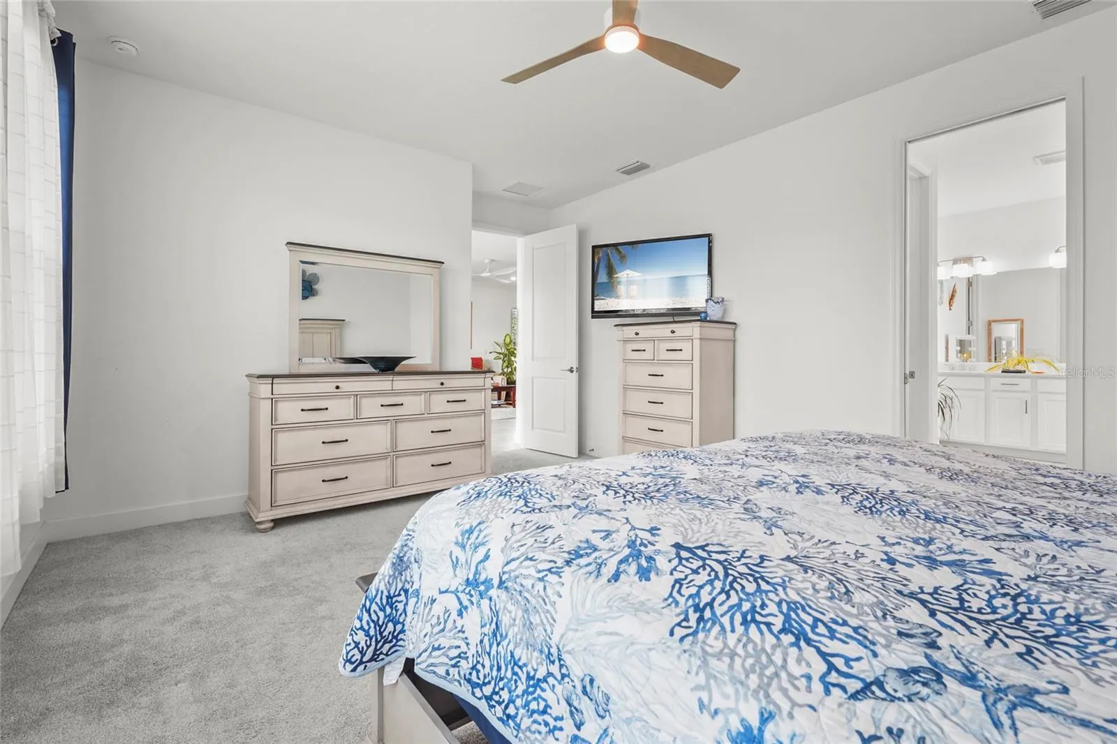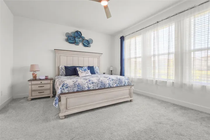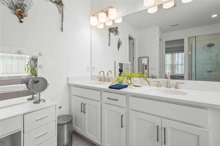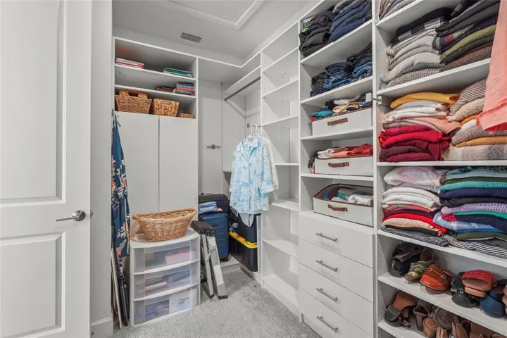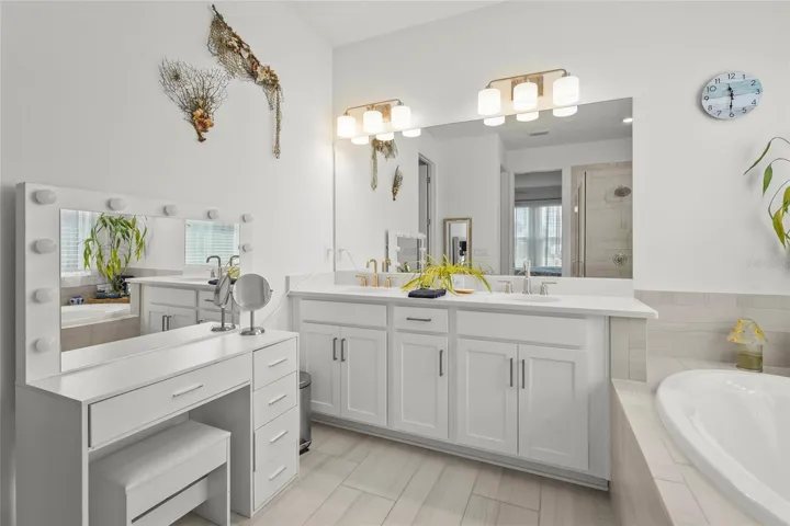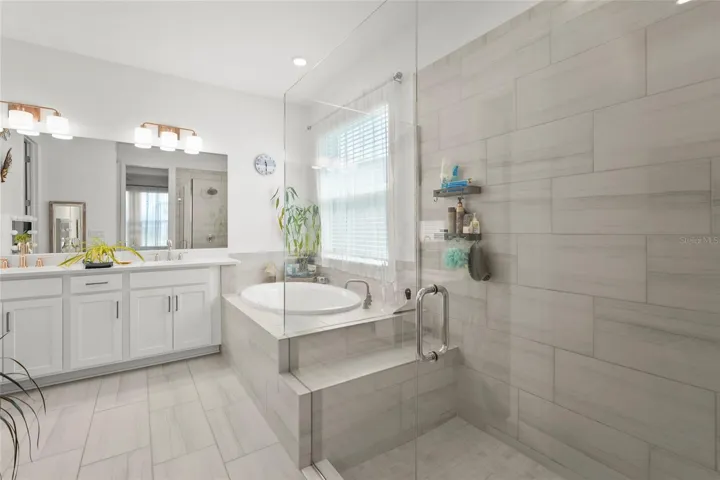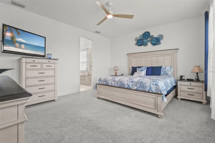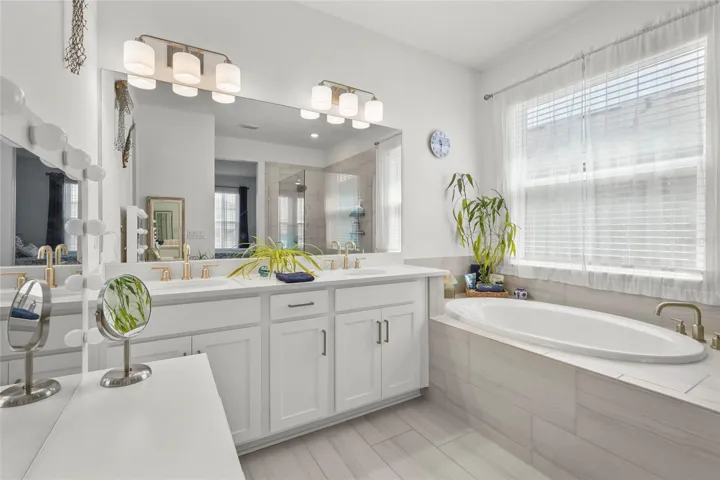 Sumptuous carpeting graces each bedroom sanctuary, where crown molding adds architectural distinction and carefully selected lighting fixtures illuminate these private retreats. The primary owner’s suite serves as a luxurious haven, offering serene backyard vistas and an indulgent en-suite bathroom featuring an oversized soaking tub, expansive glass-enclosed shower with rainfall fixtures, dual vanities with elegant mirrors, and a generous walk-in closet with built-in organization systems.