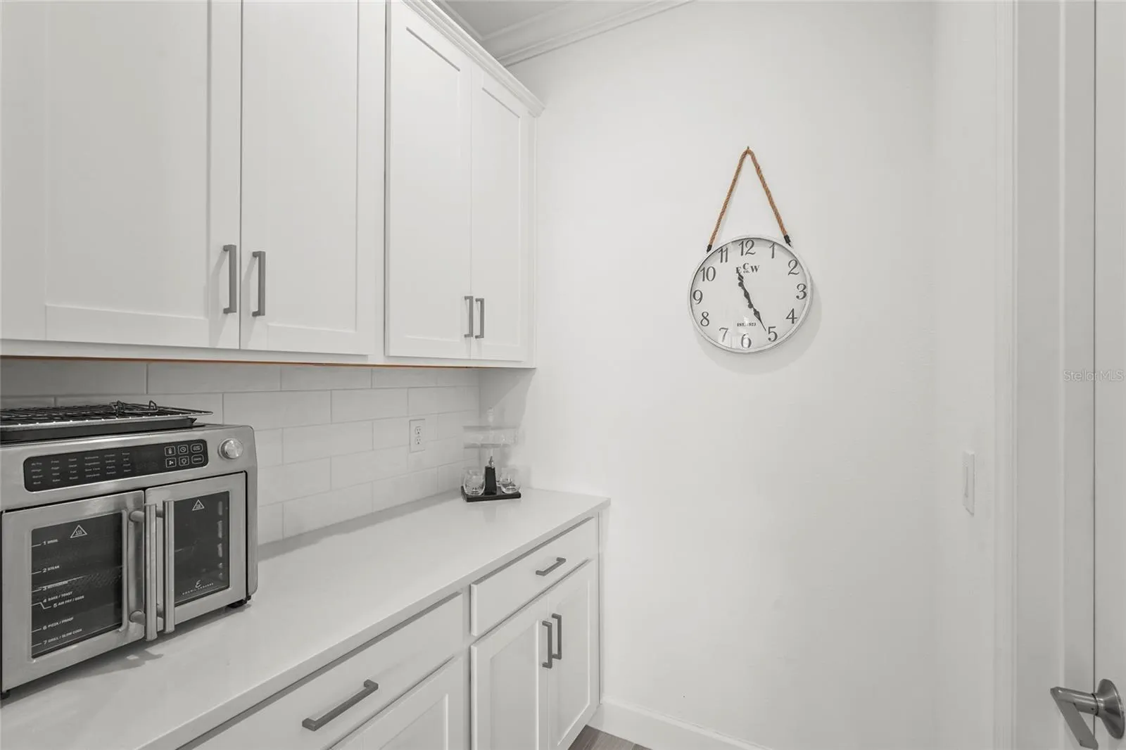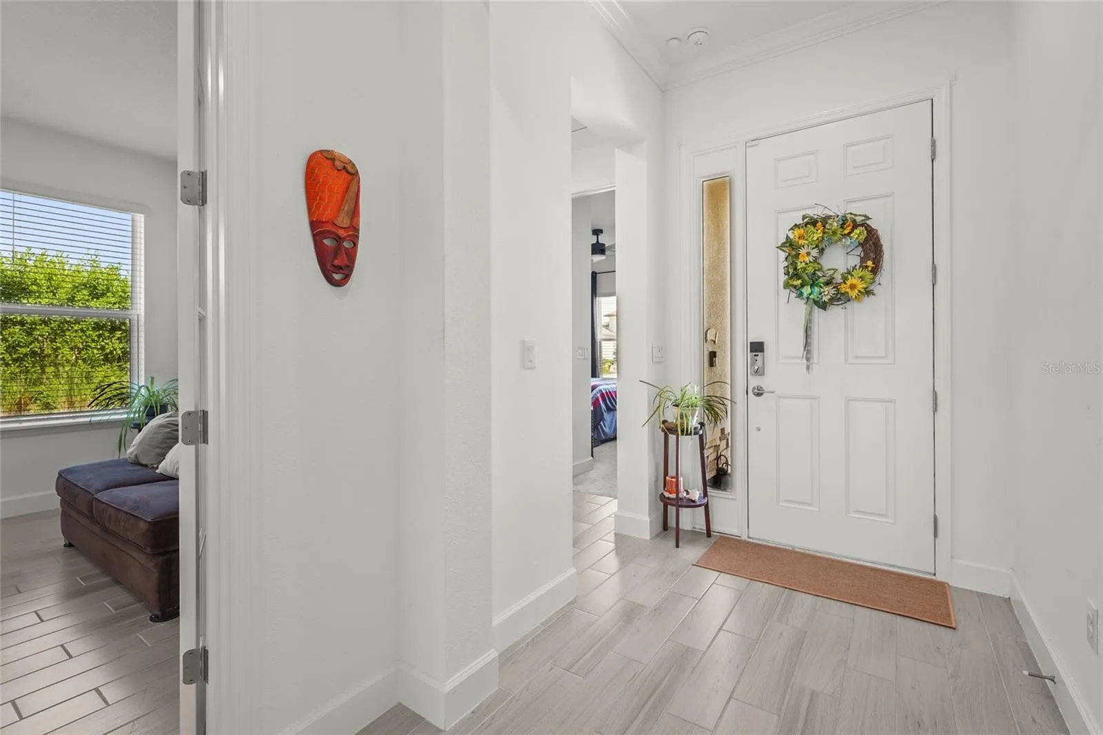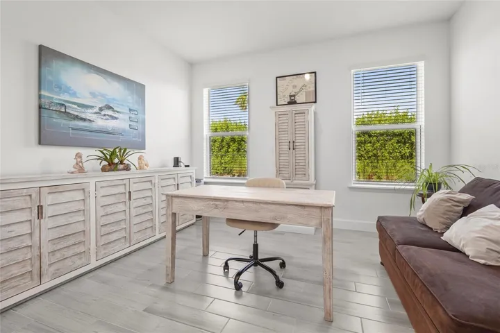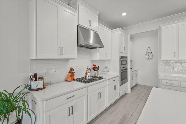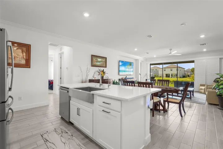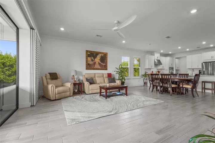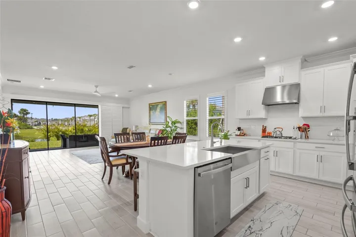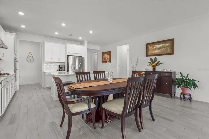 Step inside to find sophisticated wood-grained tile flooring flowing seamlessly throughout the main living areas, creating an effortless transition between the open-concept kitchen, dining, and family spaces. The gourmet kitchen commands attention with premium stainless steel appliances, rich granite countertops, and custom cabinetry complemented by sleek hardware. A generous center island provides additional workspace and casual dining, while pendant lighting creates ambient warmth throughout the culinary haven.