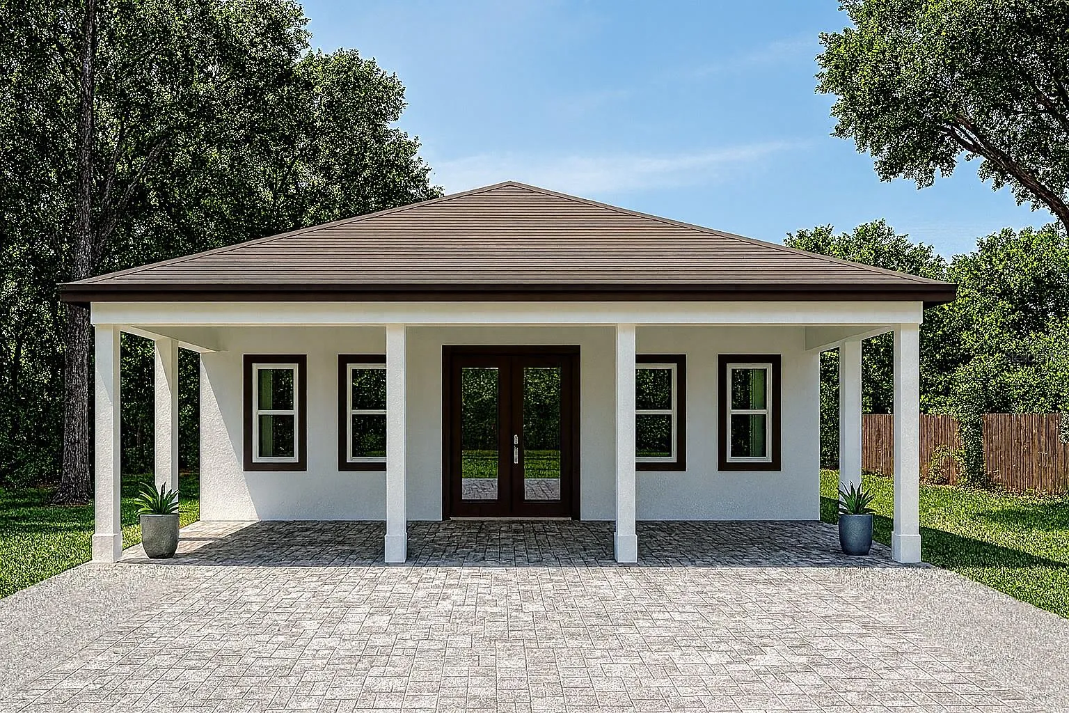 From the moment you arrive, the home’s modern exterior makes a statement with its crisp white façade, accented by dark brown trim around the windows, doors, and fascia, and a bold dark brown front door. The expansive paver driveway extends to an oversized carport, providing a grand entrance as well as practical covered parking.