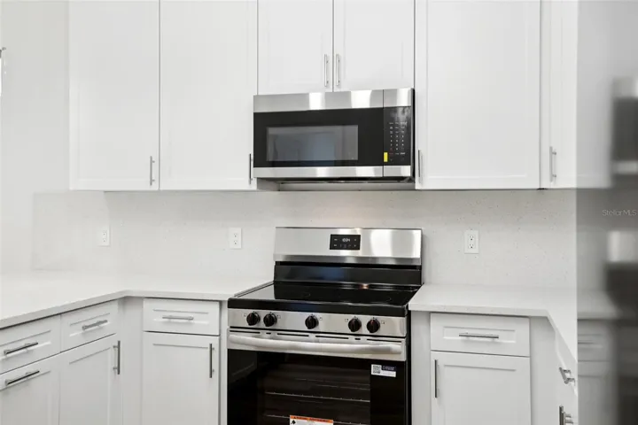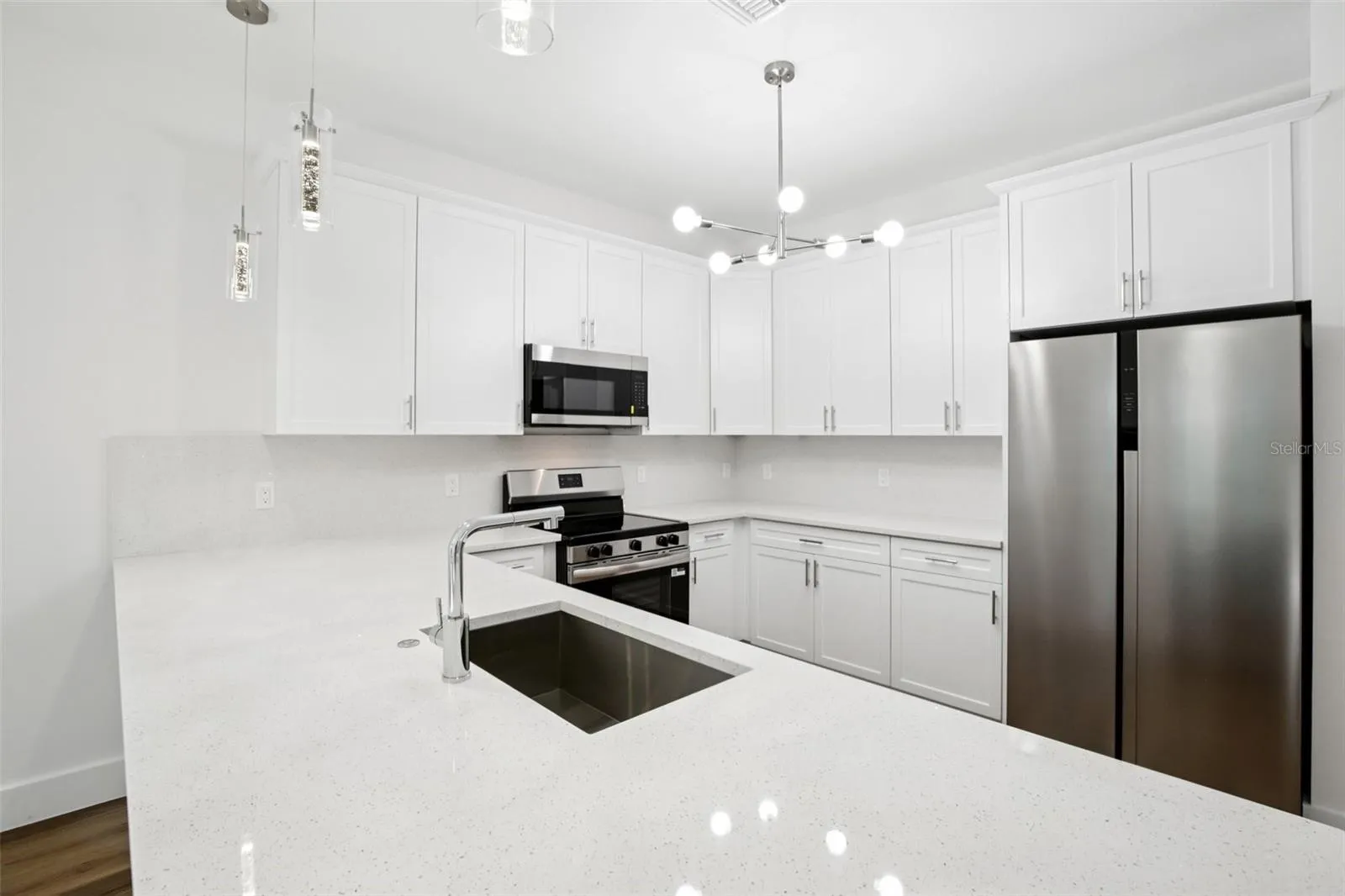 The kitchen is equipped with stainless steel appliances, quartz countertops, and a functional open layout perfect for entertaining.