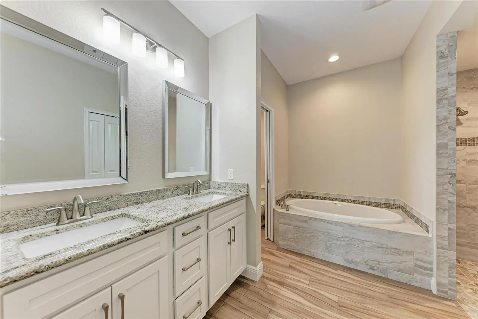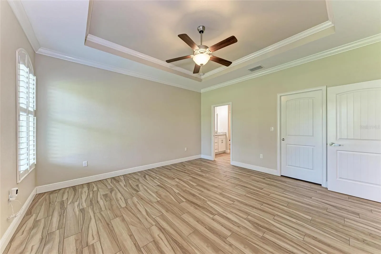 The primary suite is a peaceful retreat with a coffered ceiling, his-and-hers walk-in closets, and a spa-like en-suite bathroom featuring granite counters, a linen closet, and plantation shutters for added privacy.