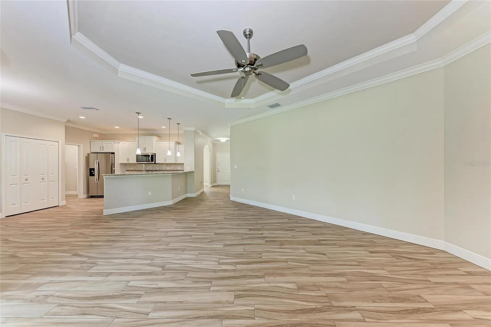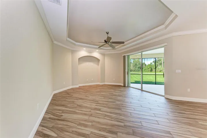 The home features 10-foot ceilings, coffered and tray ceilings with crown molding, and arched windows that add architectural character and natural light. Wood-look porcelain tile runs throughout the entire home, offering both elegance and durability.