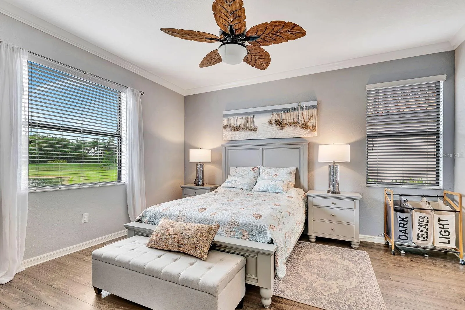 One or more photo(s) has been virtually staged. Discover the perfect blend of luxury, comfort, and a maintenance-free Floridian lifestyle in this beautiful four bedroom, three bath home tucked away on a quite dead end street in the Sanctuary at the gated River Strand at Heritage Harbour community. Built in 2016 and boasting just over 2000 sq ft this residence offers elegance and comfort. The extended paved driveway adds convenience and extra parking, while the community maintains the lush landscaping, allowing you to enjoy your home without the work. The home itself has been thoughtfully updated. Inside you will find no carpet-modern vinyl plank flooring was installed in all bedrooms in 2021, newer refrigerator purchased in 2022 and a washer and dryer added in 2023, while beautiful crown molding in every room enhances the home with a modern fashionable touch. The kitchen has been beautifully updated with an accent wall on the island, a sleek new backsplash and contemporary light fixtures in 2023. You will never worry about space in your master bedroom featuring two large closets with built-in shelving for convenience, and for peace of mind during hurricane season the property is equipped with hurricane shutters. The living room features a stylish oversized fan installed in 2023, fresh interior pains was completed in 2022. The home exterior was painted in 2024 for a modern look. The roof was recently (2025) professionally soft pressure washed restoring its fresh and like-new appearance. A whole house WATER FILTRATION SYSTEM is another treasured feature and gives you the confidence and peace of mind that your family is enjoying the safest and healthiest water every day- an invaluable feature that adds a significant advantage to maintaining a healthy lifestyle. The extended paved lanai provides generous outdoor space, perfect for entertaining and the outdoor furniture is included in the sale. From the lanai you will enjoy a tranquil pond view with room to add a private pool id desired. The peaceful pond view from the backyard adds a daily dose of serenity and beauty, creating the perfect backdrop for morning coffee and evening relaxation. River Strand is more that just a neighborhood- it is a vibrant lifestyle with a 27-hole championship golf course designed by world-renowned architect Arthur Hills and practice facilities include aqua driving range, putting green and 2 chipping greens. There are nine Har Tru tennis courts, 6 pickleball courts and 8 pools, including two resort-style and six satellite pools with hot tubs and the main clubhouse has a resistance pool. Residents and their guests can enjoy the Shank Shack and Tiki Bar between swims, take part in popular fitness classes and biking groups, or attend social dinner events. Just minutes away are Target, Costco and fine dining, while nearby Bradenton and Lakewood Ranch have more attractions, shopping,, rated A schools and beaches. River Strand is part of a larger master-planned community that ensures a well-preserved environment and a coordinated secure setting, making this home an appealing choice for those seeking the very best of the Florida Lifestyle. Schedule the private showing today and you will not be disappointed. Living a luxury lifestyle can become your reality, all it takes is your first step to make it happen.