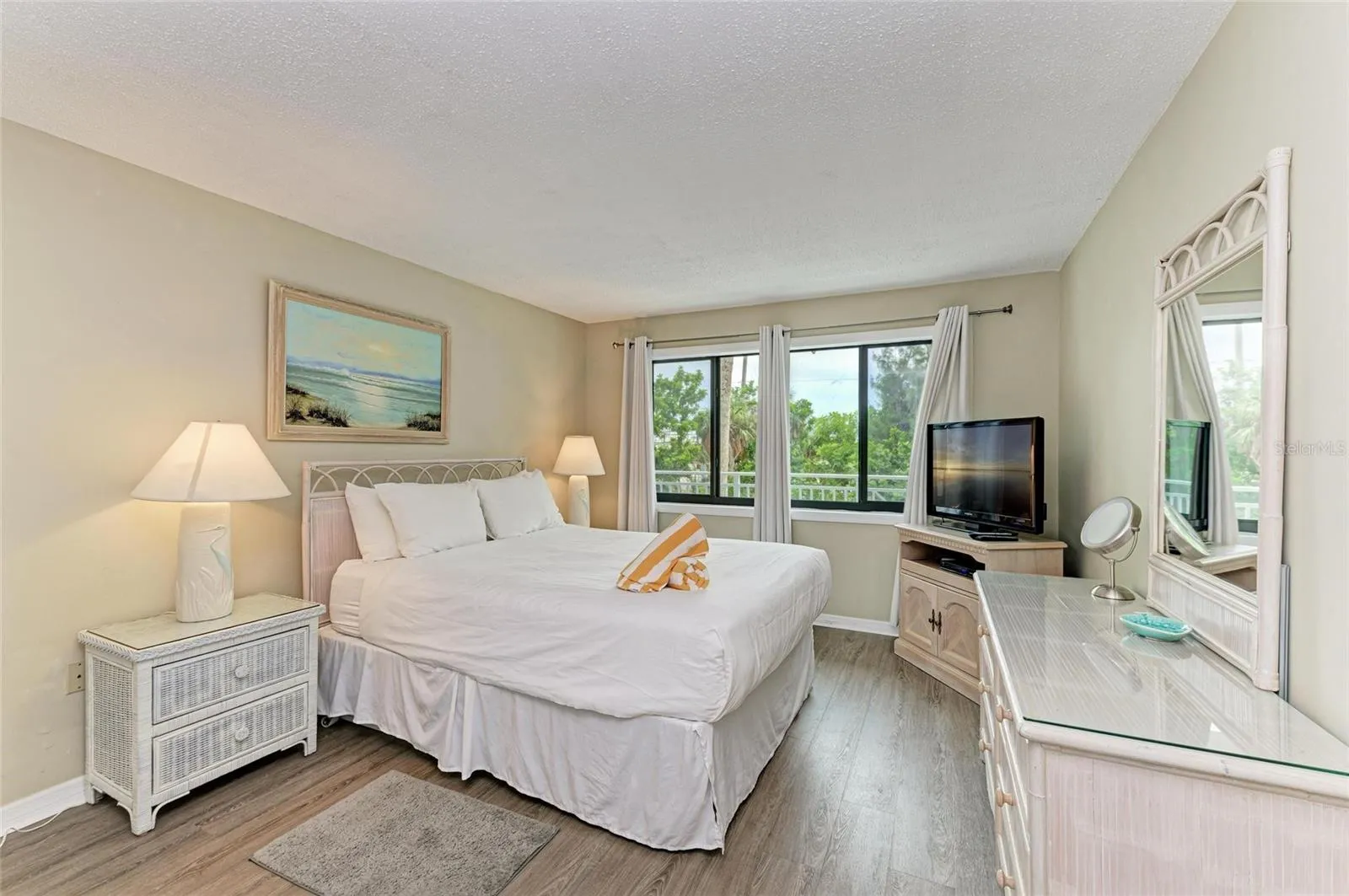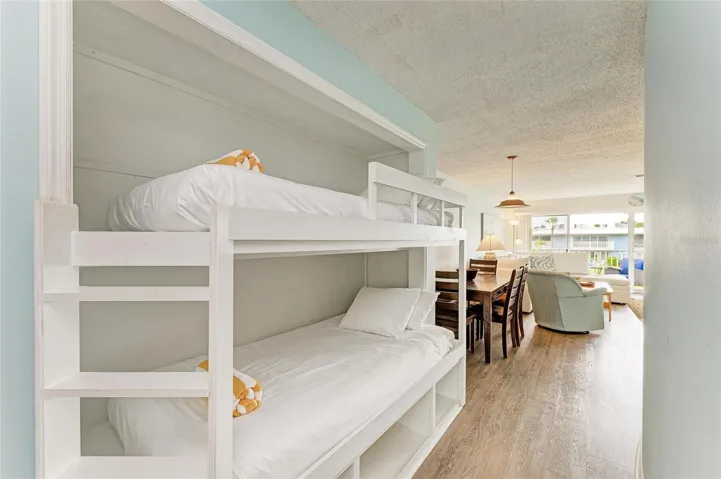 In addition to the primary bedroom, built-in bunk beds provide extra sleeping arrangements—perfect for visiting guests or grandchildren’s sleepovers. The condo comes fully furnished, including flat-screen TVs in both the living room and bedroom, and is move-in ready.