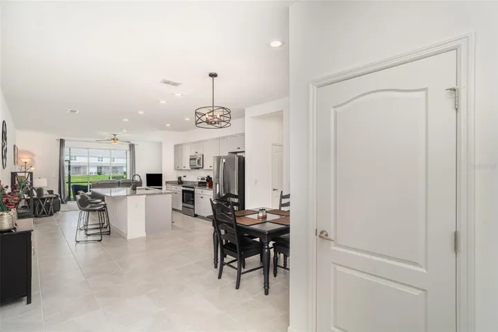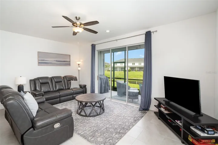 Inside, the open-concept floor plan is enhanced by an extra side window, filling the living area with natural light. The modern kitchen is a true highlight, featuring gray cabinetry, sleek granite countertops, stainless steel appliances, and a spacious island—perfect for cooking, entertaining, or casual dining. The living room flows seamlessly to the screened lanai, where you can relax and enjoy peaceful water views—a private retreat right at home.