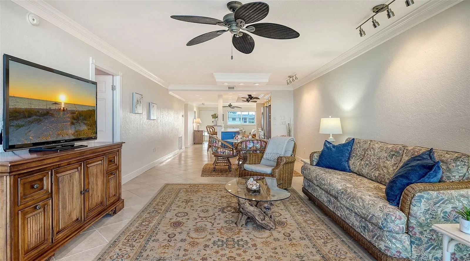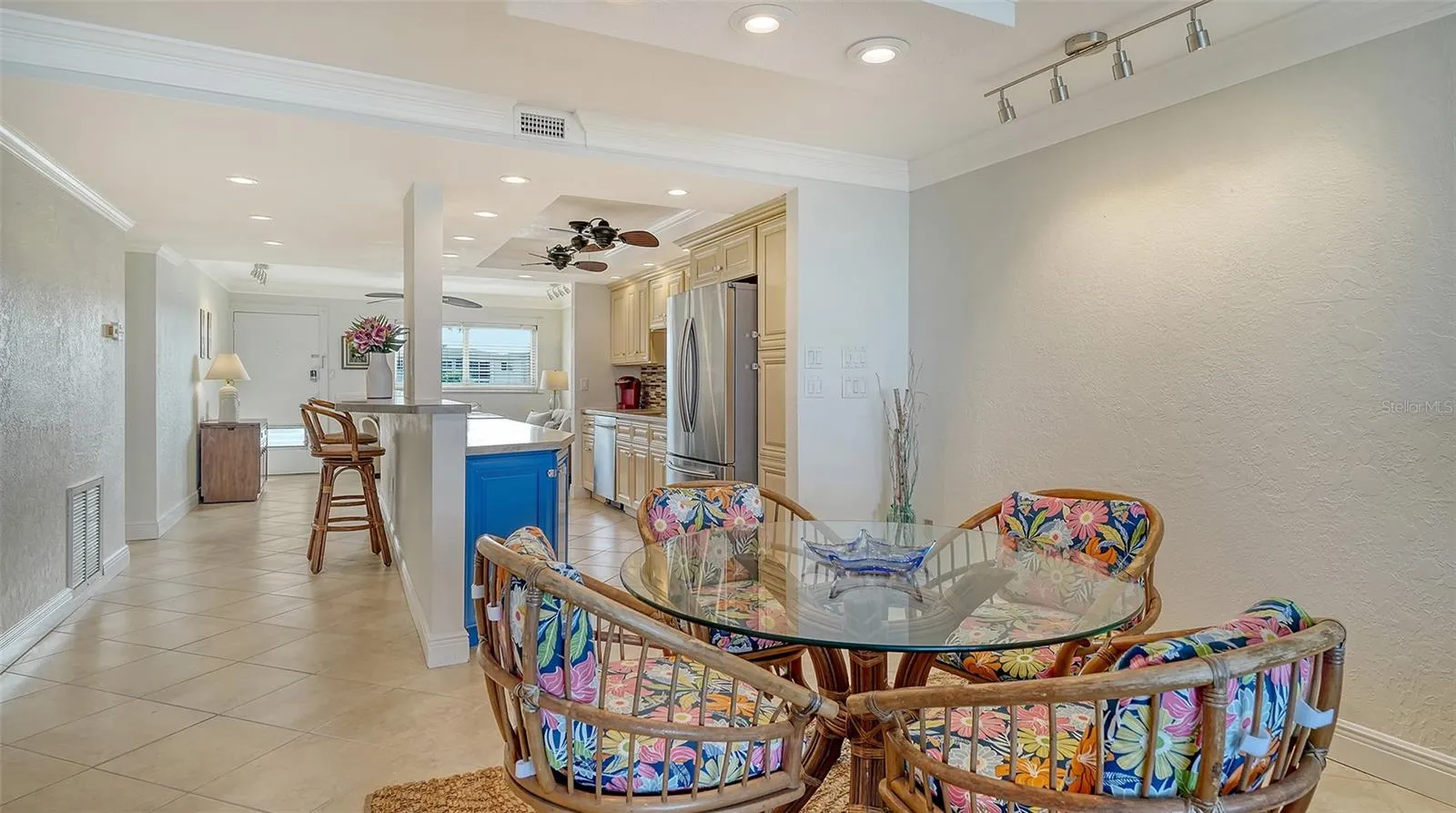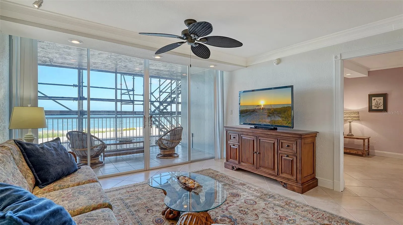 The interiors blend relaxed sophistication and modern comfort, featuring tray ceilings, recessed lighting, impact rated windows and door, and a soothing neutral palette that complements the surrounding seascape. The updated kitchen is equipped with stainless steel appliances and ample cabinetry, seamlessly connecting to the living and dining areas for effortless entertaining. A newly screened-in private lanai extends the living space outdoors—perfect for morning coffee, sunset cocktails, or simply listening to the gentle sound of the surf.