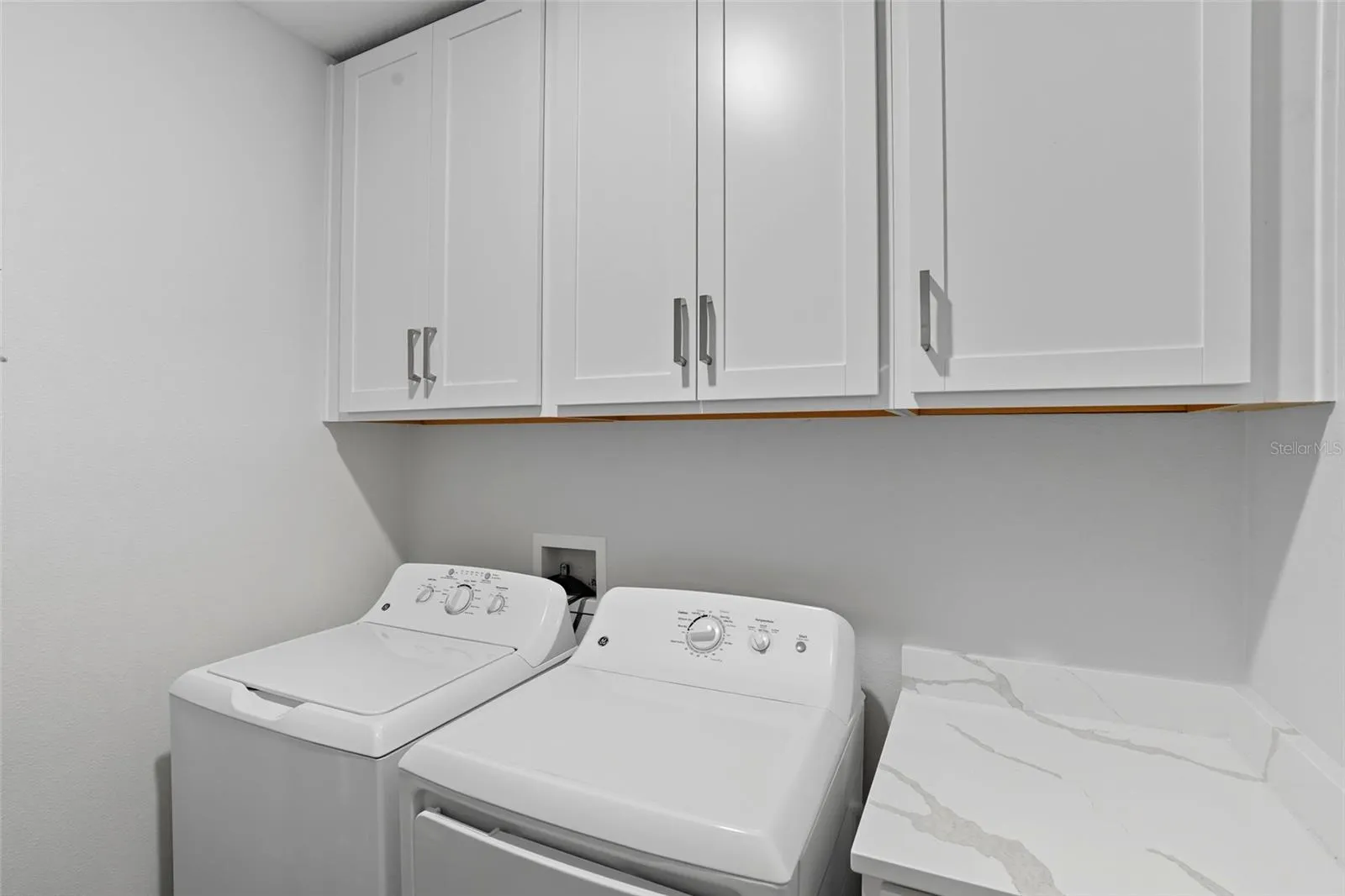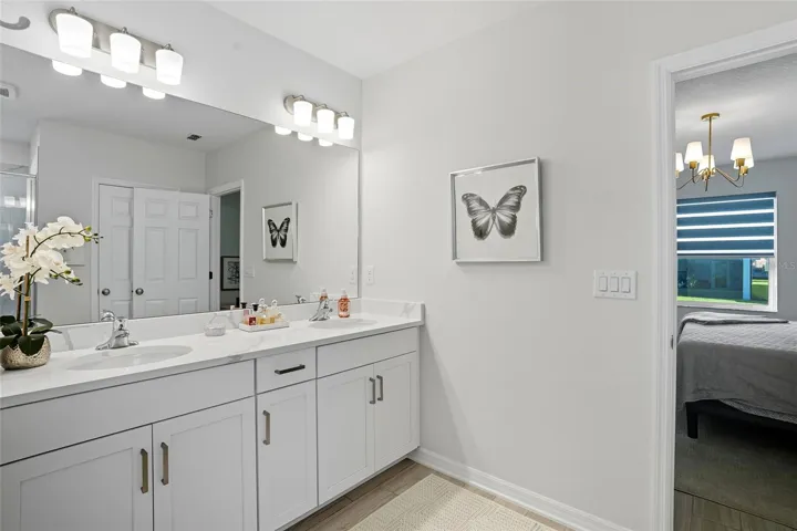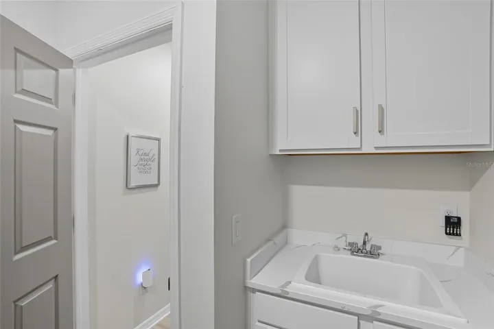 Both secondary bedrooms include walk-in closets and upgraded tile flooring, offering low-maintenance comfort. The laundry room features full cabinetry and a utility sink for added convenience. Additional enhancements include updated hardware, sealed grout throughout, and epoxy flooring in the garage for a clean, polished look.