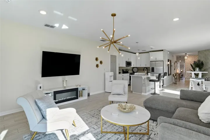The expanded primary suite offers ample space, a walk-in closet, and a spa-inspired shower with glass shelving for added style and function. The kitchen is a standout feature with a brand-new backsplash, bar seating, and a cozy breakfast nook that flows seamlessly into the dining and living areas. Sliding glass doors open to the enclosed screened lanai, perfect for relaxing or entertaining.