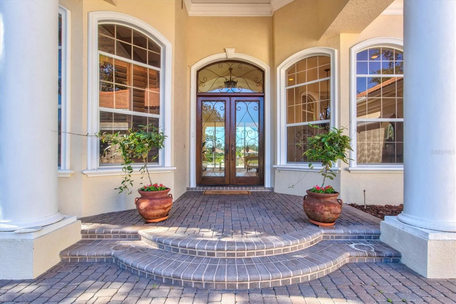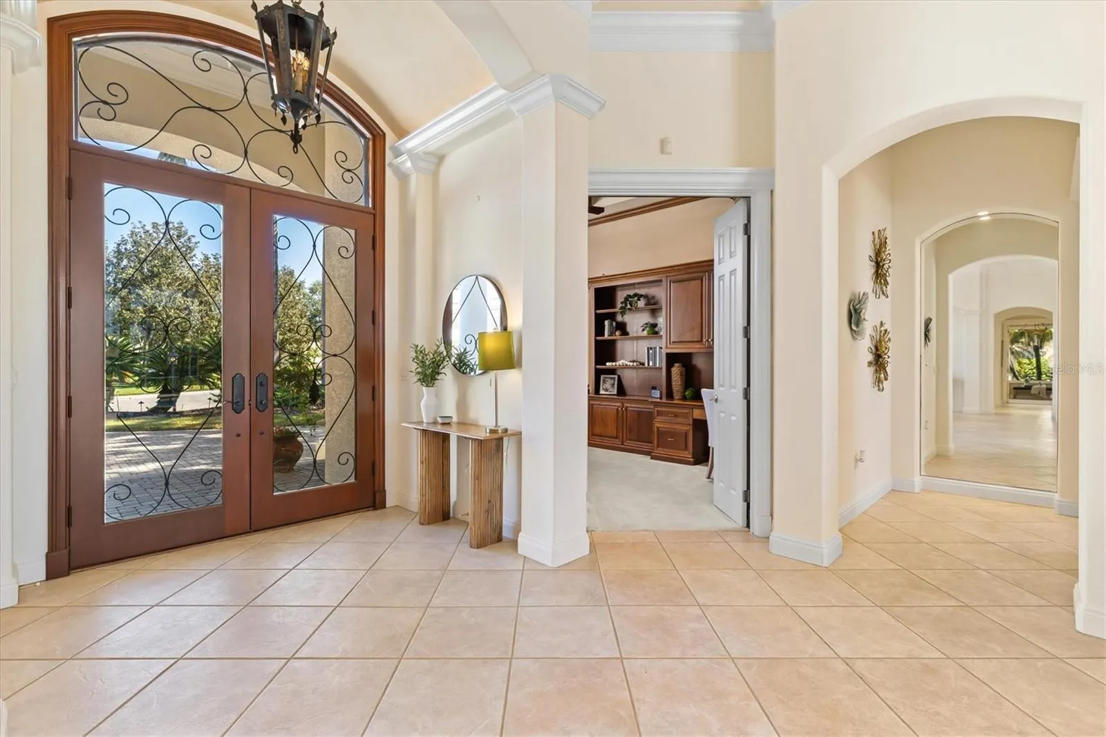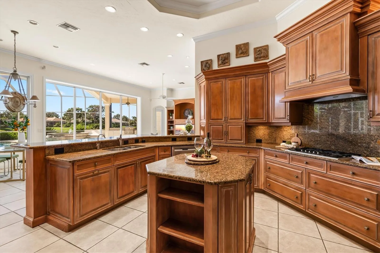A circular driveway with landscape lighting welcomes you to the home, where the front entry provides a brilliant direct view of the sparkling pool and spa and serene pond beyond. Expansive living areas open seamlessly to the outdoors through three sets of sliding glass doors, leading to the screened lanai with a large pool featuring automatic popups, spa with gas heating, and a full outdoor kitchen complete with Corian counters, sink, and built-in gas grill.