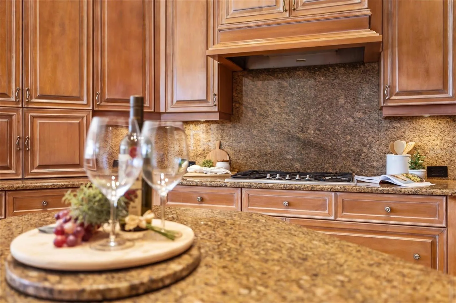 Inside, the home is richly appointed with granite and marble surfaces, trayed and beam ceilings, and custom details throughout. The chef’s kitchen is both functional and refined, offering a Sub-Zero refrigerator, Thermador gas range and double oven, Bosch extra-quiet dishwasher, walk-in hidden pantry with built-in safe, refrigerated wine cabinet, instant hot water tap, and center island.