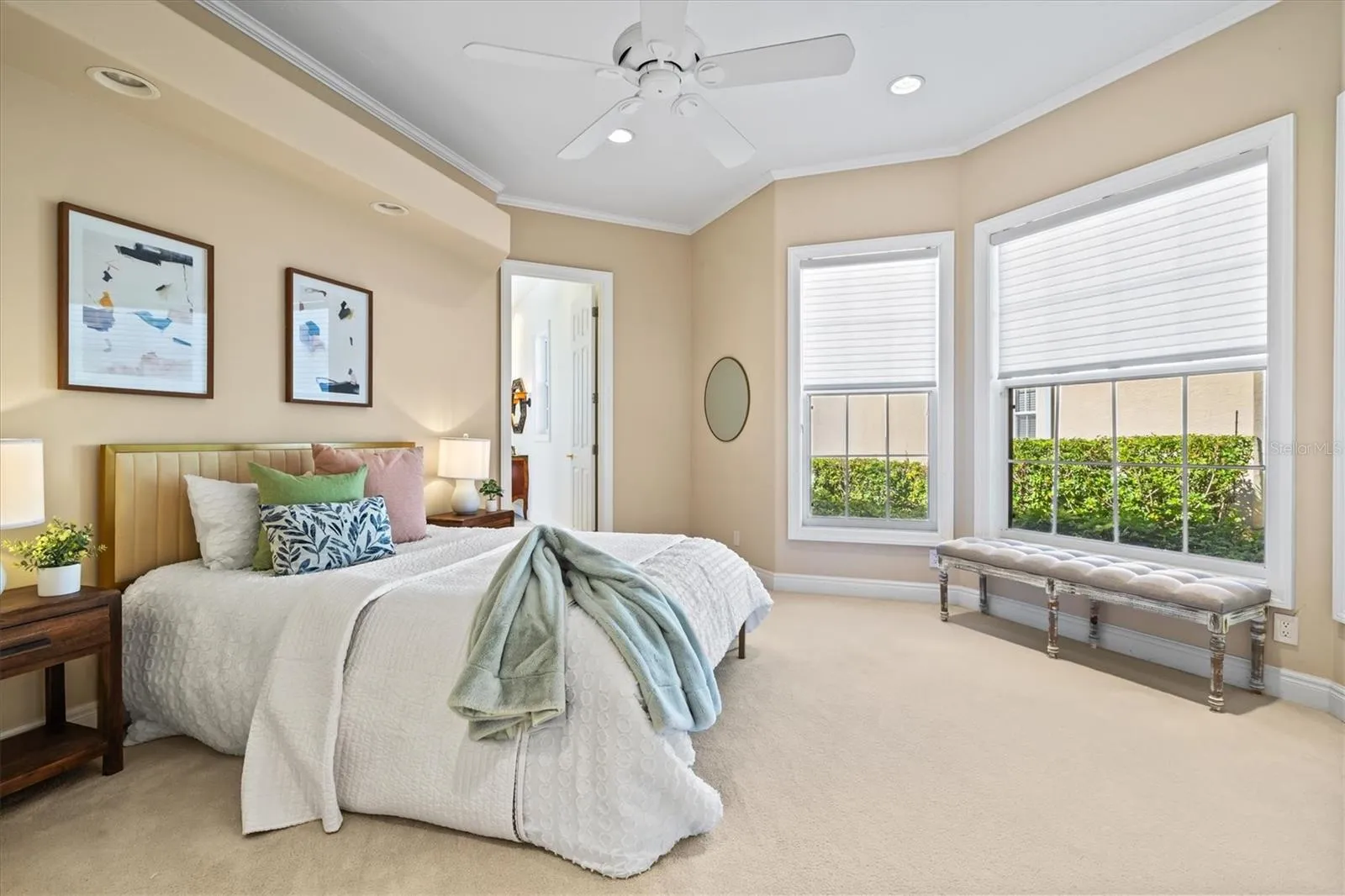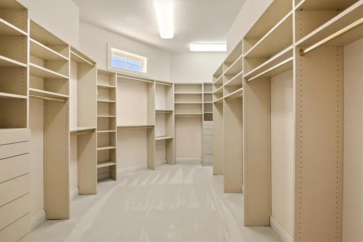 The luxurious primary suite features a custom walk-in closet with two entrances, abundant built-in shelving and storage, and a spa-like bathroom with dual vanities, dual showers, Jacuzzi tub, and elegant cabinetry. Two additional guest bedrooms and baths provide comfort and privacy for visitors.