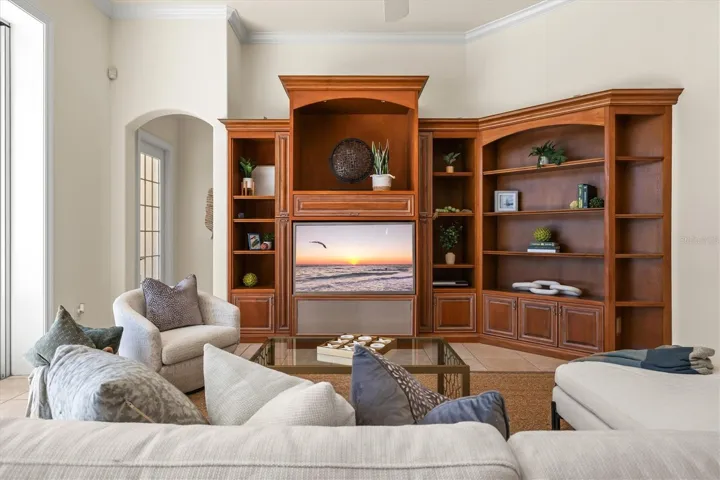 The family room showcases a striking custom wood built-in with shelving, TV display, and hidden storage, while the study impresses with handsome wood cabinetry, Bermuda shutters, and built-ins designed for both beauty and functionality.