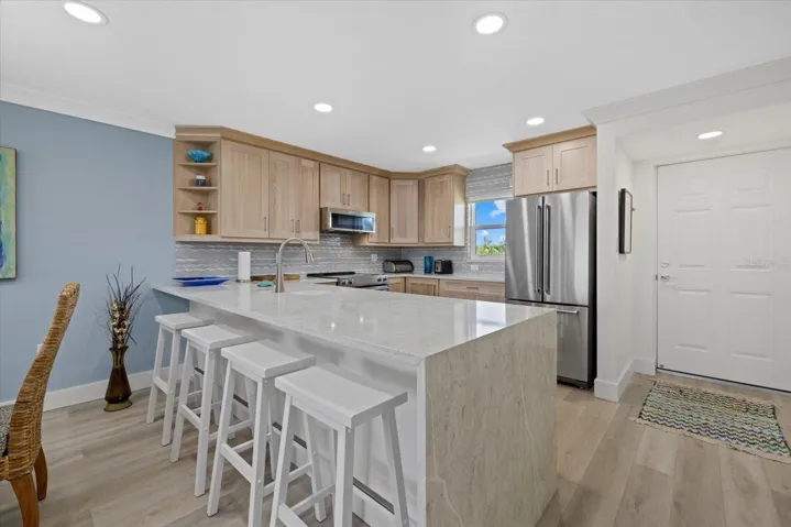 If you seek incredible views, look no further. Surrounded by water on three sides, enjoy the panoramic vistas on the southernmost end of Siesta Key. Look from the lanai to the east at scenic Neville Preserve and Little Sarasota Bay. The west-facing front of the unit is the perfect location from which to enjoy the spectacular Siesta Key sunsets with friends and neighbors. Step inside this beautifully updated turn-key furnished 2-bedroom, 2-bathroom unit and experience coastal elegance at its finest. The open-concept kitchen features stunning cabinetry, a quartz waterfall countertop, and sleek stainless steel appliances—ideal for entertaining or enjoying quiet mornings with a view. Crown molding and recessed lighting add a refined touch throughout the space. The master suite is a private retreat with a spacious bedroom, walk-in closet, and sliding doors leading to the lanai—offering peaceful water views to wake up to each morning. The en-suite master bathroom is a spa-like sanctuary, complete with a walk-in shower, quartz countertops, and a breathtaking tiled wall and shower. The second bathroom echoes this sophisticated design with quartz counters and beautifully tiled features. A large screened-in lanai invites you to unwind while soaking in the ever-changing hues of sunrise and sunset over the Intracoastal Waterway. Additional conveniences include an in-unit washer/dryer and an assigned covered parking space. A gated community, The Pointe is beautifully landscaped and features every amenity: a heated pool and spa, lighted tennis and pickleball courts, private boat docks, kayak and paddleboard racks and launch, exercise rooms, men’s and women’s saunas, clubhouse, a private island with a gazebo and grills, and on-site management and maintenance. This five-plus-acre property is conveniently located just a few minutes’ walk from Turtle Beach and three restaurants. Come live at the less-traveled, more tranquil end of the Key and enjoy the walking and bike paths under tree-lined Midnight Pass Road. Boat docks are available!!