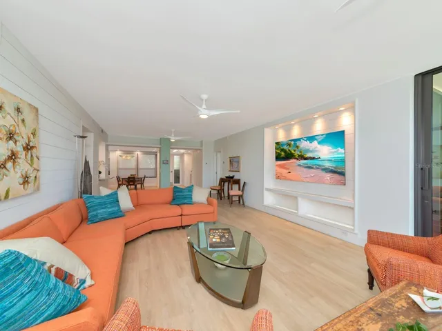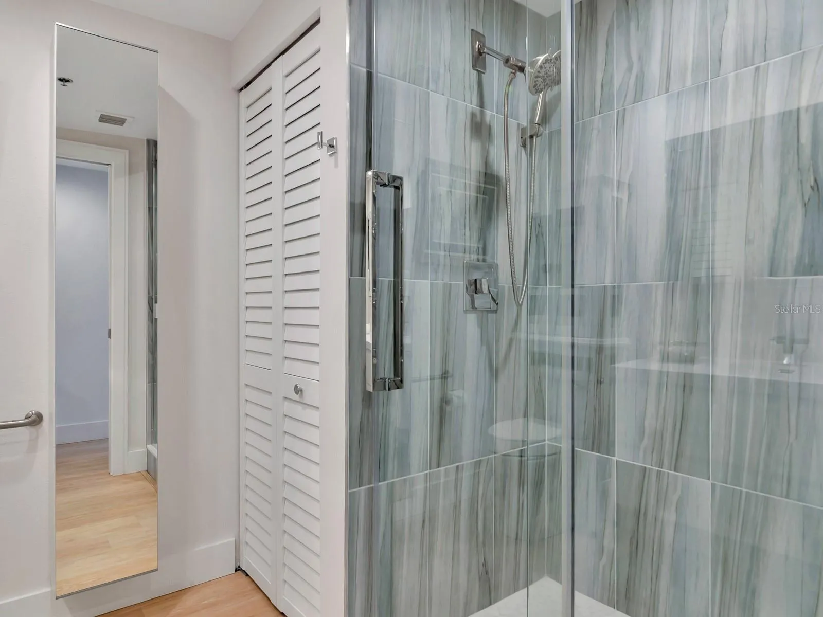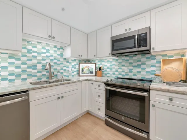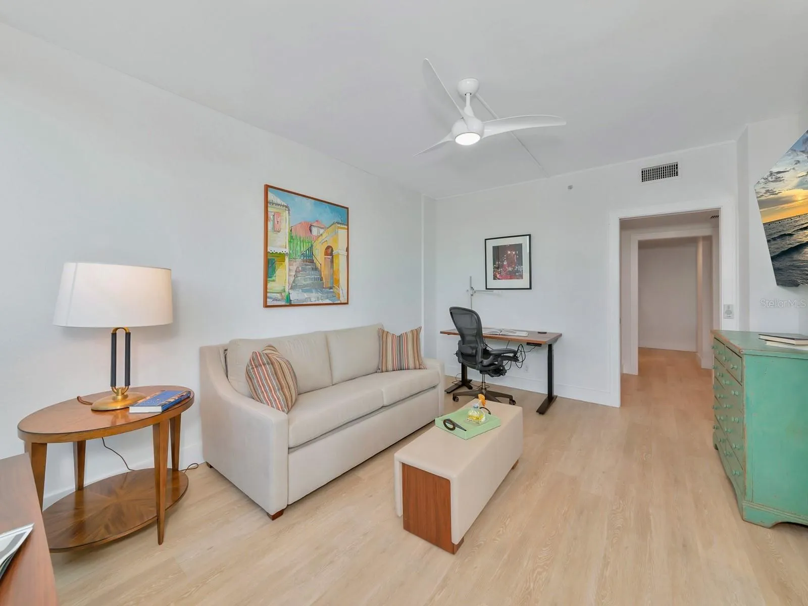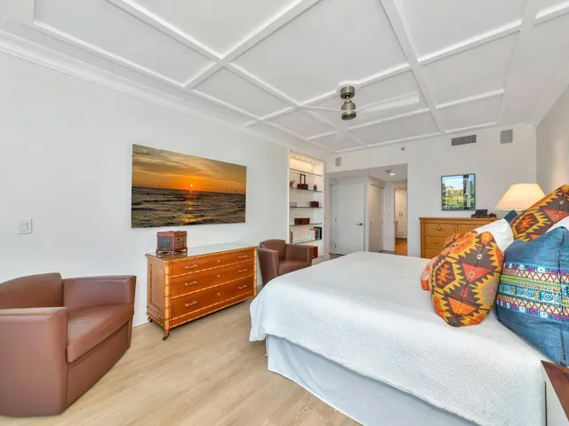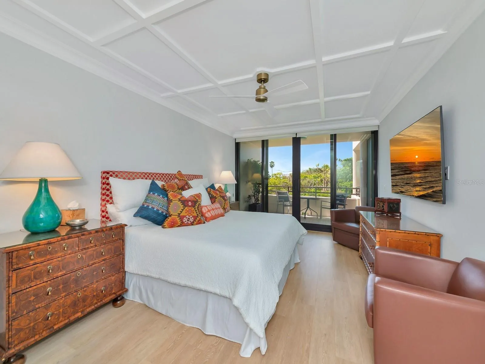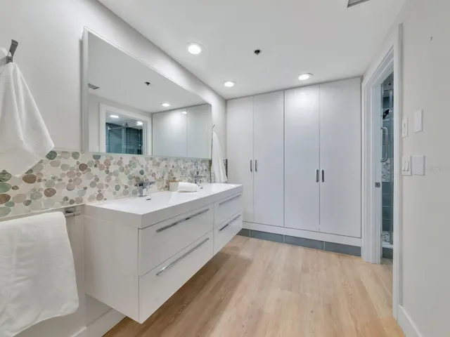One or more photo(s) has been virtually staged. This downtown Bay Plaza residence combines tranquility & urban convenience, creating a serene, treehouse-like atmosphere. The upgraded coastal style enhances the overall experience, boasting charming fixtures & modern finishes. Situated on the second floor, it provides a secluded retreat from the city’s hustle & bustle. Savor the gentle rustling of the wind through the trees that line the street below. A beautifully remodeled floor plan features an airy main living space, two tree-top tiled balconies that offer glimpses of water views, & two primary suites, each with its own bath & walk-in closets designed with built-ins. The foyer is open to the dining room, showcasing an expanded footprint with a console table area plus cleverly concealed closet & mechanical access. The handcrafted walls seamlessly extend into the living room, where a lovely built-in media center highlights the elegance of the shiplap throughout the main living space. The luxury vinyl tiles perfectly accentuate every room. A serving bar between the living & formal dining enhances the flow of entertainment. A hand-painted glass chandelier provides ample lighting for a generously sized table, offering plenty of room for dinner parties with at least ten guests. The wonderfully updated kitchen has striking natural stone countertops, a stylish glass-tiled backsplash, & soft-close shaker-style cabinetry, all illuminated by stunning LED lighting. The appliances that have a fingerprint-resistant finish remain. There’s a delightful area for casual dining that can double as a versatile home office with its own entrance. The Owner’s Retreat is adorned with coffered ceilings, two walk-in closets, & its own balcony with ceiling-to-floor glass doors. You’ll love the en suite bath, which boasts a spacious double floating vanity with a backlit mirror, a separate shower & a Toto toilet in the water closet. New cabinetry adds stylish storage along one wall. The split plan layout separates this suite from the secondary primary, featuring its own high-end finishes, a convenient laundry closet, & access to the main balcony. This residence also includes generous storage & new electronic roll-down shades that provide complete privacy. Bay Plaza is a coveted building situated in downtown Sarasota, recognized as Florida’s cultural & creative coast. Designed by the renowned architect Tim Siebert, it offers immediate access to the heart of the city. Residents have access to a range of amenities, including 24/7 valet parking, a full-service concierge, EV charging stations, & around-the-clock services. A parking garage with assigned parking for one car adds peace of mind. The recent installation of impact-resistant glass enhances both safety & style. You can relax in the heated pool or spa, & stay fit in the state-of-the-art fitness center, which features a sauna & steam room. The spacious lobby includes a grand piano, a media room, & a library, creating an atmosphere of luxury & sophistication. The condominium is conveniently situated near the Opera House, the farmers’ market, art galleries on Palm Ave., & a variety of trendy & bay-view restaurants. You will be surrounded by boutique shopping, Whole Foods, & local theaters, all within moments of the vibrant cultural scene. Enjoy spectacular 4th of July fireworks at Marina Jacks from your own balcony. This is an exceptional opportunity located just minutes from St. Armands Circle, Longboat Key, & local beaches.