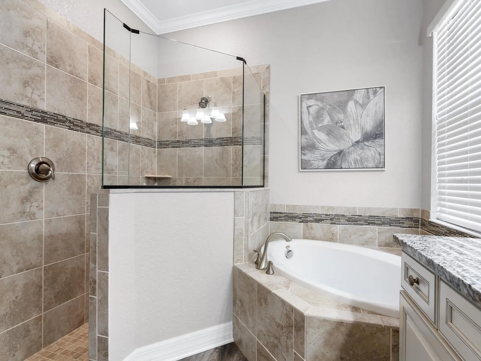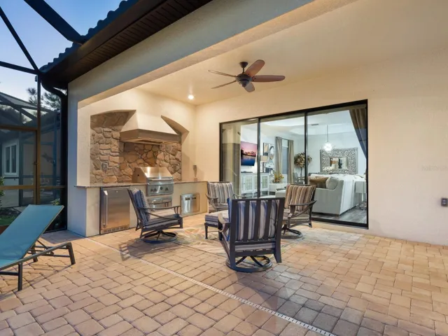 Exquisite and effortlessly stylish, this 4 Bedroom, 3 Bath model-quality home is framed by beautiful landscaping and nestled on a premier home site in Hillside at Country Club East at Lakewood Ranch. Once inside you will marvel at the fine array of architectural details from the foyer’s coffered ceiling treatment with crown molding to the rich luxury vinyl flooring throughout. The kitchen is a gourmet dream featuring sleek wood cabinetry with drawers and pullouts, new exquisite hardware, exotic granite counters, granite sink, designer brick backsplash, under cabinet lighting, stainless steel appliances and range hood, chair height island and pantry, all open to the family room making entertaining a breeze. Family room sliders open to heated Pebble-Tec pool with spa and paver deck featuring outdoor kitchen with hood, storage and refrigerator, the ideal venue for lounging, refreshing and enjoying your spectacular water and vista view. You will look forward to relaxing each evening to the spacious master suite with two suited closets and a deluxe spa-like bath. The 4th bedroom with closet can flex as a den/office with double pocket entry doors. Both guest baths offer wood cabinetry, granite counters and designer tile. Other features include cabinets above washer and dryer with laundry sink, epoxy garage floor and storage racks in garage over car area. Newly painted interior including baseboards and trim. Attractive light fixtures and window treatments throughout.