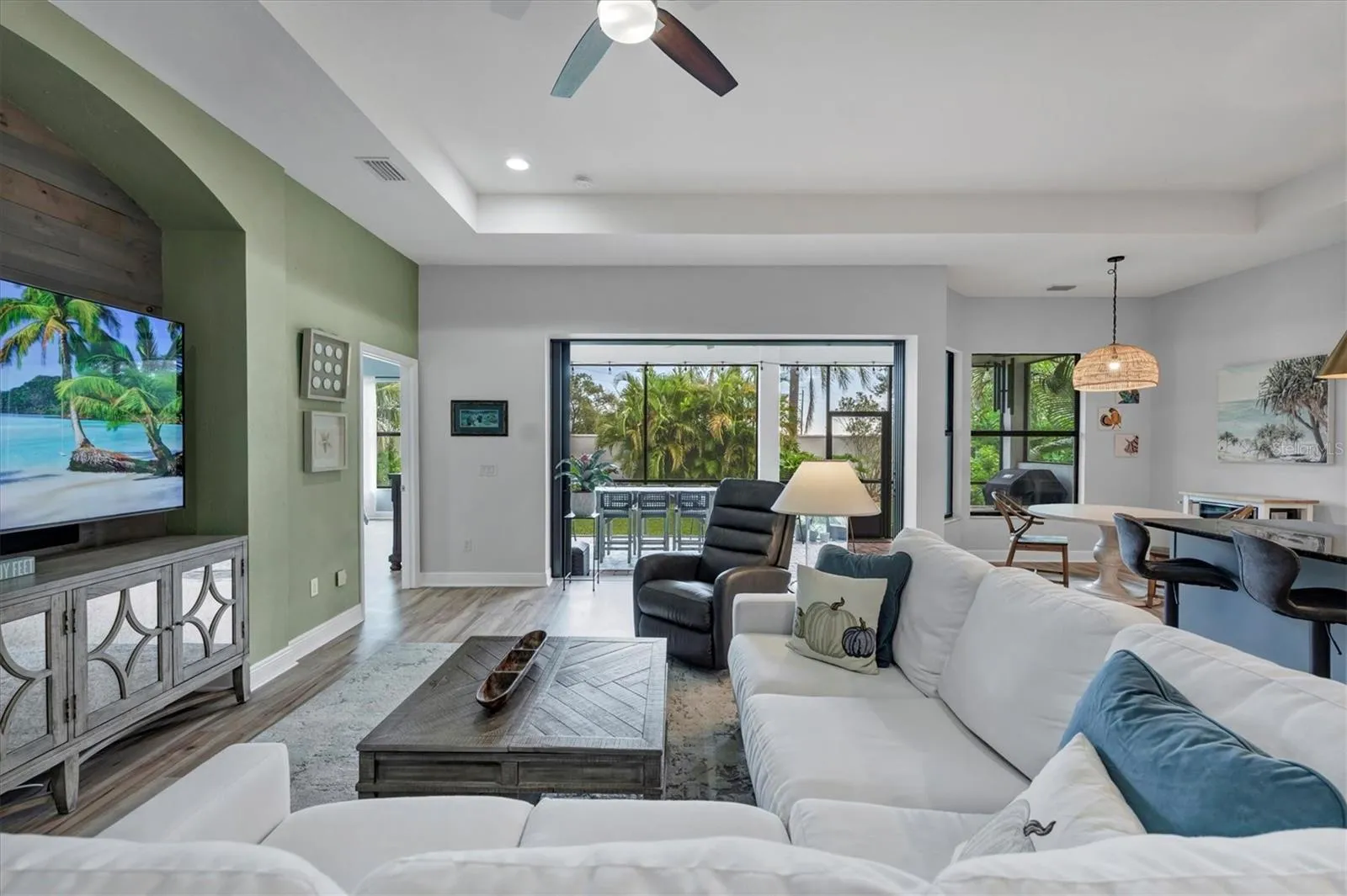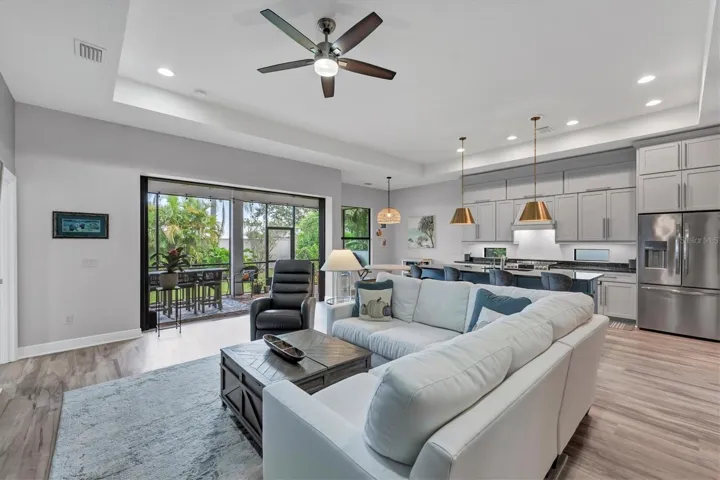 The open-concept kitchen and living room form the heart of the home, creating an ideal setting for both everyday living and entertaining. From this central space, sliding doors open to a large lanai overlooking a private backyard, blending indoor comfort with outdoor enjoyment.