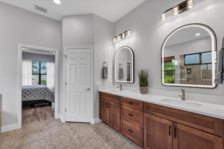 The primary suite is a true retreat, featuring generous proportions, a spa-like bathroom with a walk-in shower and soaking tub, and a walk-in closet designed to accommodate two. Two additional bedrooms offer comfort and flexibility for family or guests.