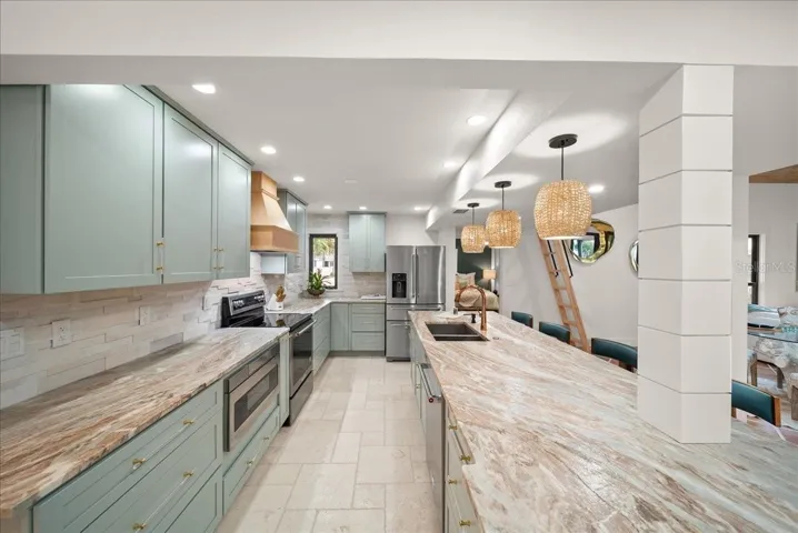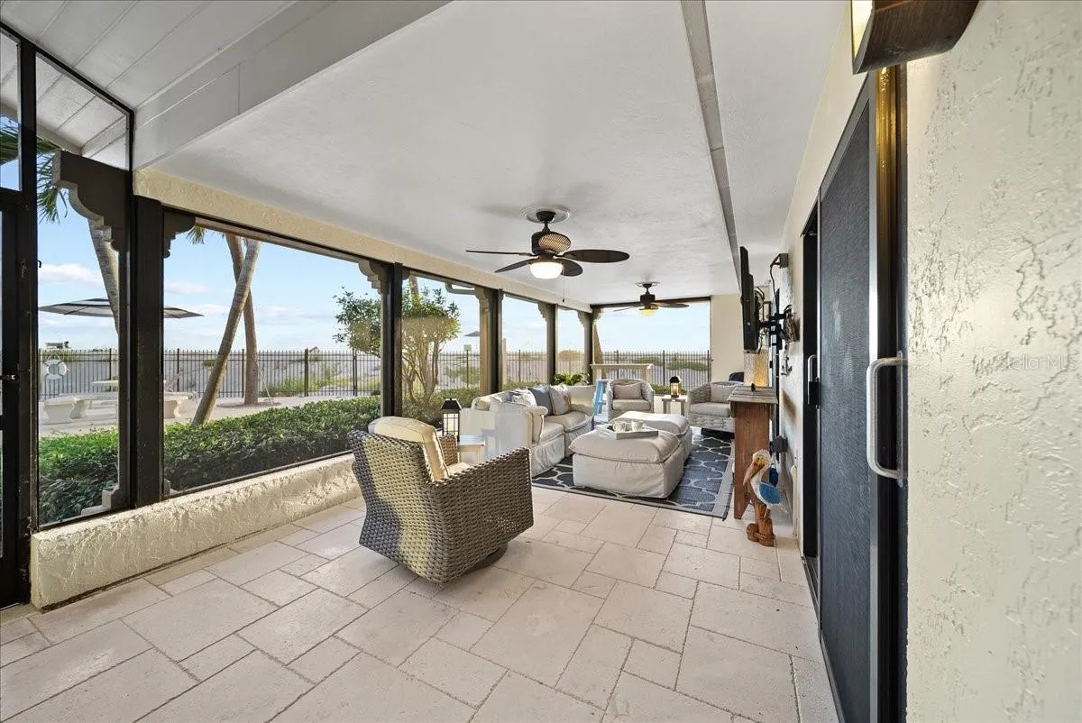 One or more photo(s) has been virtually staged. A Reimagined Gulfside Retreat at Golden Beach. This direct beachfront residence at 718 Golden Beach Blvd #1 redefines coastal living. Encompassing 2,252 sq. ft. with 3 bedrooms, 3 bathrooms, and a loft, the home has been fully renovated with thoughtful detail. Designed for those dreaming of a seasonal getaway or serene year-round sanctuary, this one-of-a-kind condominium lives like a private single-family home while offering the ease of beachfront living. With the Gulf as your backdrop, every moment here feels like a page out of a coastal lifestyle magazine. Inside, elegance meets practicality. Chipped-edge travertine floors guide you to a kitchen with soft coastal tones, new cabinetry, leathered stone countertops, custom pantry shelving, and brand-new stainless KitchenAid appliances with reverse osmosis. The open layout keeps the space as tranquil as the views beyond. The living room unfolds past the kitchen with vaulted Radiata Pine ceilings, terracotta porcelain tile, and a striking wood-burning fireplace. A soon-to-be-installed hurricane-impact picture window frames Gulf sunsets while flooding the room with natural light. Above, a loft accessible by a rolling ladder now has central heat and air, creating a year-round cozy retreat for guests. The primary suite continues the coastal palette with a shiplap accent wall, adorned pendent lights, and sliding doors to the lanai. Directly across from the bed, a new hurricane-rated window is being installed to capture unobstructed Gulf views without leaving your pillow. The ensuite bath has been completely transformed with an oak vanity, granite counters, and a luxurious walk-in shower with pebble stone flooring. A spacious walk-in closet leads to the newly envisioned laundry room, now equipped with a new washer and dryer as well as central heating and air for comfort. Here, large bay windows fill the space with natural light, while a coffee bar, including a wine and beer storage, beverage fridge, and ice maker, creates a space as practical as it is beautiful. A remodeled guest bath features granite counters, new cabinetry, tiled shower, and shiplap. The adjacent bedroom has lanai access and a bright, inviting feel. A third bedroom off the kitchen offers a private suite with full bath, patio entrance, and quick access to the resort-style pool. The lanai seamlessly connects indoors and outdoors—perfect for grilling, laughter, and sunsets. Steps away, the resurfaced pool and private gated beach entrance make relaxation effortless. With few primary residents, Ocean Sands feels like your own enclave by the water. Upgrades include all-new electrical wiring, a brand-new flat roof, and a new elevator in the main building. Offered mostly turnkey furnished with ample parking, it’s move-in ready. The remodeled storage room with built-in cabinets and an outlet can easily convert to a golf cart garage. For peace of mind, the home also features updated wiring with an additional breaker panel, a raised AC unit, and a new tankless water heater. Beyond this coastal sanctuary, Venice offers oceanfront dining at Sharky’s or Fins, Paw Park dog beach, boutique shopping, cafés, and farmers markets on historic Main Street. Nearby hospitals, golf, cultural events, and natural parks make every day an adventure. This home is more than a residence—it’s a lifestyle of quiet luxury and coastal ease. Discover why Golden Beach is the epitome of Endless Summer Living. See virtual tours under the facts & features section.