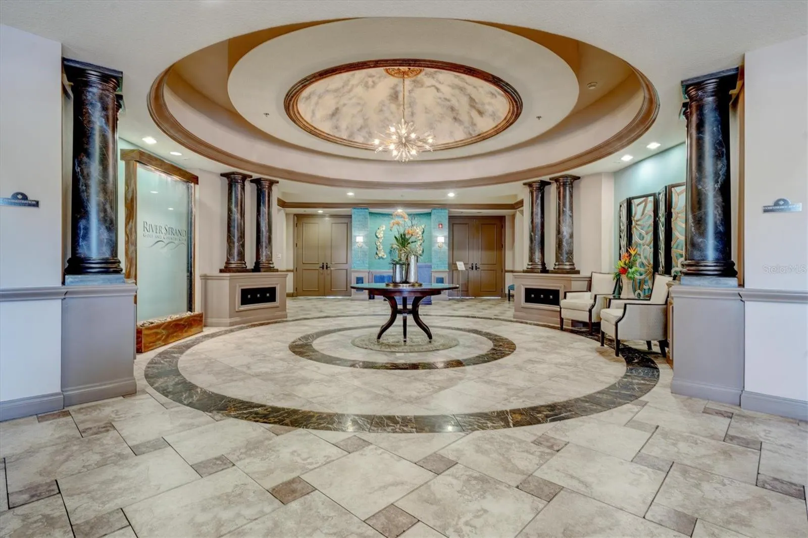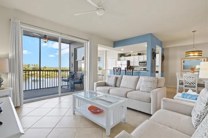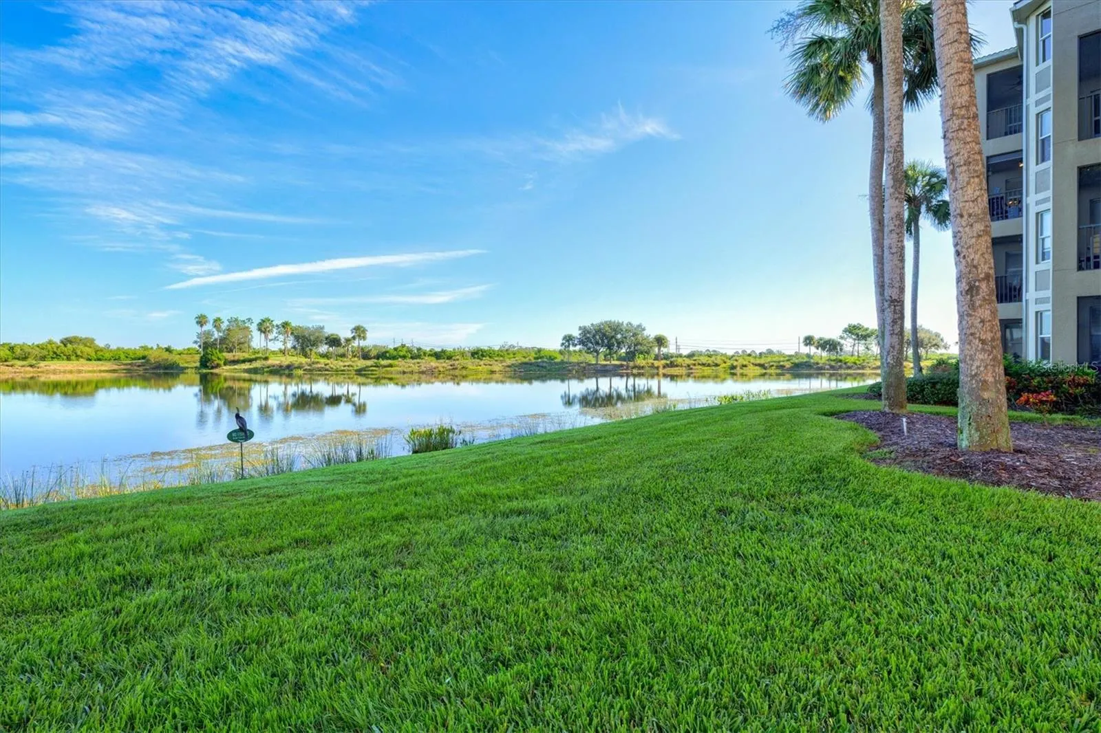 Enjoy sweeping third-floor views of the water and golf course from this fully furnished 2, bed, 2 bath condo in River Strand at Heritage Harbour. Soak in the Florida lifestyle with a screened lanai that provides the perfect place to relax and unwind. The kitchen is open to the living room and features an eat-in dining area as well as breakfast bar. White cabinets and granite countertops combined with stainless steel appliances provide a modern aesthetic. The primary suite features an en-suite bath and dual closets. Both bedrooms have been upgraded with luxury vinyl plank flooring, and the open floor plan allows natural light to fill the living areas. This condo includes full size washer and dryer and all furniture along with basic kitchen necessities and linens, making move-in day a breeze. Note that this is one of the few units with an oversized storage closet, adding coveted storage space for golf clubs, bicycles, beach chairs, etc. Ownership includes a full golf membership, granting access to the 27-hole championship course as well as tennis and pickleball courts, resort-style pools, and a modern fitness center. The River Strand Golf and Country Club is currently undergoing an $8.5 million renovation, focusing on upgrades to the golf courses, clubhouse, and dining facilities. Even during these enhancements, members enjoy regular access to a variety of pools, athletic courts, casual and formal dining, and vibrant social programming. The community is ideally positioned close to daily shopping, healthcare, and dining, with the sandy beaches of Anna Maria Island just a 30-minute drive away. Sarasota-Bradenton International Airport can be reached in under 30 minutes, and quick access to I-75 connects the neighborhood to downtown Bradenton, Sarasota, Tampa and other Gulf Coast destinations.