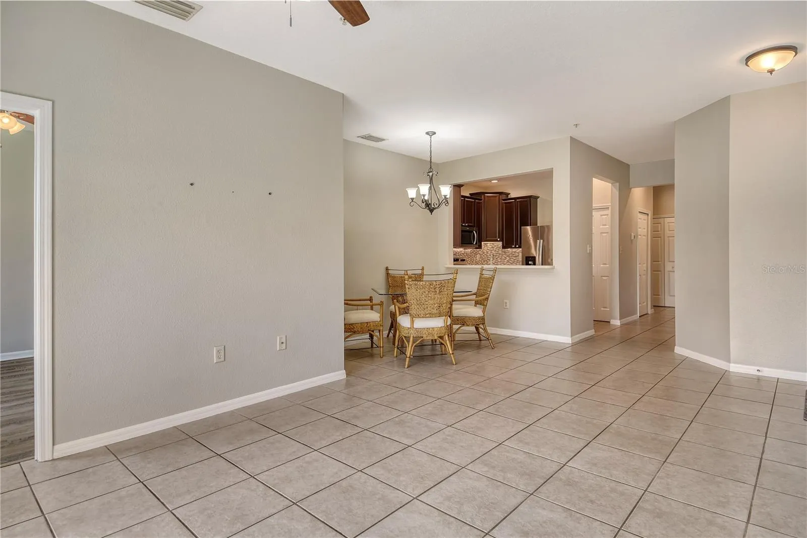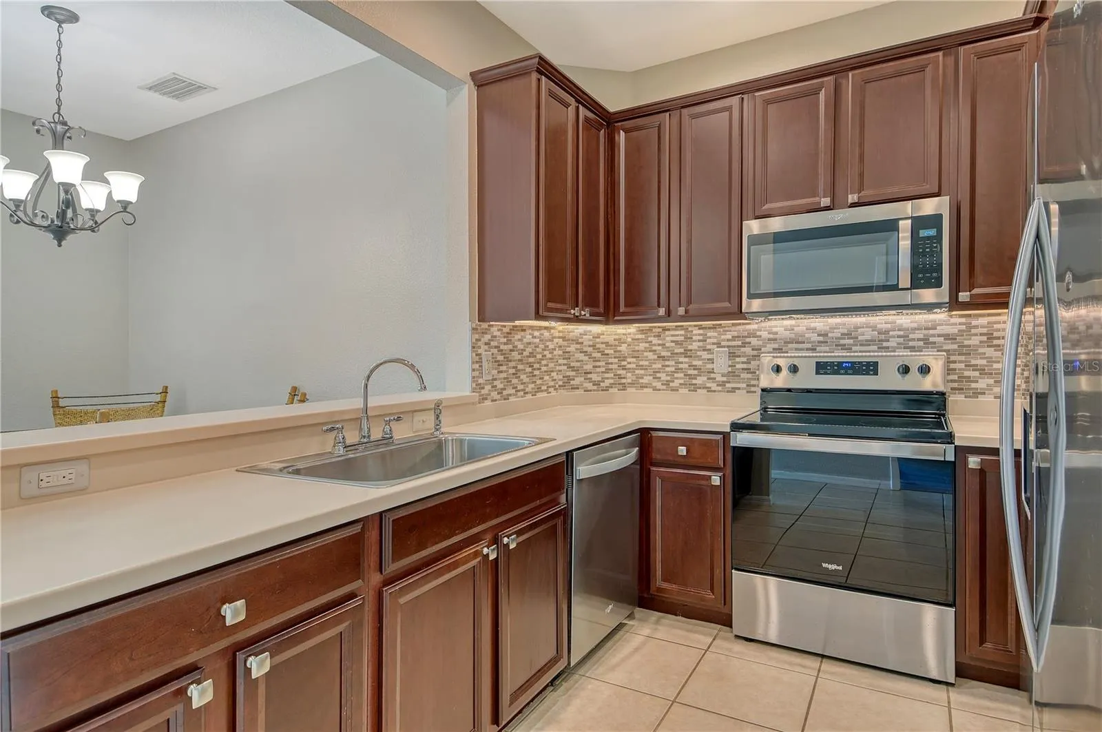 The home showcases 16″ x 16″ ceramic tile flooring throughout the main living areas, complemented by new luxury vinyl plank flooring in all bedrooms. The well-appointed kitchen features rich dark maple cabinetry, Corian countertops, a breakfast bar and undermount lighting—perfect for culinary enthusiasts and entertaining. A full suite of Whirlpool appliances and a Samsung washer and dryer are included for your convenience.