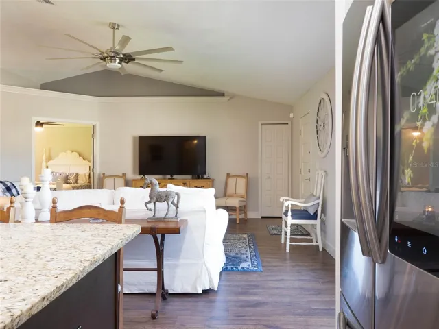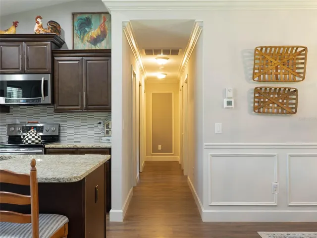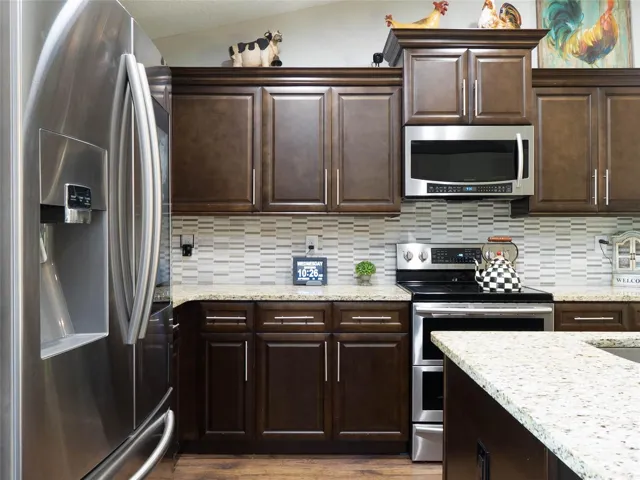 The spacious kitchen features stainless steel appliances, a large breakfast bar and plentiful wood cabinets that overlook the main living area- ideal for entreating and casual family meals.