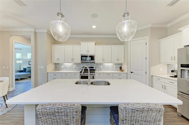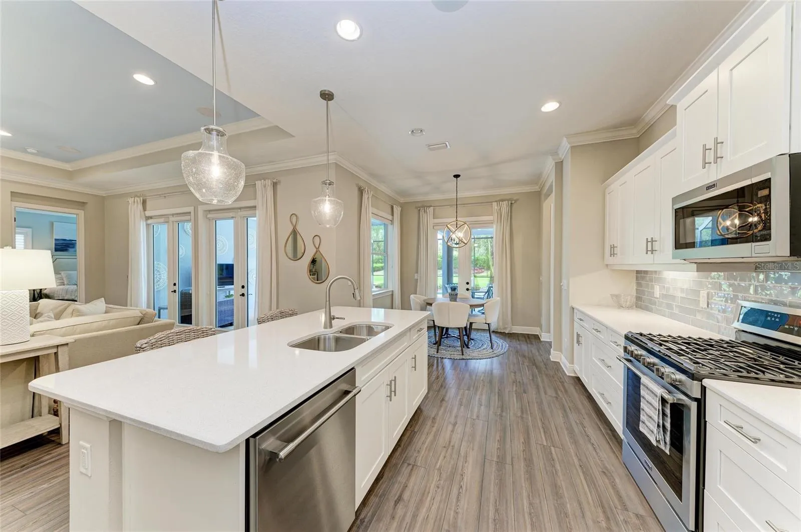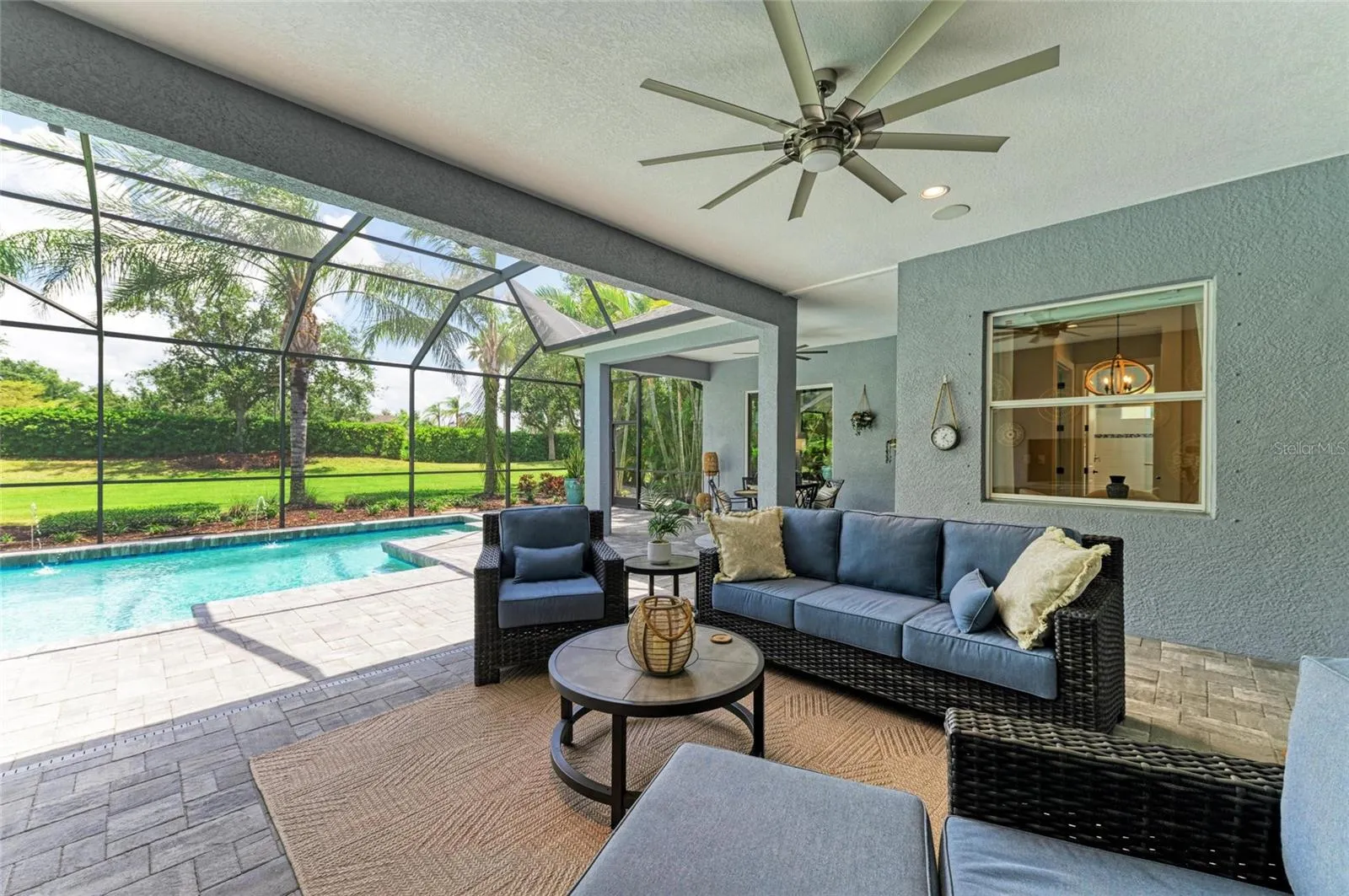 Situated on an oversized lot, with private views, this beautifully upgraded and meticulously maintained Neal built Harmony floor plan offers the perfect blend of luxury, functionality, and resort style living. Located in the maintenance free and privately gated area of Central Park in Lakewood Ranch, the home offers an open floor plan, numerous upgrades, a private back yard – no rear neighbors, heated saltwater pool, and an oversized outdoor living area. The 3-bedroom, 3-bath, 3 car garage, pool home, has a spacious and functional floor plan designed with comfort and style in mind. As you enter the home you’ll be greeted by the open front porch that provides ample space for relaxing and having that casual conversation with the neighbors. Enter the home and begin to enjoy open-concept living! The oversized great room features a tray ceiling with canned lights, ceiling fan, crown molding, ship-lap feature wall, luxury vinyl flooring, and 3 French doors leading to the lanai. Adjacent to the great room is the spacious dining room featuring crown molding, luxury vinyl flooring and updated chandler. To the rear of the great room is the bright, modern kitchen with all new stainless steel appliances, corner pantry, cabinets with roll out shelving, oversized island with new lighting, new kitchen sink and faucet, new tile backsplash with under-counter lighting and luxury vinyl floors. The large primary suite offers a tray ceiling, crown molding, plantation shutters, new carpeting and a ceiling fan plus an renovated spa-like en-suite bath which features new tile floors, new tile 9 ft. shower, corner soaking tub, separate vanities with new lighting and 2 walk-in closets with custom California Closets shelving. The private den/family room combo features 5 ft. double glass doors, luxury vinyl floors, crown molding and a slider that leads you out to your own backyard oasis ideal for relaxing or hosting gatherings year round. The large covered/screened in private lanai with sparkling heated in-ground saltwater pool with new pavers, an outdoor family room w/ceiling fans and gas hook up for the future fire-pit, an outdoor dining area with new ceiling fan, gas and electric hook up for your gas grill or future outdoor kitchen. Back inside the house there’s a convenient pool bath with tile shower, tile floors, and updated vanity, countertop, sink, faucet and lighting. Two additional bedrooms each with crown modeling ceiling fans, plantation shutters, new carpet and custom California closets is served by the 3rd bath featuring tile floors, tile tub/shower combo and new lighting. Convenient laundry room features new tile floors, lighting and laundry sink and cabinetry. This home offers, stylish finishes throughout, a beautiful landscaped lot with irrigation and a 3 car garage. Situated in a family-friendly neighborhood offering parks, playgrounds, walking trails, community pool, fitness center, tennis courts, pickle ball courts and adjacent to top-rated schools, this home blends quality craftsmanship, convenience, and Florida charm. Upgrades: 2024: HVAC, front & rear pavers, 2023: Interior paint, 8 ft solid two panel doors, master bath, California closets, interior lighting, ceiling fans, crown molding, door case molding, ship-lap, stainless steel appliances, kitchen backsplash, laundry room, ceramic flooring, carpeting 2022: exterior paint, luxury vinyl throughout home. OWNER IS A ACTIVE LICENSED AGENT
