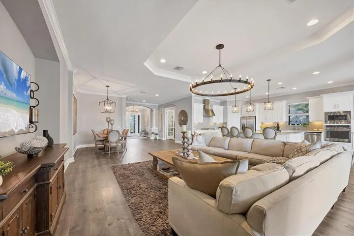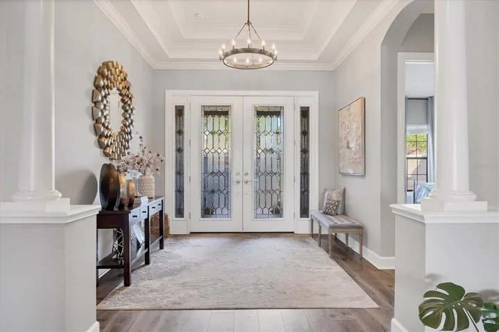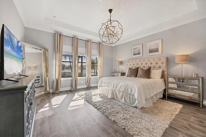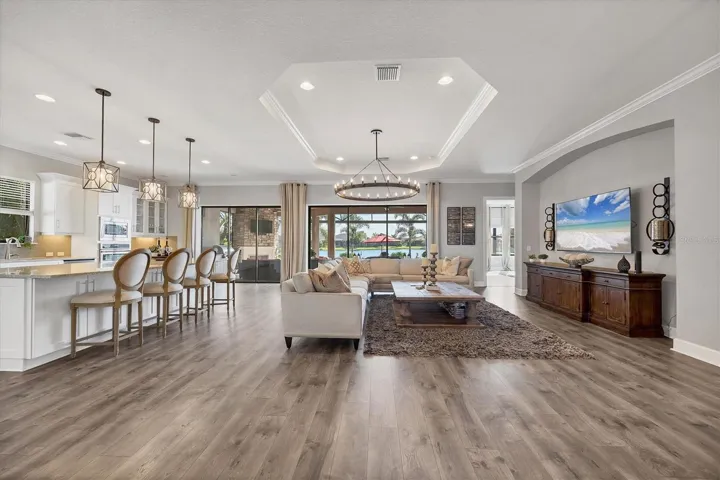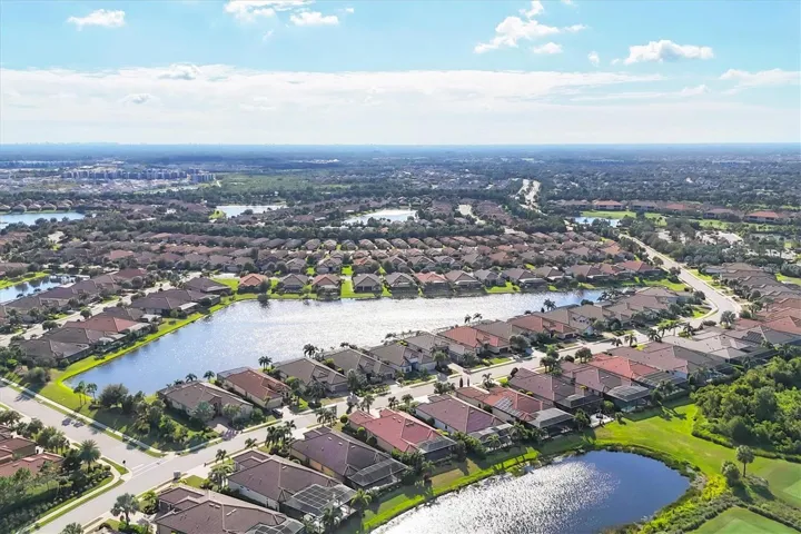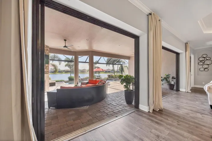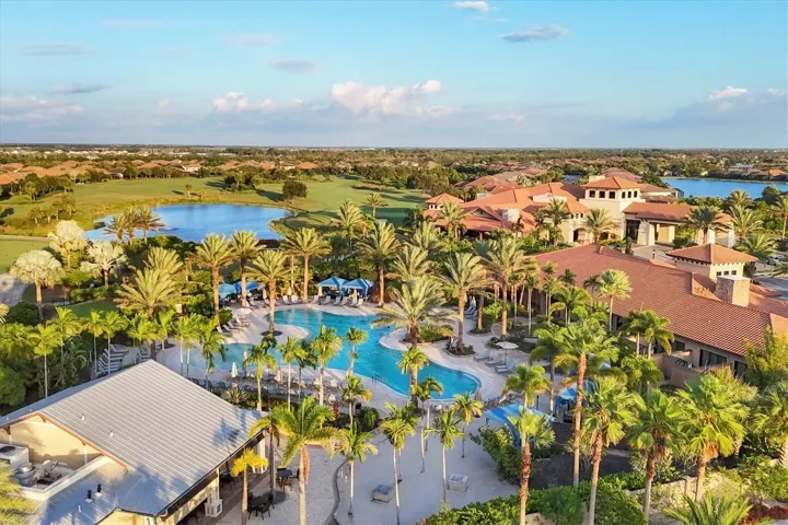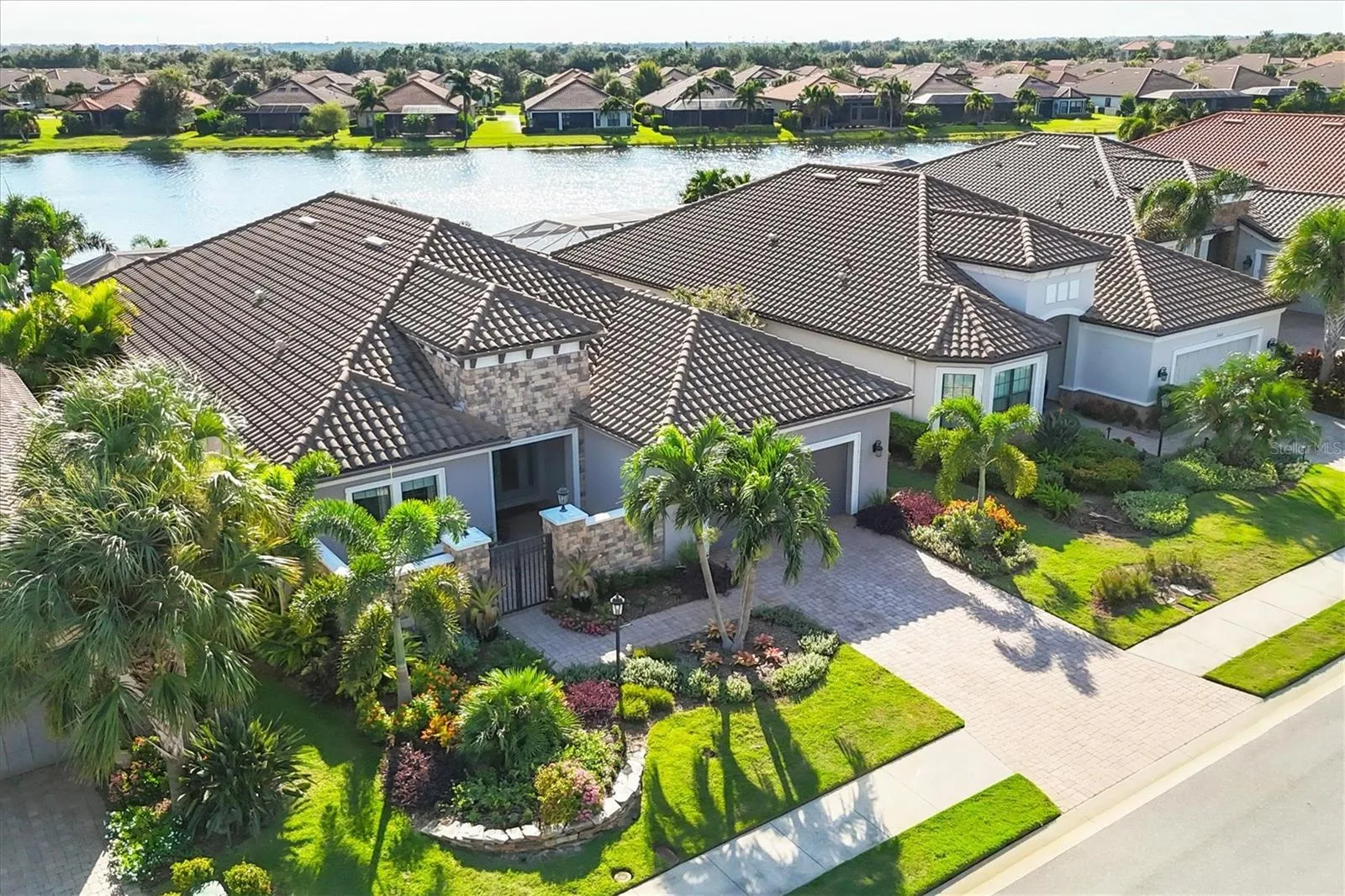 Embrace the ultimate resort-style living in this stunning water view home, featuring the coveted Pallazio VII floor plan with an added nook. This residence boasts an expansive outdoor living space with a gas fireplace, perfect for both relaxation and entertainment, enhanced by Elevation C with a 4 ft garage extension. With a FULL GOLF MEMBERSHIP included, you can enjoy the best of golf and leisure right at your doorstep! As you enter through the charming, gated courtyard and double doors, you will be welcomed by impressive columns and soaring ceilings that set the tone for elegance. The open-concept great room, adorned with crown molding and bathed in natural light from disappearing pocket sliding doors, seamlessly connects to the lanai with breathtaking southwest facing views of the pool and outdoor oasis. The upgraded gourmet kitchen is a chefs dream, featuring stainless-steel appliances including Quartz Cambria countertops, a 36-inch natural gas cooktop, and a built-in oven. The oversized island, highlighted by stylish pendant lighting, offers ample storage and is perfect for entertaining or family meals. Enjoy morning coffee in the extended breakfast area, with sliding glass pocket doors that open to the lanai. Retreat to the grand primary bedroom, a private sanctuary complete with a spacious en-suite bathroom featuring dual sinks, a frameless glass shower, and a large walk-in closet. Two guest bedrooms provide comfort and privacy, one with an en-suite bathroom and the other with convenient access to a separate bath. The generously sized study/den, accessible through elegant 8 ft. French double doors, offers versatility for work or can easily be transformed into a fourth bedroom. Step outside to the extended screened lanai, where the expansive paver deck and endless water views invite you to soak up Florida’s sunshine. With a wealth of community amenities, including an 18-hole championship golf course, tennis and pickleball courts, two resort-style pools, and a full-service spa, you will never run out of things to do. Enjoy fine dining at the Barrel House Bistro, or casual meals at the Bahama Bar, along with an active social calendar filled with events. Located in award-winning Lakewood Ranch, you are just moments away from shopping, dining, local farmers? markets, scenic trails, and beautiful beaches. Don’t miss your chance to own this meticulously designed home in one of Florida’s premier communities, schedule your showing today and step into your dream lifestyle! GREAT ROOM AND PRIMARY BEDROOM LIGHT FIXTURES DO NOT CONVEY.