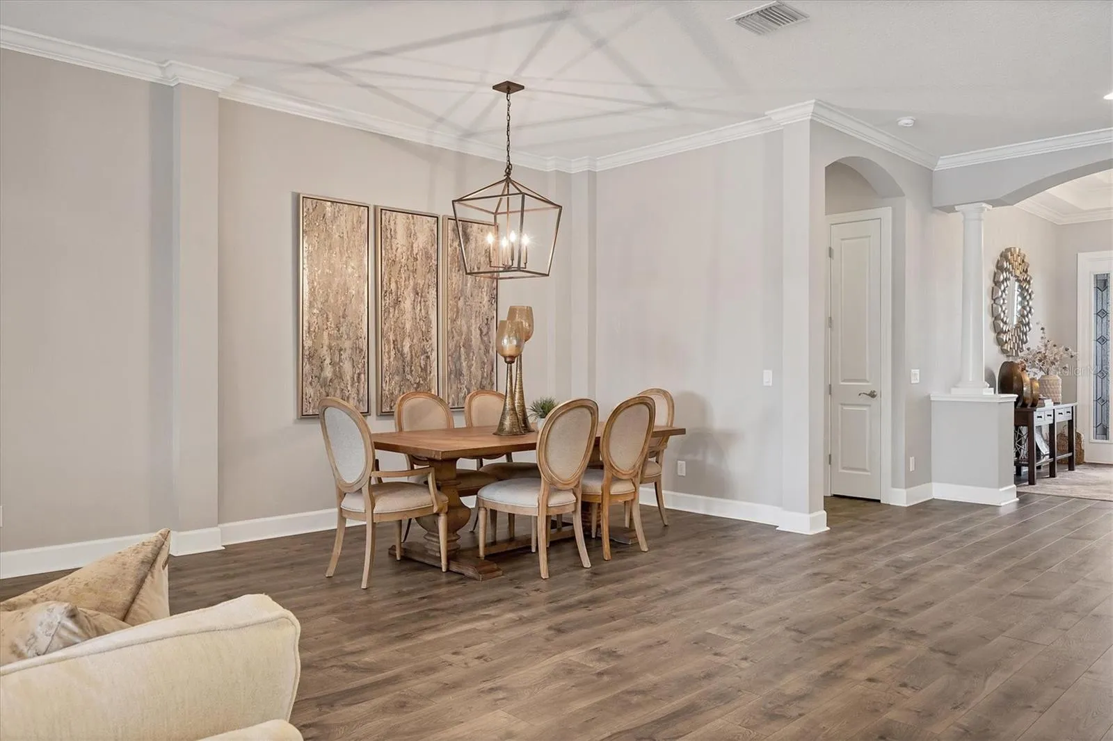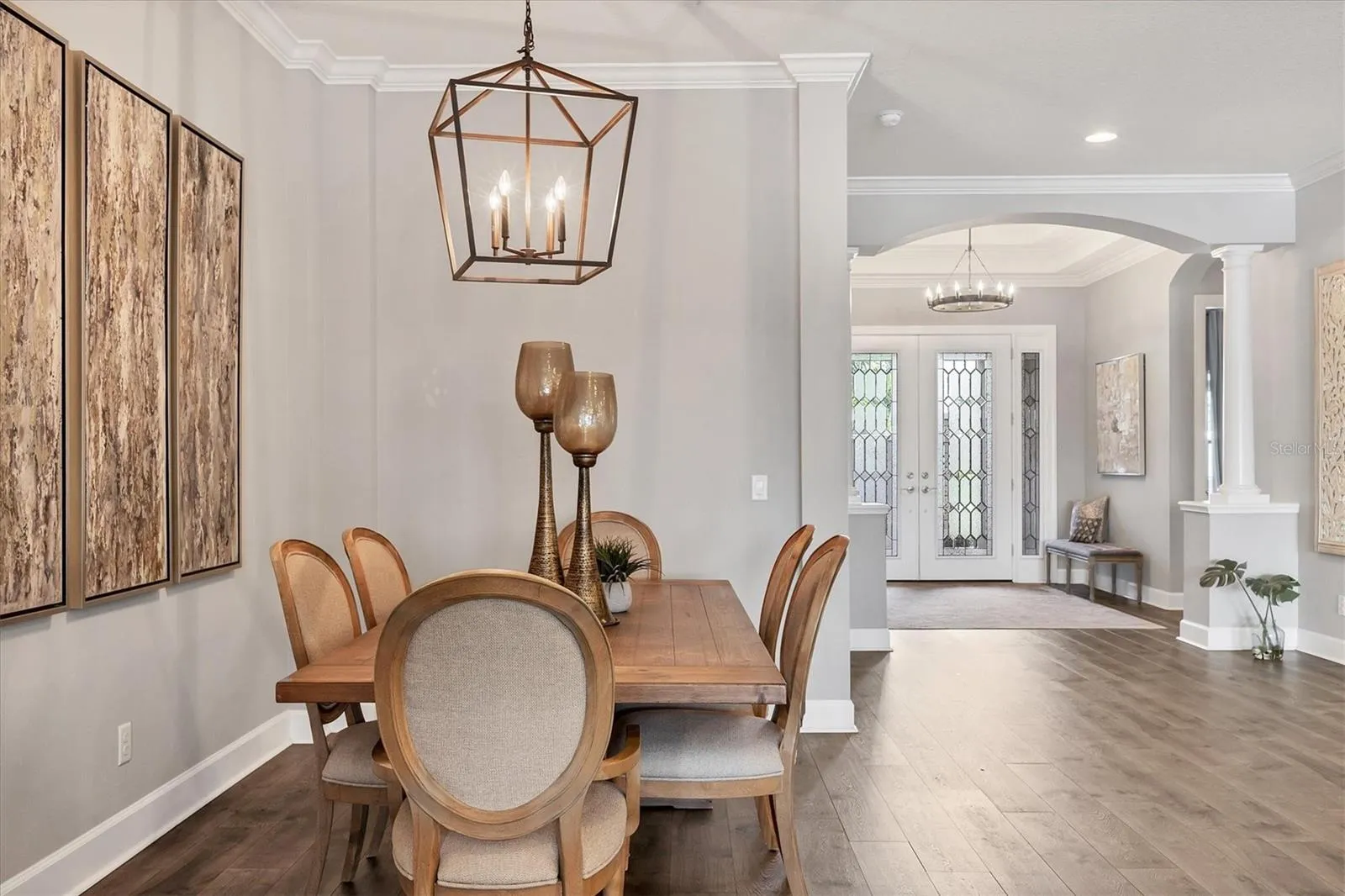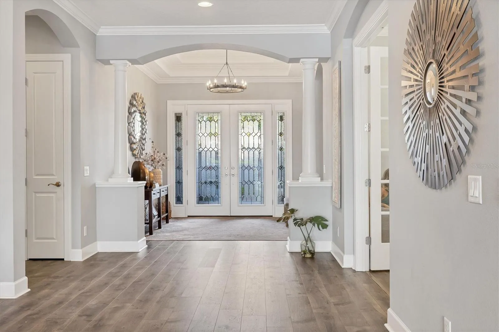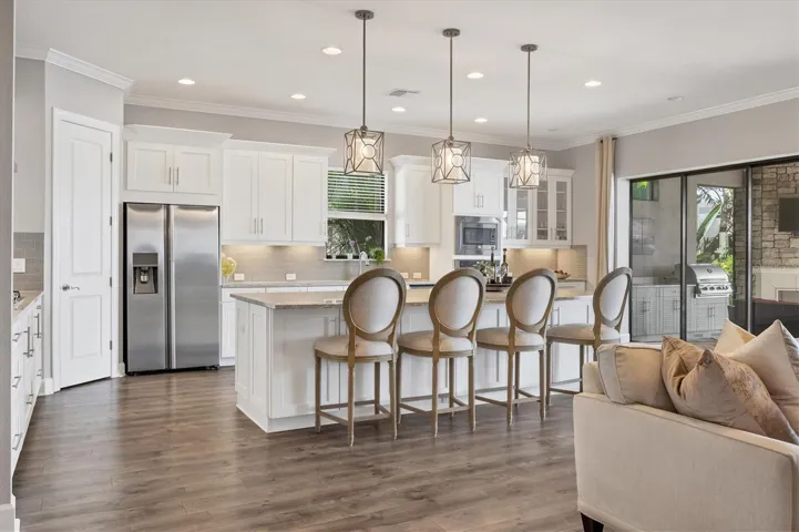 Embrace the ultimate resort-style living in this stunning water view home, featuring the coveted Pallazio VII floor plan with an added nook. This residence boasts an expansive outdoor living space with a gas fireplace, perfect for both relaxation and entertainment, enhanced by Elevation C with a 4 ft garage extension. With a FULL GOLF MEMBERSHIP included, you can enjoy the best of golf and leisure right at your doorstep! As you enter through the charming, gated courtyard and double doors, you will be welcomed by impressive columns and soaring ceilings that set the tone for elegance. The open-concept great room, adorned with crown molding and bathed in natural light from disappearing pocket sliding doors, seamlessly connects to the lanai with breathtaking southwest facing views of the pool and outdoor oasis. The upgraded gourmet kitchen is a chefs dream, featuring stainless-steel appliances including Quartz Cambria countertops, a 36-inch natural gas cooktop, and a built-in oven. The oversized island, highlighted by stylish pendant lighting, offers ample storage and is perfect for entertaining or family meals. Enjoy morning coffee in the extended breakfast area, with sliding glass pocket doors that open to the lanai. Retreat to the grand primary bedroom, a private sanctuary complete with a spacious en-suite bathroom featuring dual sinks, a frameless glass shower, and a large walk-in closet. Two guest bedrooms provide comfort and privacy, one with an en-suite bathroom and the other with convenient access to a separate bath. The generously sized study/den, accessible through elegant 8 ft. French double doors, offers versatility for work or can easily be transformed into a fourth bedroom. Step outside to the extended screened lanai, where the expansive paver deck and endless water views invite you to soak up Florida’s sunshine. With a wealth of community amenities, including an 18-hole championship golf course, tennis and pickleball courts, two resort-style pools, and a full-service spa, you will never run out of things to do. Enjoy fine dining at the Barrel House Bistro, or casual meals at the Bahama Bar, along with an active social calendar filled with events. Located in award-winning Lakewood Ranch, you are just moments away from shopping, dining, local farmers? markets, scenic trails, and beautiful beaches. Don’t miss your chance to own this meticulously designed home in one of Florida’s premier communities, schedule your showing today and step into your dream lifestyle! GREAT ROOM AND PRIMARY BEDROOM LIGHT FIXTURES DO NOT CONVEY.