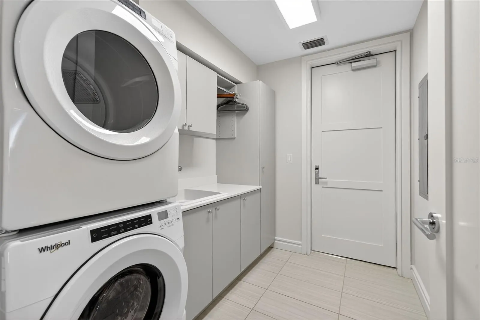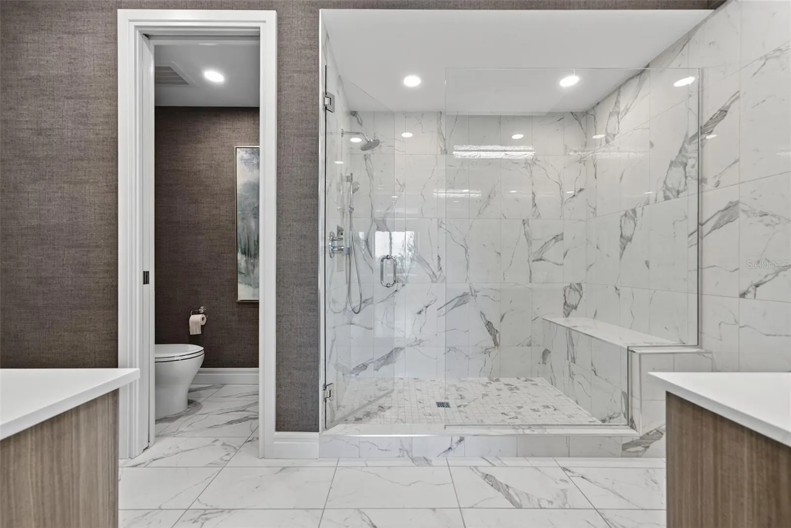 The owner’s suite includes two walk-in closets and a spa-inspired bath, while two additional en-suite bedrooms provide ideal guest or office flexibility. Additional highlights include luxury wood flooring in all bedrooms, a full laundry room with sink, smart-home features, Hansgrohe fixtures, impact-rated windows and doors, and two secured garage parking spaces plus an air-conditioned storage unit.