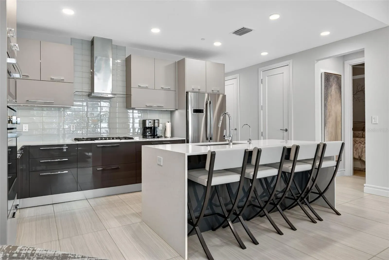A semi-private elevator opens to a bright, open layout with 10-foot ceilings, floor-to-ceiling sliders, and porcelain tile flooring throughout the main living areas. The chef’s kitchen features Bosch appliances, a 5-burner gas cooktop, Cucine Ricci cabinetry, and a Caesarstone waterfall island.