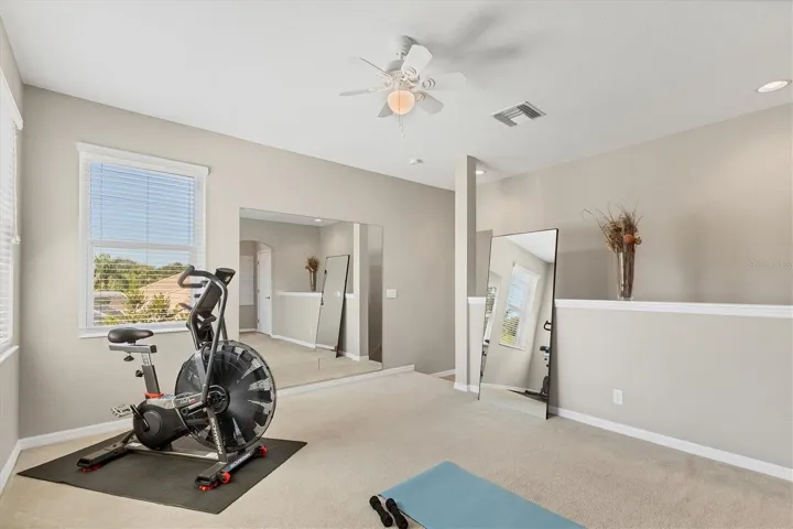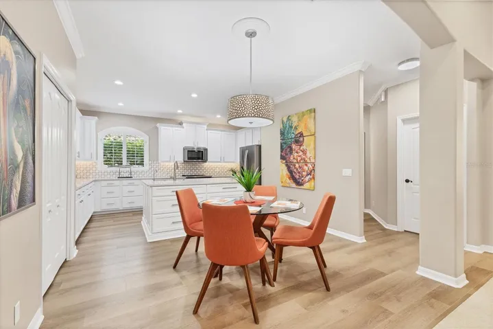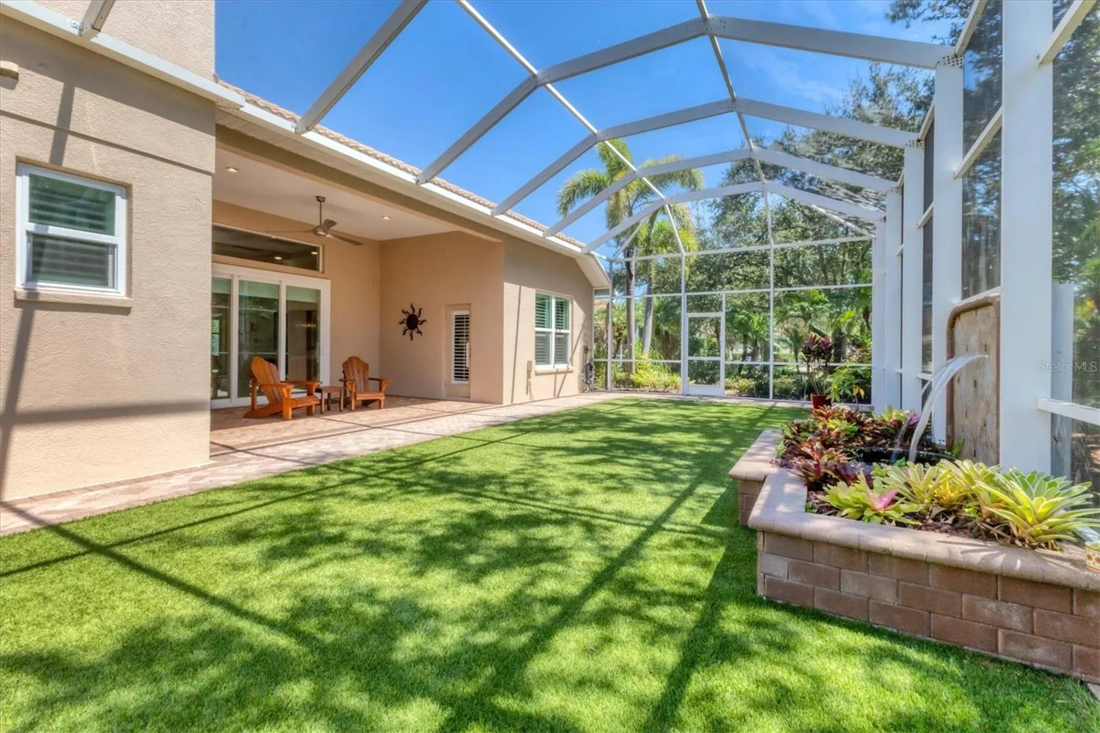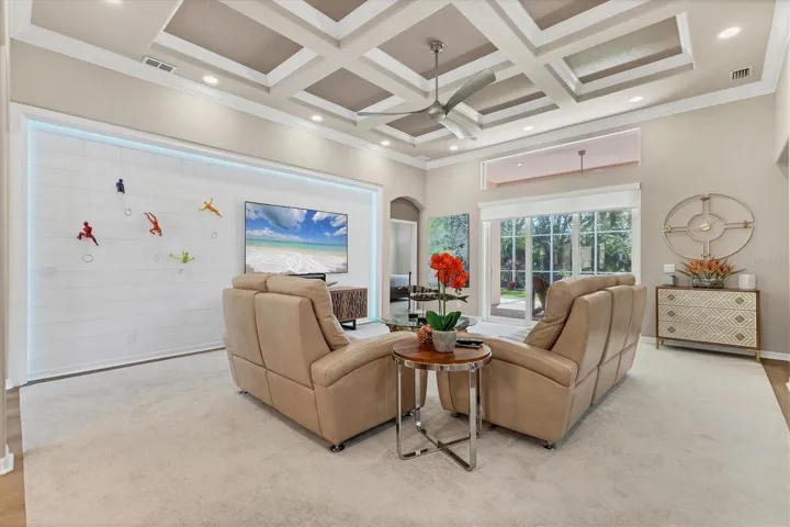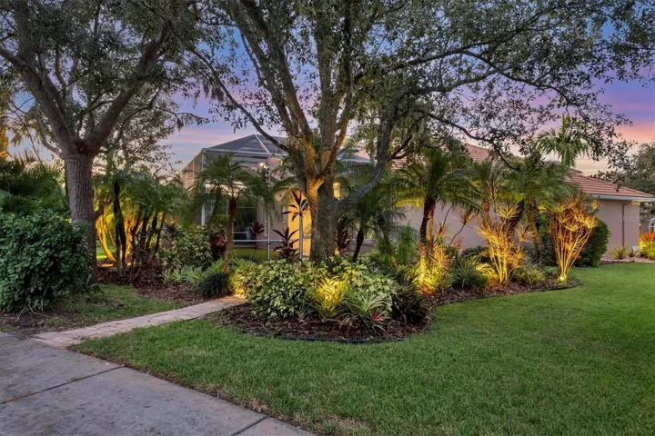 This beautifully updated and tastefully detailed residence in Mote Ranch offers an exceptional lifestyle characterized by both sophistication and comfort. The move-in property showcases a harmonious blend of style, functionality and long-lasting quality through an array of recent enhancements. Remodeled interior finishes and upgraded exterior features have been thoughtfully curated to ensure convenience, elegance and enduring value. Upon entering through custom etched double doors, you are greeted by dramatic, high ceilings, spacious living areas and gracious design elements. With approximately 2,737 square feet, the home provides three bedrooms, three and one-half baths, a den/office and an upstairs bonus room. An expansive lanai, ideally suited for a pool and outdoor grill, features a serene fountain, creating an ideal environment for entertaining guests. Each room is appointed with plantation shutters to enhance privacy, while the great room includes a motorized shade on the sliding glass doors. The residence boasts significant upgrades such as hurricane-rated windows and a remodeled kitchen. Luxury vinyl flooring flows seamlessly throughout the main living spaces, with plush carpeting offered in the bedrooms, den and bonus room. Architectural touches include a 12-foot coffered ceiling in the great room and crown molding that extend throughout the home. The built-in niche in the great room, surrounded by dynamic lighting, allows for multi-color illumination. The kitchen has been updated with elegant cabinetry, a stylish backsplash, and quartz countertops and island. The primary bedroom suite is carpeted and serves as a tranquil retreat, featuring tray ceilings with decorative molding, direct access to the lanai, soaring ceilings, walk-in closets and a generous bath with a soaking tub and glass-enclosed shower. Secondary bedrooms are also carpeted, equipped with ceiling fans and adjoining baths, with the second bedroom offering ample closet storage. The dedicated den/office is fitted with a tray ceiling, double doors and a ceiling fan for comfort and privacy. Upstairs, the versatile bonus room includes a half bath and can accommodate a fitness area or a media and entertainment space. The spacious lanai is perfect for a pool or spa and an outdoor kitchen, making it ideal for gatherings. Exterior enhancements include fresh paint, an updated three-car garage with epoxy flooring, comprehensive guttering, a tankless water tank and a driveway finished with refined pavers. Designed tropical landscaping surrounds the home, presenting a distinguished curb appeal. And much more. Mote Ranch’s River Park community provides numerous amenities, including a junior Olympic pool and dock for kayaking or canoes. There is convenient proximity to the UTC Mall’s shopping and dining, SRQ Airport, Ringling Museum and the region’s renowned beaches.