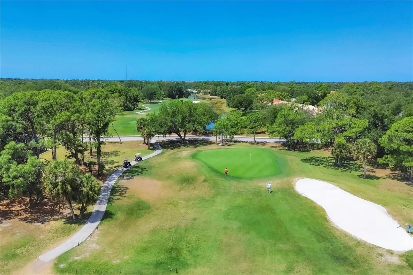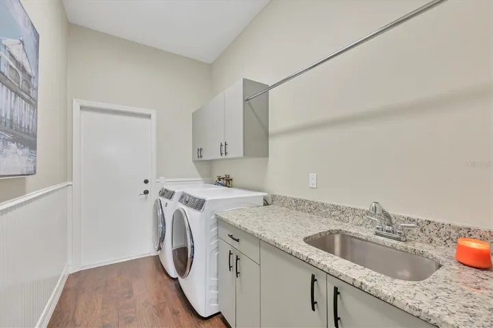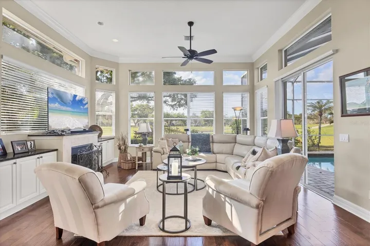 Price Reduction! Welcome to this stunning 4 bedroom/ 3 bathroom updated custom home in the much sought after Calusa Lakes community. Beautiful brick pavers set the tone as you pull up to the exterior of the home. Entering the front door you will see the hickory wood flooring that continues throughout the house, 12 foot ceilings that are framed by painted crown molding. Both the spacious Living & Dining Rooms have been recently painted with custom drapes. The sliding glass doors open up and disappear showcasing the large swimming pool and golf course views. The updated kitchen boasts numerous cream glazed wood cabinets, new quartz counters with spaces for 3 counter height bar stools, newer GE Cafe stainless appliances, a side sink/coffee bar. The Family Room is spacious and highlighted by many windows that flood the room with natural lighting. A side door leads out to a small patio that is used for grilling. The bright & airy Primary Bedroom has a tray ceiling as well as sliding glass doors out to the lanai. Two closets complete this relaxing retreat. The spa like updated bathroom has lovely natural wood cabinetry with quartz counter tops. The shower is oversized and is next to a free standing tub & chandelier! The second bedroom in this wing is currently being used as an office and is conveniently across the hall from the pool bathroom. Bedrooms #2 & #3 are in the guest wing off the kitchen and have a door for privacy from the rest of the home. This wing has a full bathroom with a double vanity and walk-in shower. The lanai has brick pavers surrounding the resurfaced heated swimming pool. The southern exposure guarantees afternoon sun for sunbathing, cookouts, and watching the sunset. Great partial lake views along with the 10th green and 11th tee. Membership to the Golf Course is optional. The tennis/pickleball courts are open to all residents as well as the restaurant located in the Golf Pro Shop. This community is close to the Legacy Trail, shopping, Venice Island, I #75, airports, both Nokomis Beach & Venice beach, public boat ramps and marinas. Run don’t walk to see this move-in ready home perfect for full time or seasonal owners. Paradise awaits!