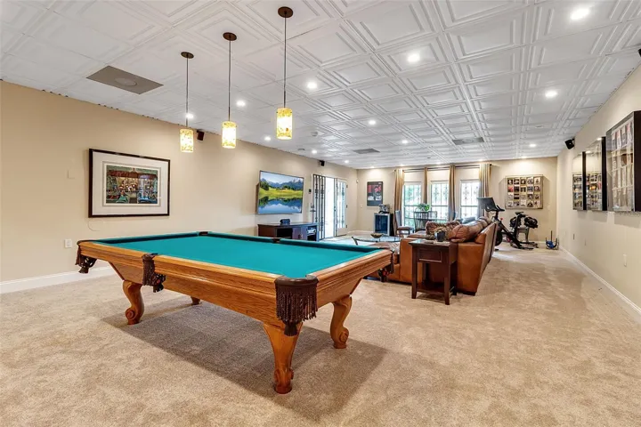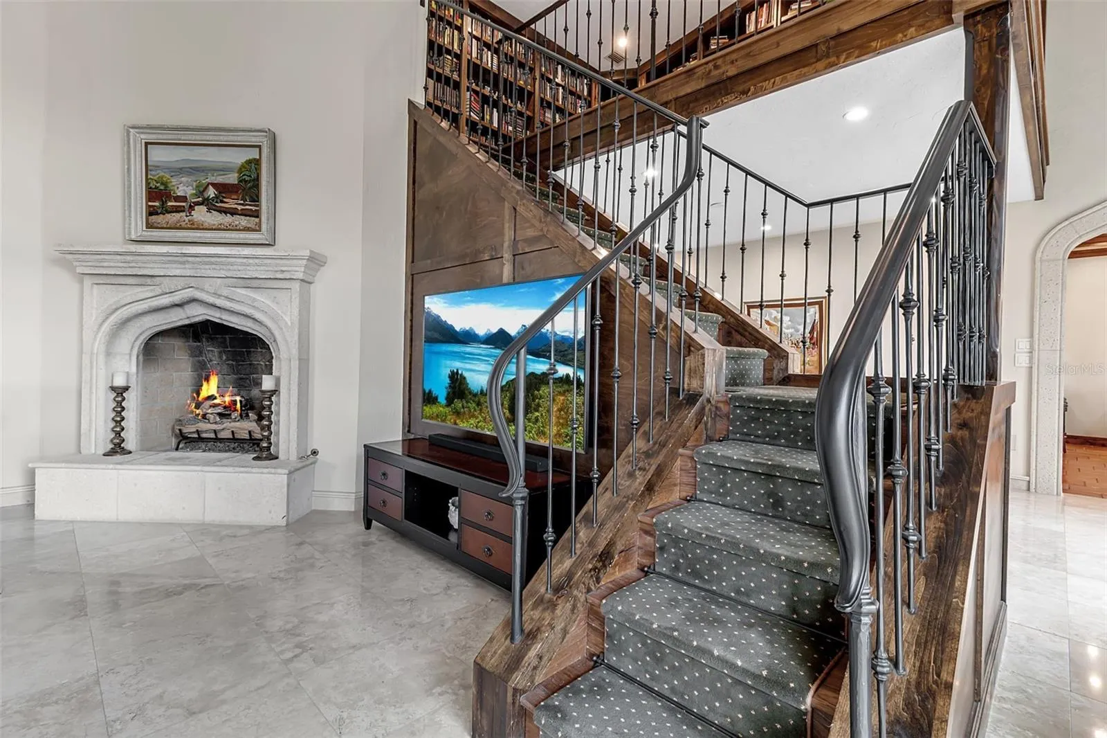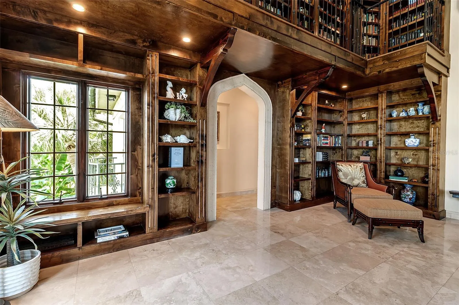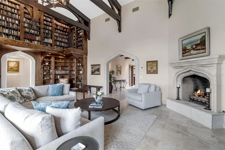 This residence spans 6,827?sq.?ft of air-conditioned living space offering 4 bedrooms, 4 full baths, and 1 half bath. At the heart of the home is the great room, soaring to 20-foot ceilings, commanding sweeping water views, and anchored by a two-story library wall. A gallery and loft overlook the formal dining space, and elegant iron railings and hand-hewn wood trestles bring an artisanal, Old World feel. A hidden wood-paneled staircase adds a dramatic, secretive touch.