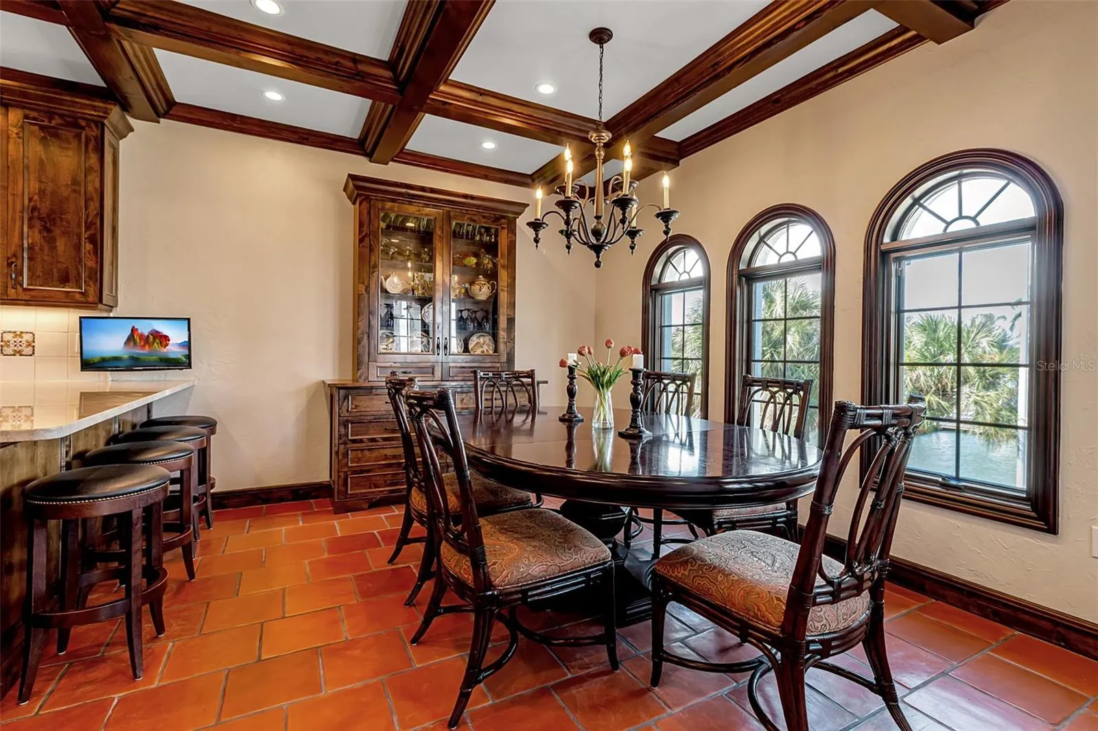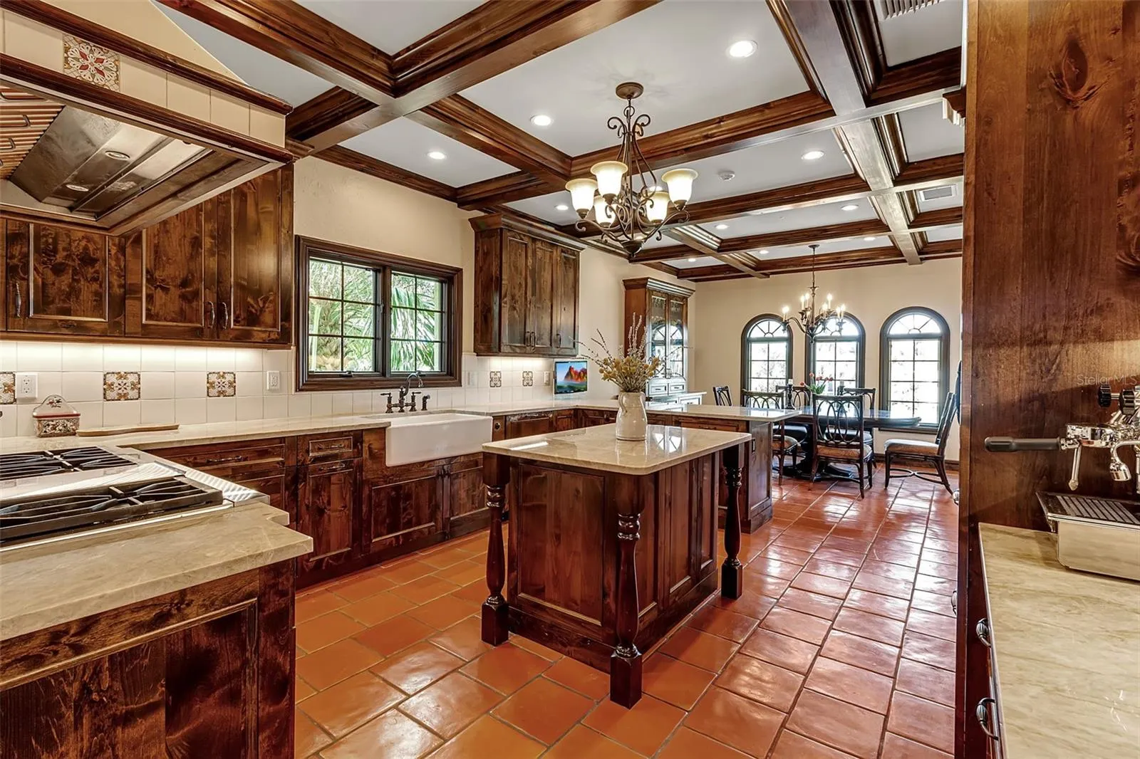 The gourmet kitchen is outfitted with Wolf, Sub-Zero, and Miele appliances, quartzite countertops, a coffered ceiling, a waterfront breakfast nook, and a walk-in pantry. Hand-hewn beams extend throughout the kitchen and lanai, harmonizing the interior and exterior aesthetic.
