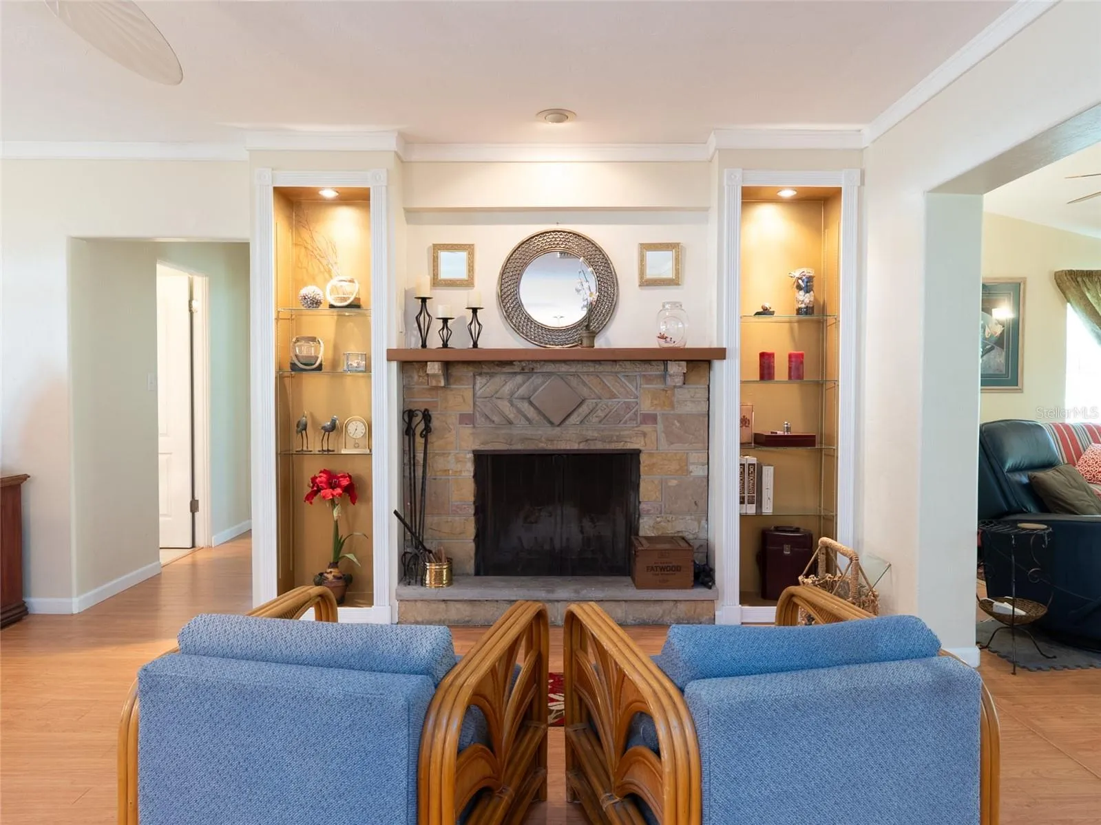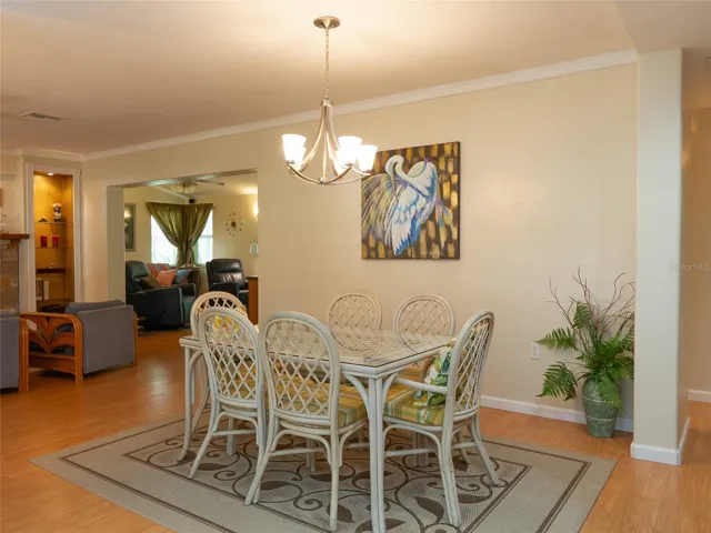Inside the main home, the chef’s dream kitchen includes three ovens, two sinks, and plenty of counter space for prep and serving. A beautiful, inviting front porch with floor-to-ceiling windows fills the home with natural light. The living room boasts a warm brick fireplace with built-in shelving, while a separate TV room with French doors opens to the oversized screened lanai. From the lanai, you’ll enjoy serene garden views that make the outdoor space a true extension of the home.
