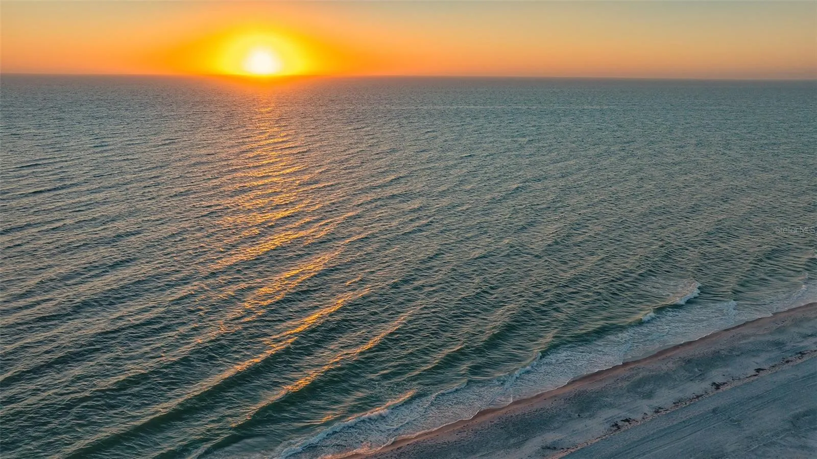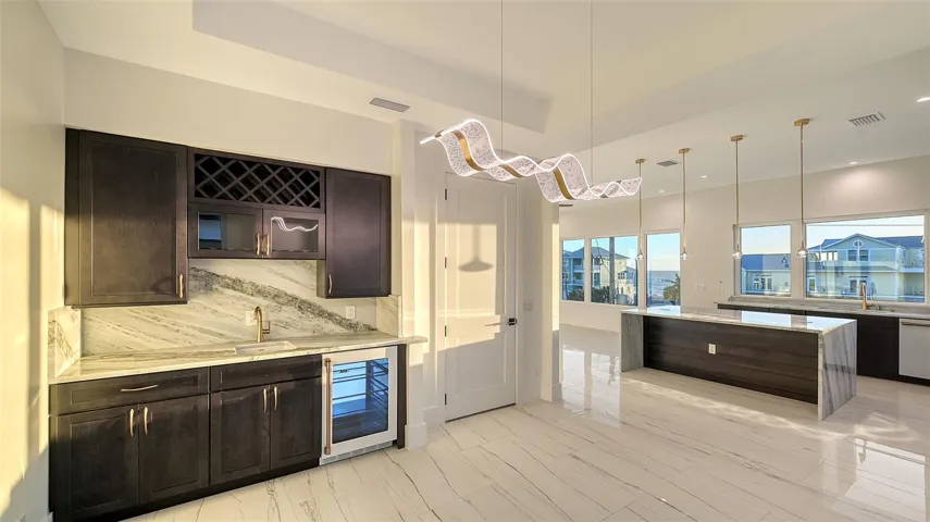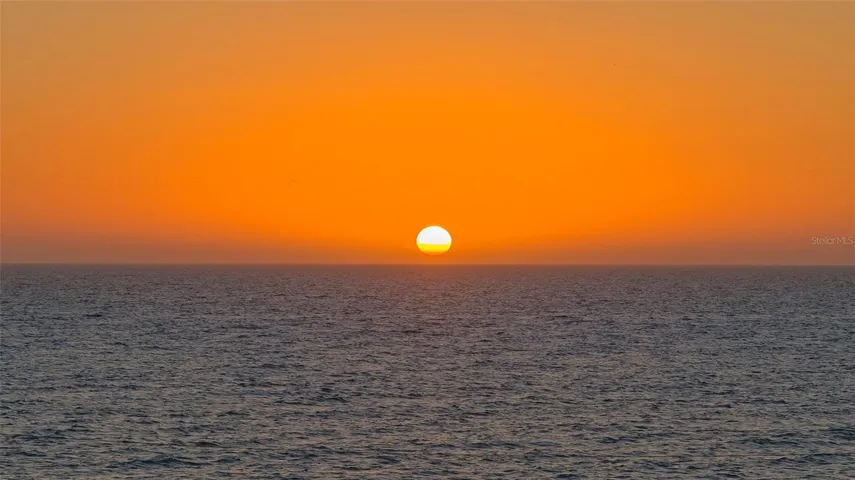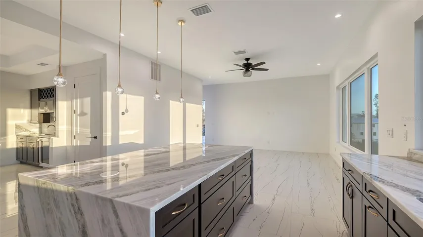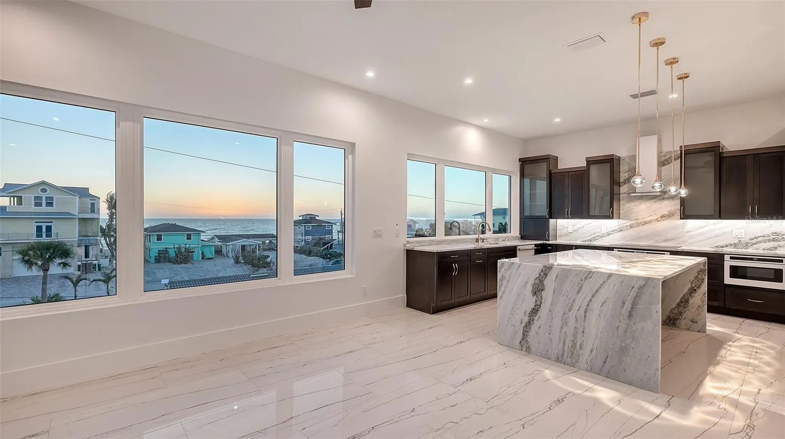 The upper level unfolds in dramatic fashion, with sweeping Gulf and Lemon Bay panoramas framing an open-concept living space. A chef’s kitchen adorned with marble surfaces, Café appliances, and bespoke jellyfish-inlaid pendant lighting anchors the room, while a wet bar with wine fridge elevates the art of entertaining. Expansive sliding glass doors blur the line between indoors and out, extending the living area to a deep west-facing balcony—your front-row seat to the nightly canvas of the setting sun. A secondary primary suite with its own balcony and spa-inspired bath completes this level, offering privacy and sophistication for guests or extended stays.