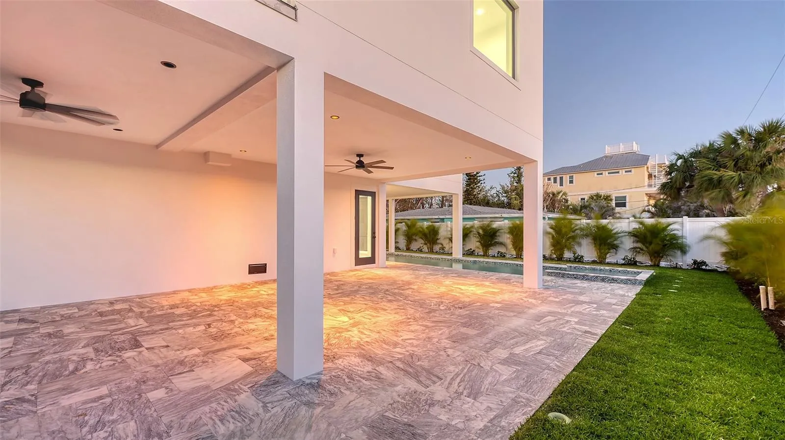 Beyond its West Indies-inspired façade, a breezeway reveals a private outdoor sanctuary: a heated saltwater pool and spa set in sleek travertine, shaded lounging terraces, and a covered patio designed for year-round enjoyment. Inside, the elevated first level hosts five serene bedrooms, including a primary suite with spa-style bath and private balcony, as well as another ensuite retreat with its own balcony overlooking Gulf vistas. Throughout, each of the home’s ample balconies becomes a stage for sea breezes, horizon views, and coastal sunsets, creating intimate escapes and open-air entertaining spaces alike.