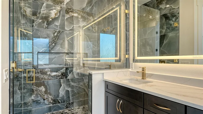 Accessibility meets design with a whole-home elevator, seamlessly connecting the epoxy-finished garage to every floor and the crowning rooftop terrace. From this vantage point, a 360-degree panorama stretches from the Gulf of Mexico to Lemon Bay, ideal for stargazing, sunset toasts, and unforgettable gatherings under the night sky.