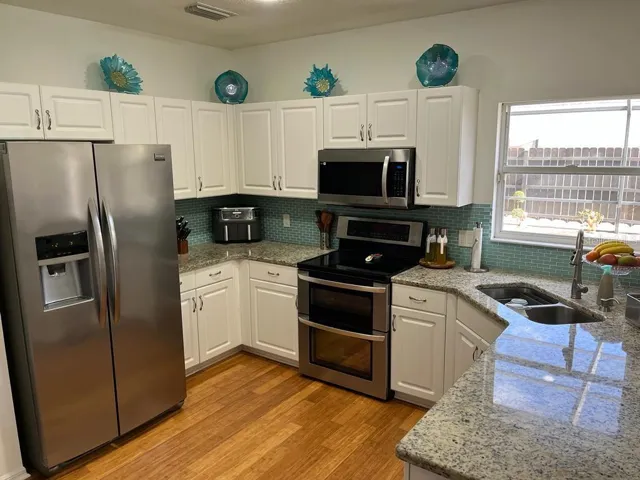 Upon entering the home, you will be greeted with bamboo wood flooring which runs throughout the 1st floor living, kitchen and master bedroom .Fenced backyard with Private Pool with screen enclosure. white kitchen cabinets with granite and a pop of color in the backsplash . There’s a convenient half bath located on the 1st floor for your guests. The 1st floor master bedroom features a view of backyard/pool and features dual sinks, separate water closet, linen closet and walking closet.Loft & 3 bedrooms, Minutes to both I-75 and I-275 so commuting to Tampa, St Pete, Bradenton & Sarasota is a breeze.