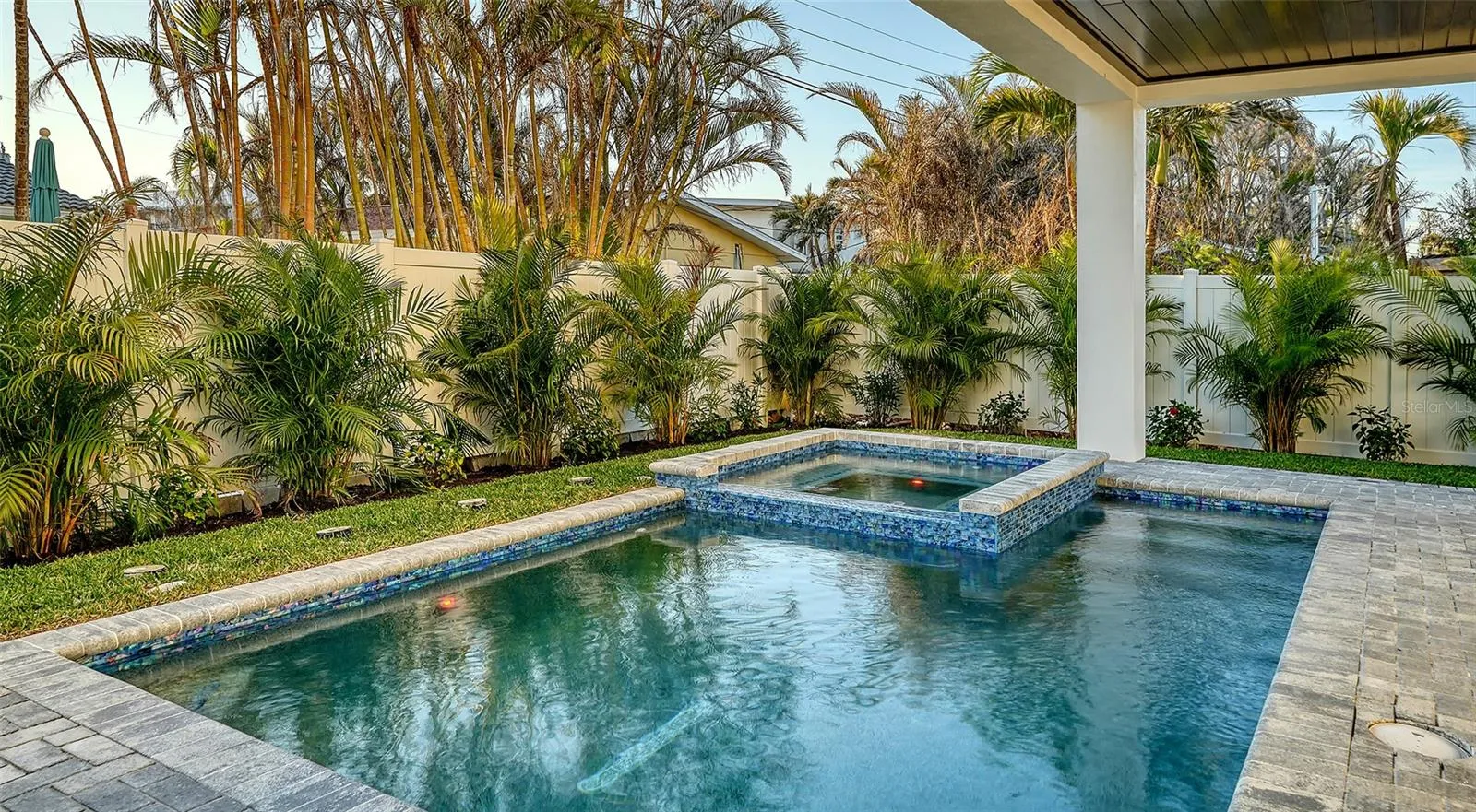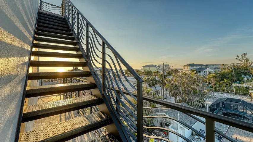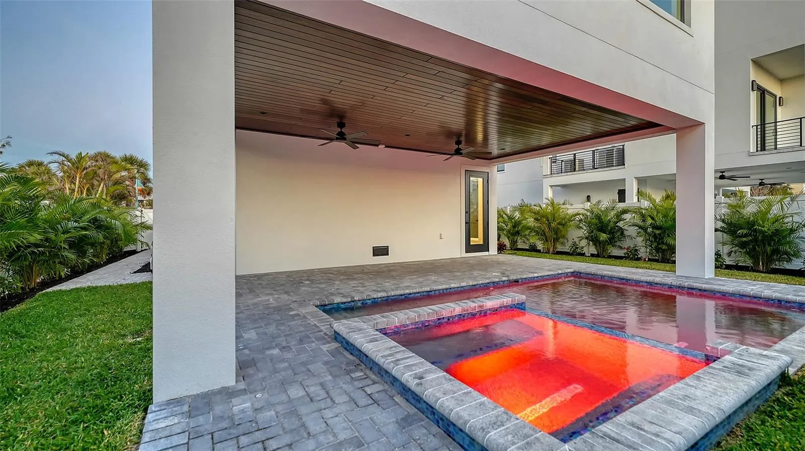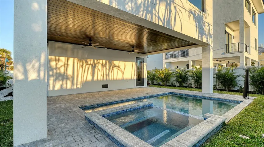 Seamlessly integrating indoor and outdoor living, the residence features a private elevator connecting every level—from the garage to the 48-foot rooftop terrace. There, panoramic views of the Gulf of Mexico and Lemon Bay unfold in breathtaking succession, perfect for savoring sunsets, Gulf breezes, and starlit evenings. At ground level, a covered lounge gives way to the sparkling heated saltwater pool and spa, ideal for year-round relaxation.