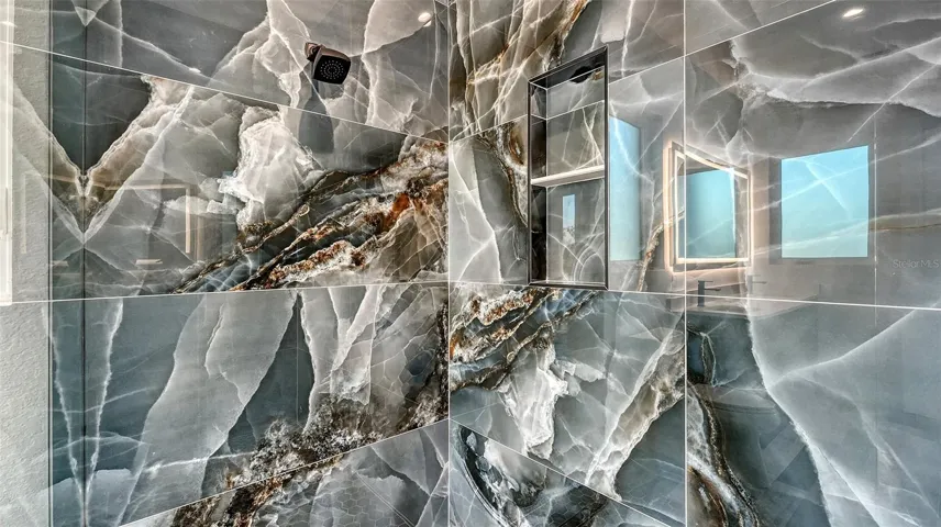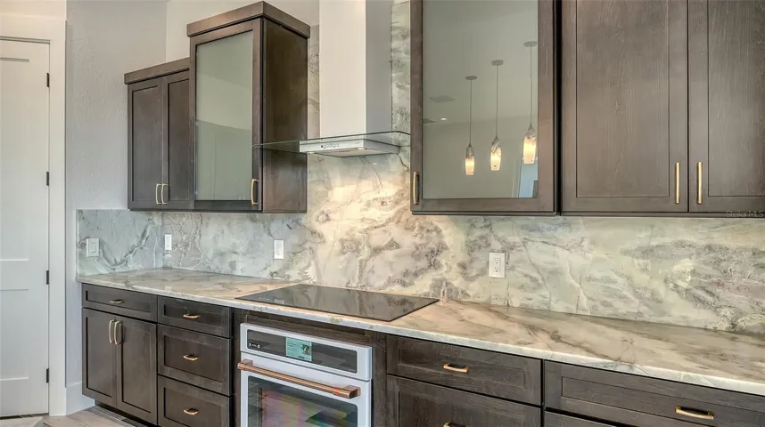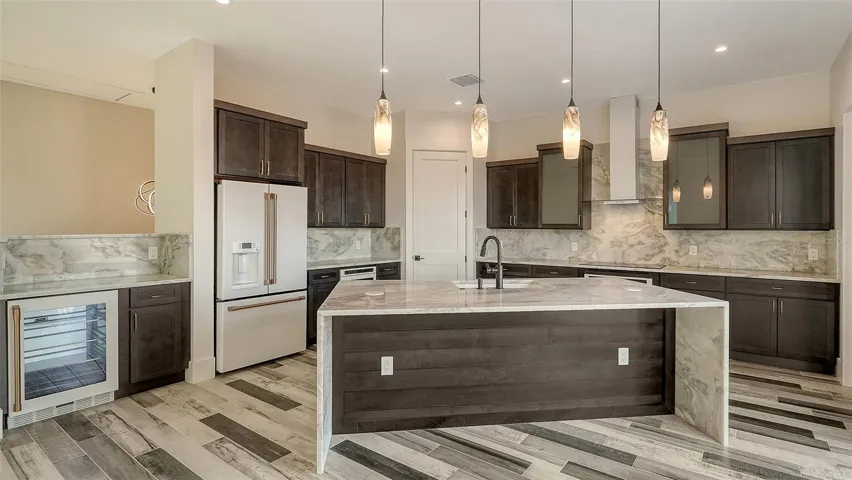 Crafted with all-concrete construction, hurricane-impact windows and sliders, and a sleek metal roof, this coastal haven exudes strength and sophistication. Inside, luminous living spaces with 10-foot ceilings and expansive windows frame sweeping Gulf and Bay vistas, while rich hickory staircases lend warmth to the contemporary design. The chef’s kitchen balances style and function with custom dark pine cabinetry, dramatic waterfall marble countertops, and a premium Café appliance suite enhanced by WiFi and Bluetooth connectivity. An 8×6 butler’s pantry adds ease and elegance to entertaining.