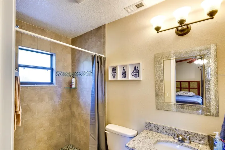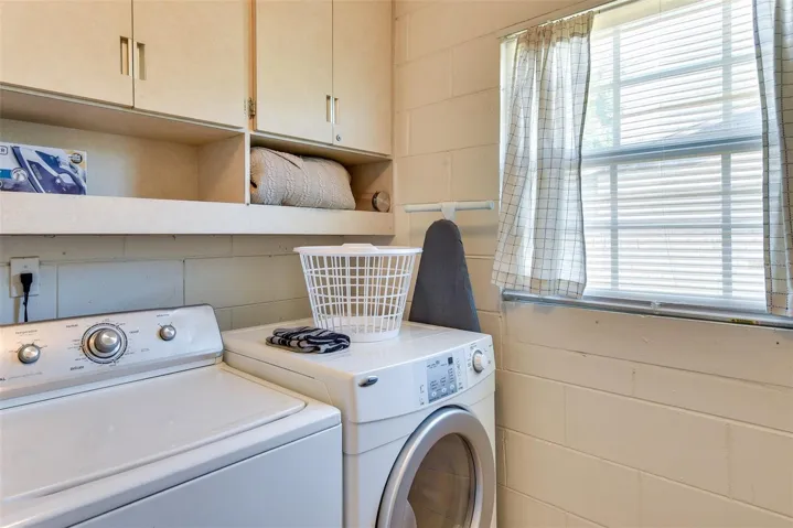 Inside, the open floor plan features ceramic tile and luxury vinyl flooring throughout. The kitchen has been upgraded with granite countertops, a custom tile backsplash, and stainless steel appliances, creating an inviting space that connects seamlessly to the dining and living areas. The primary suite includes a private bath with a modern walk-in shower, while the guest bathroom offers a classic tub and shower combination. A dedicated inside laundry room with washer and dryer adds everyday convenience.