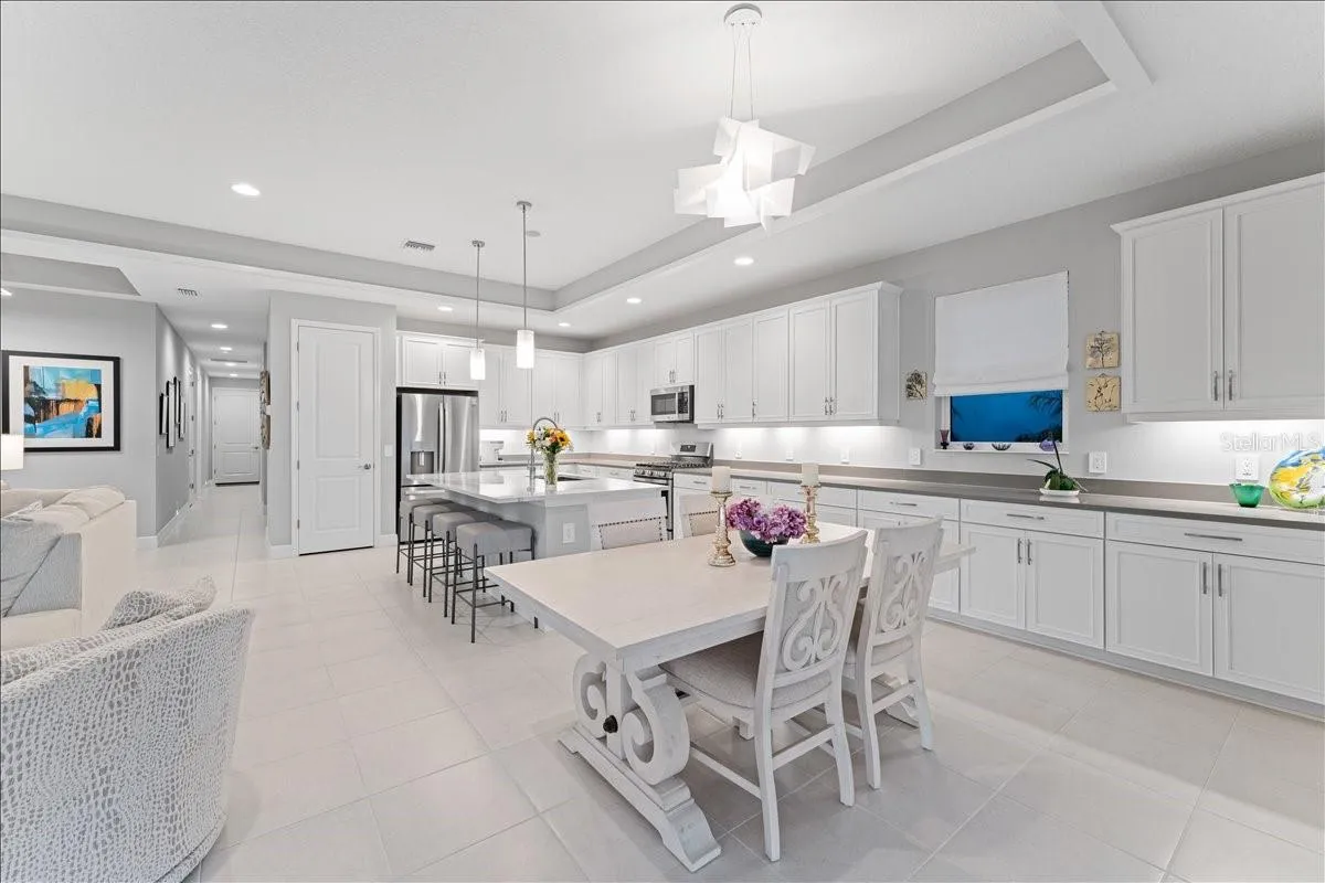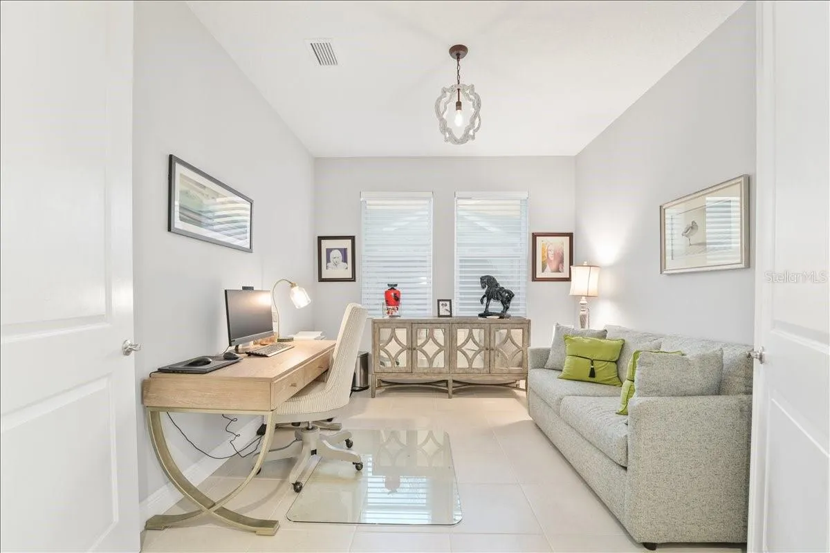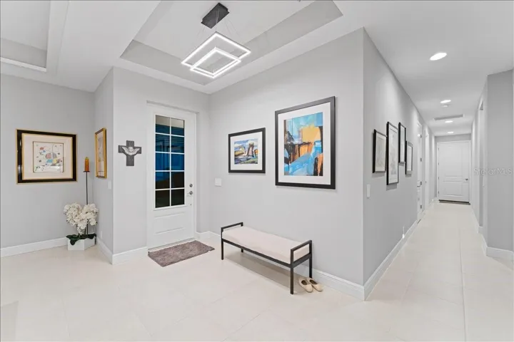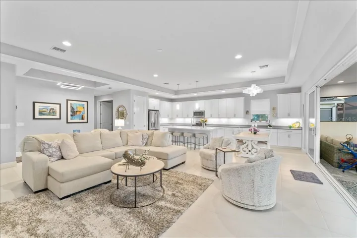 Lakefront Retreat with Sunset Views! This stunning residence combines architectural elegance with a true Florida lifestyle, framed by SWEEPING LAKE VIEWS and unforgettable sunsets. From the moment you enter, your eye is drawn to a 16-FOOT WALL OF GLASS DOORS that open the home to dramatic water vistas. The expansive great room and dining area flow seamlessly to the private lanai, creating effortless indoor-outdoor living. At the heart of the home, a chef’s kitchen features extended cabinetry, premium appliances, and a generous island designed for both casual meals and memorable gatherings. The serene owner’s suite offers a tray ceiling, sitting area, spa-style bath, and large walk-in closet. A spacious second bedroom with its own walk-in closet, along with a large den featuring French doors, provide flexibility for guests or a home office. Outdoors, the PRIVATE POOL WITH WATERFALL becomes your personal retreat. Panoramic water views across Lake Ibis create a sense of peace and connection to nature. Each evening vibrant sunsets transform the sky into a spectacular backdrop. The front of the home faces a natural common area shaded by mature oaks, adding privacy and charm. Additional highlights include IMPACT GLASS WINDOWS AND SLIDERS, tray ceilings with custom trim, and elegant details throughout. Lawn care and irrigation are included through the HOA for a maintenance-free lifestyle. Lakehouse Cove residents enjoy resort-style amenities: lakeside clubhouse, fitness center, pool and spa, pickleball, dog parks, kayak launch, and the Lakehouse Cove boathouse. Just minutes away, Waterside Place offers waterfront dining, boutique shopping, a weekly farmers market, and lively community events – bringing the best of Sarasota living to your doorstep.